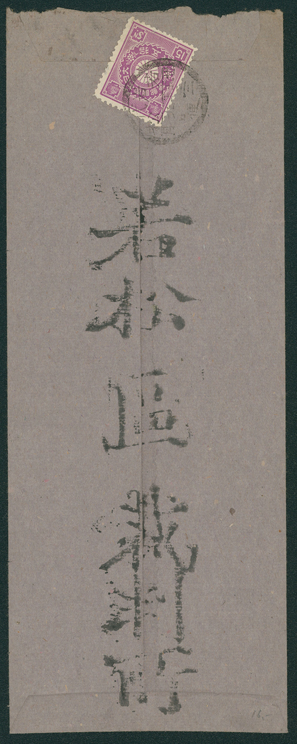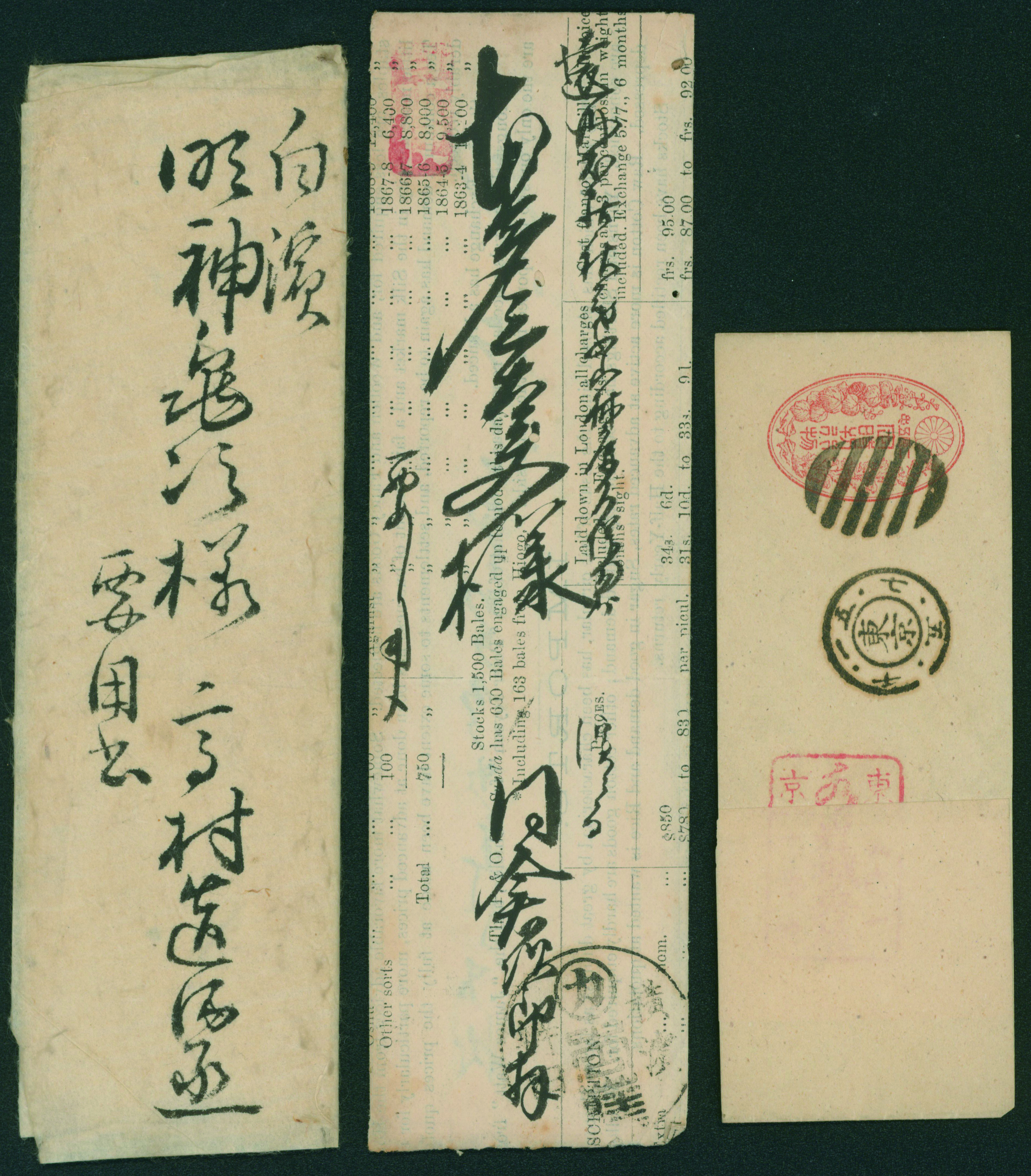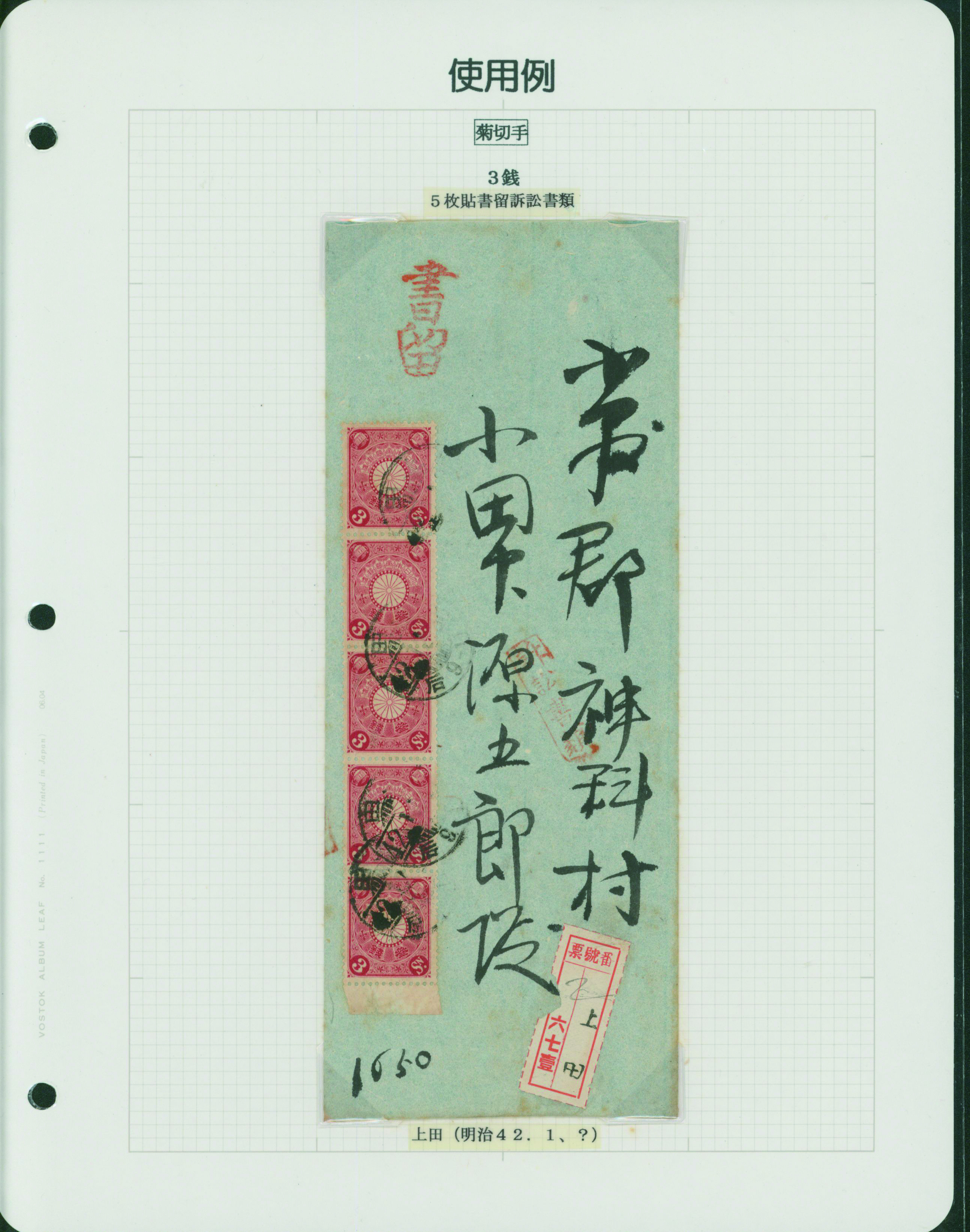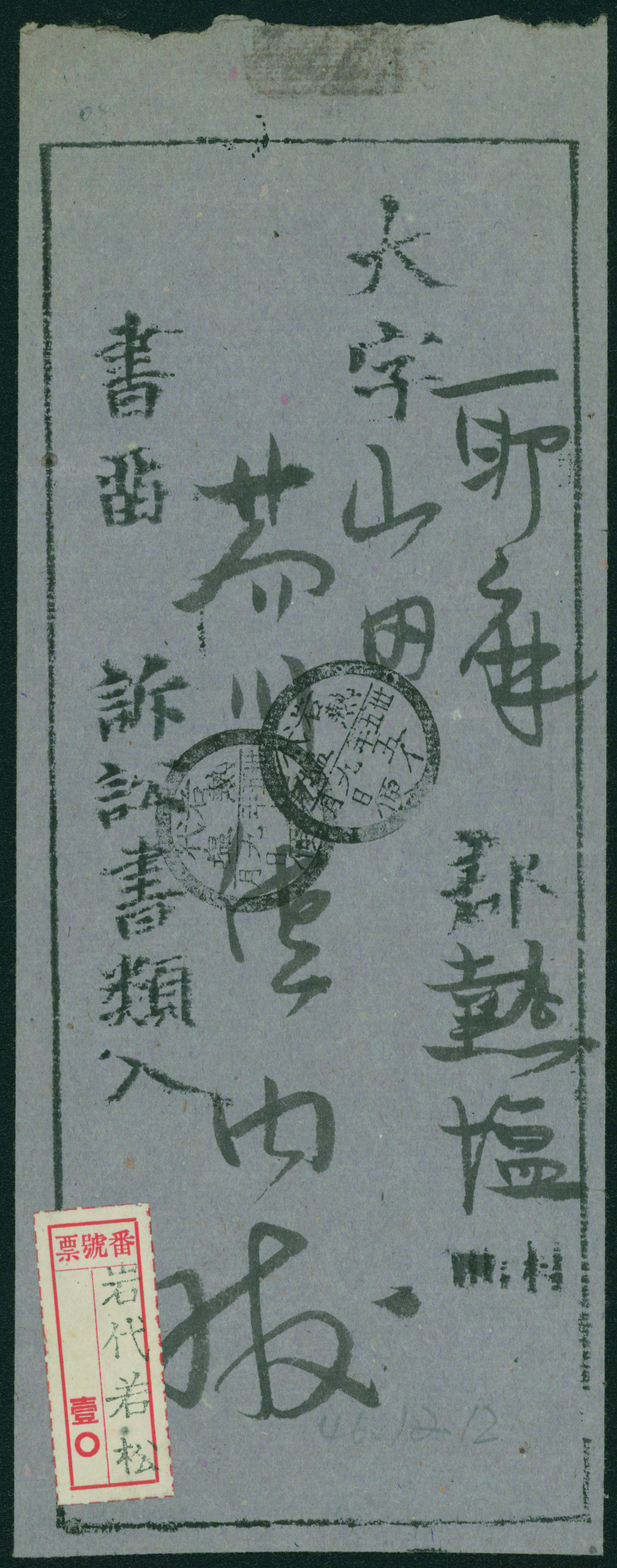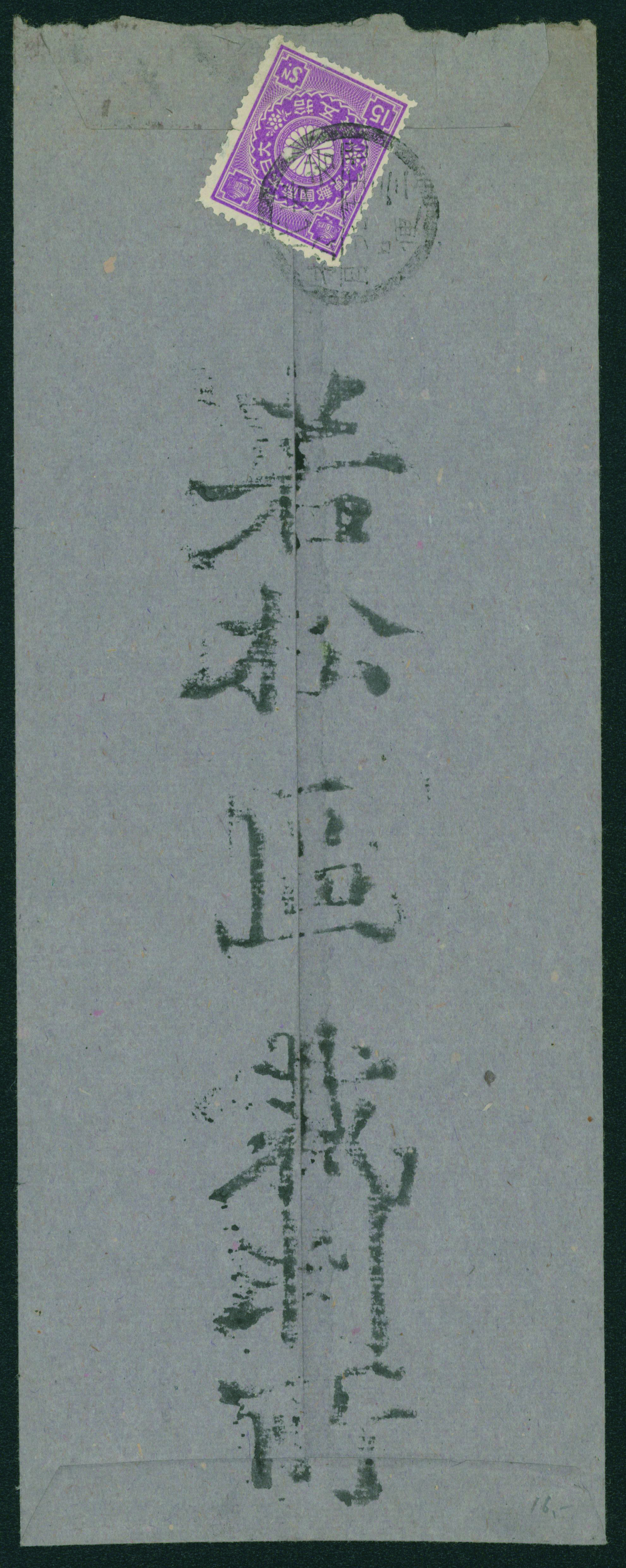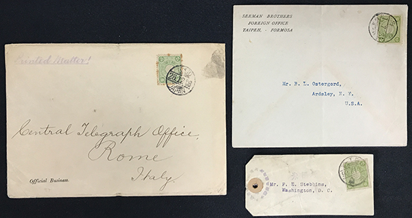 [使用例] 菊2銭 単貼り シミ 外信 カバー3通 印刷物、台北発、荷物タグ