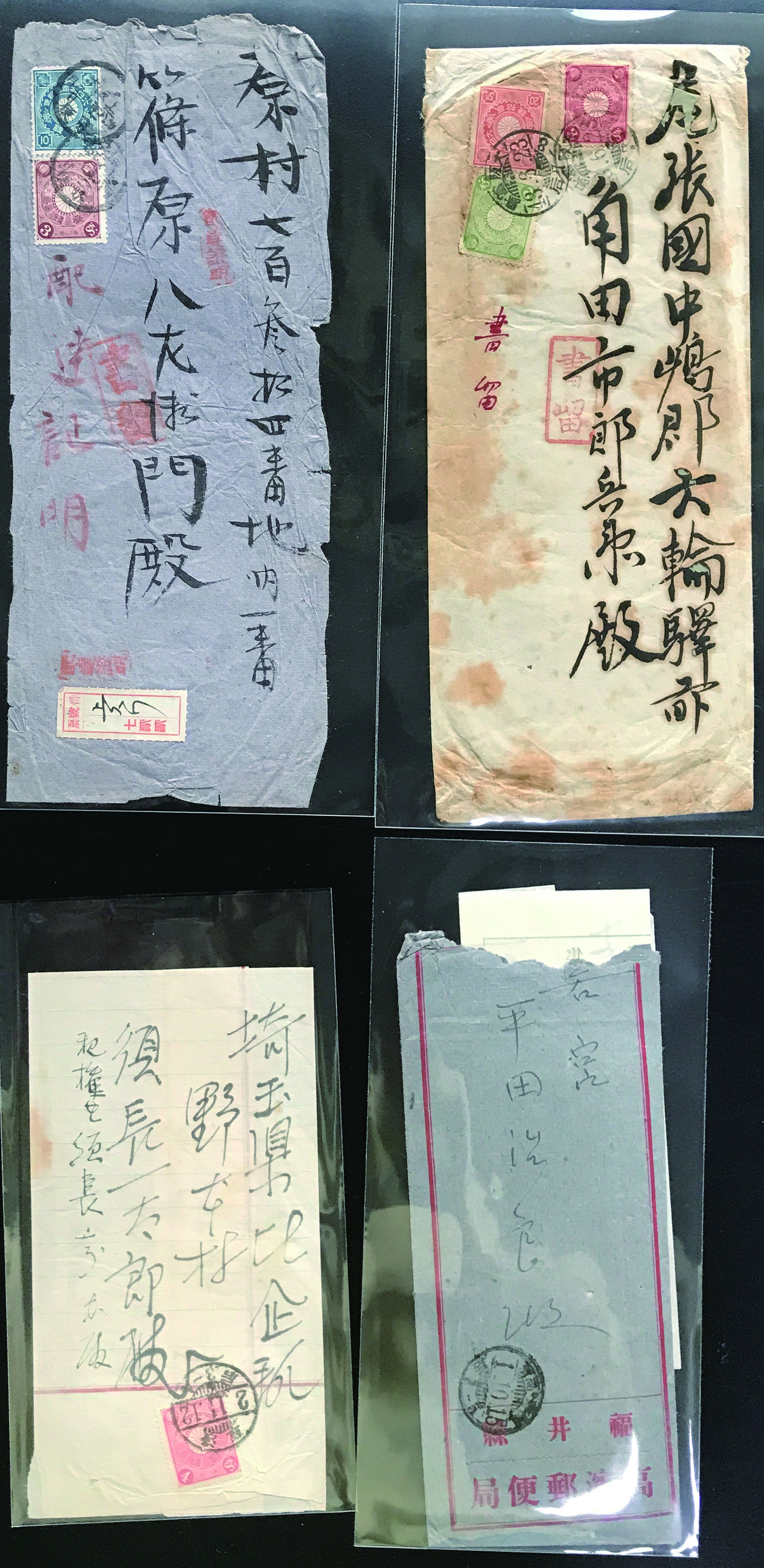 [使用例] カバー4通 菊20銭, 3銭赤, 2銭, 3銭茶, 10銭, 4銭 単貼り 混貼り(切手キズのものあり) 菊2銭単貼り 集金郵便、菊4銭単貼り 第4種重量便、などを含む カバー破れ シミ汚れ 折れ 切手キズ等の難あるものあり