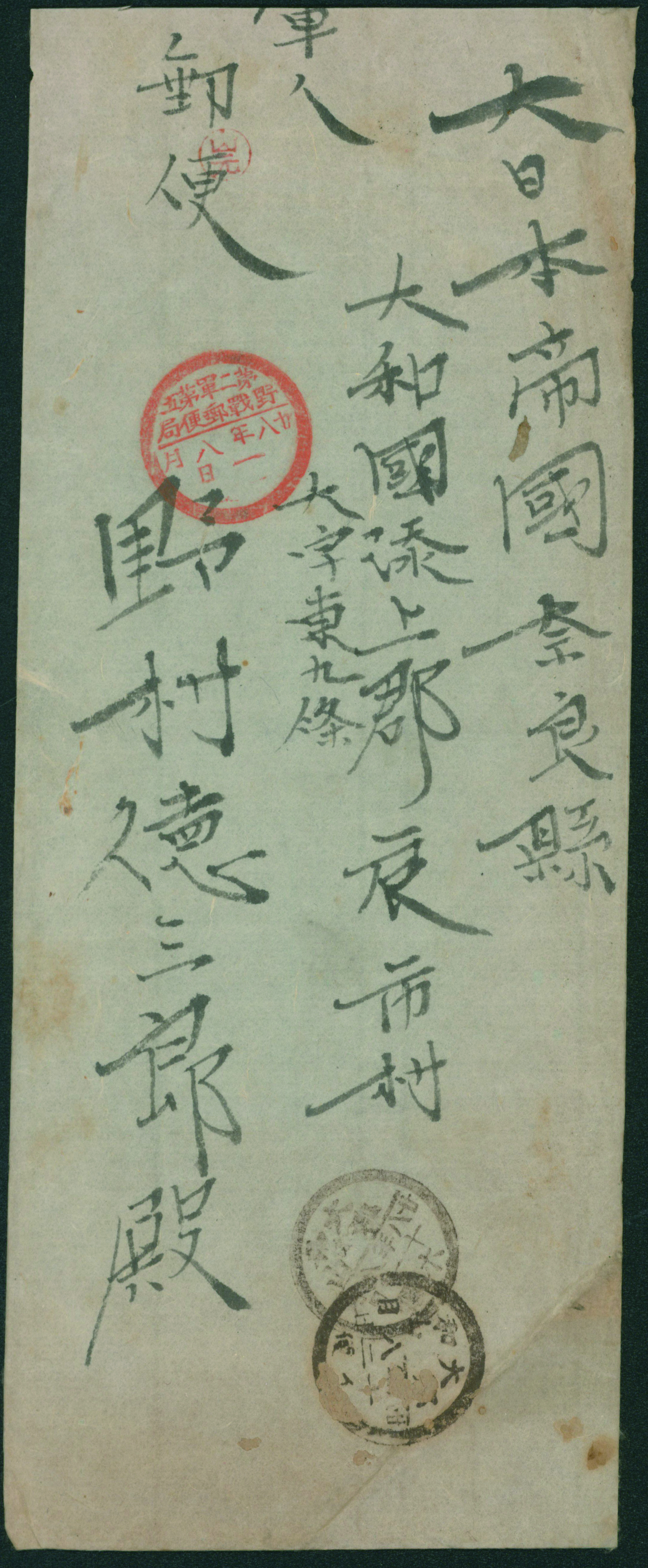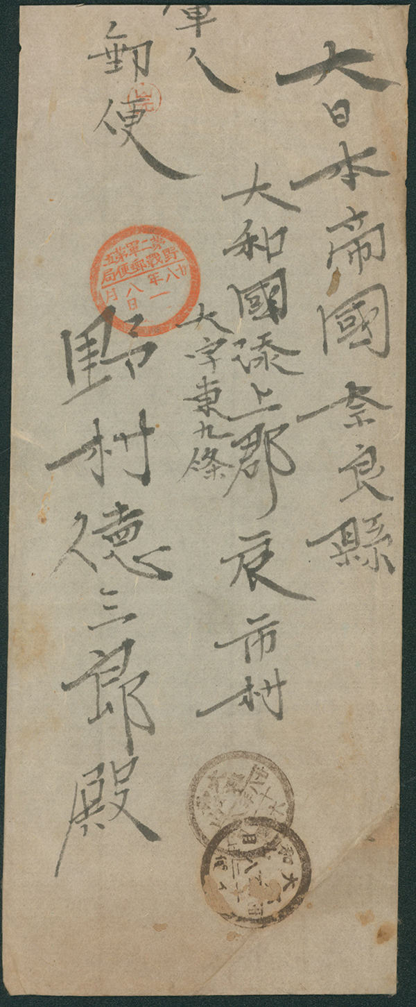 [使用例] スタンプレス 丸一印(朱) 明治28 8 1 第二軍第五 野戦郵便局→大和郡山 到着印:8/12 日清戦争 軍事郵便 カバー汚れ 中身入り