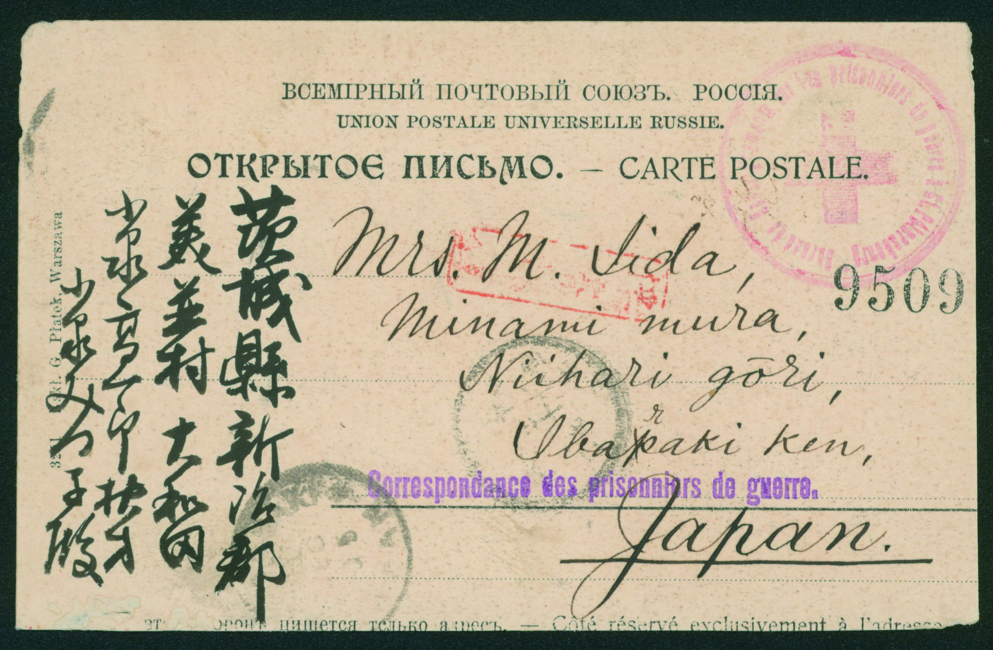 [使用例] 日露戦争 日本人俘虜差出し 捕虜郵便はがき 明治38 7 18 ロシア→茨城 ワルシャワの風景の 絵葉書 カタログ価:100,000円