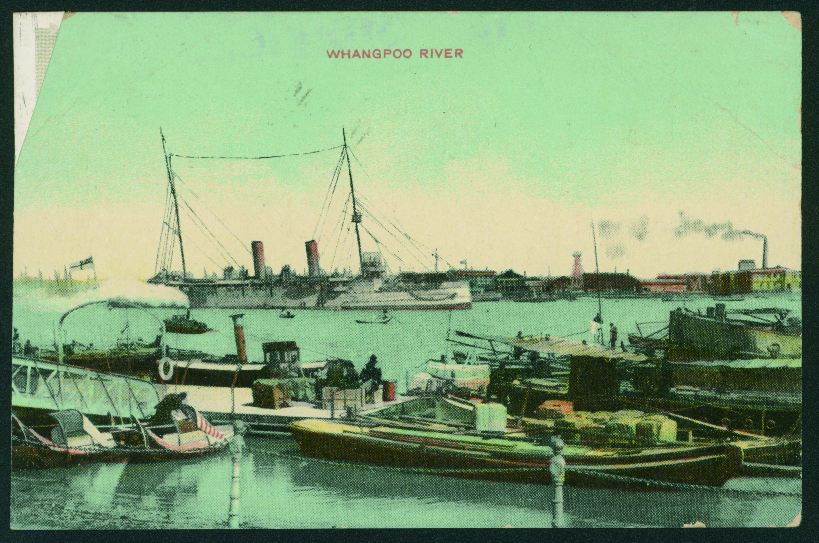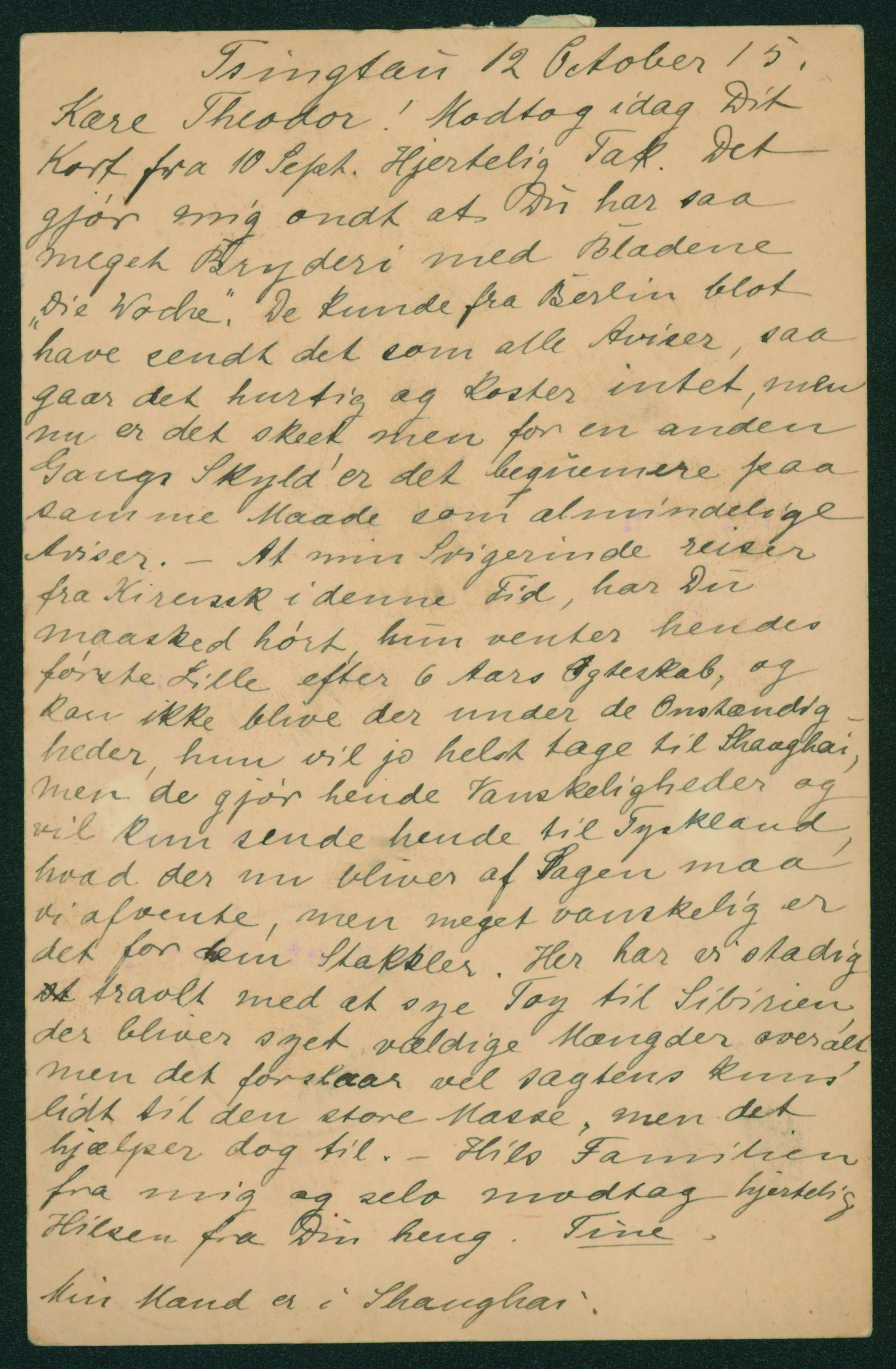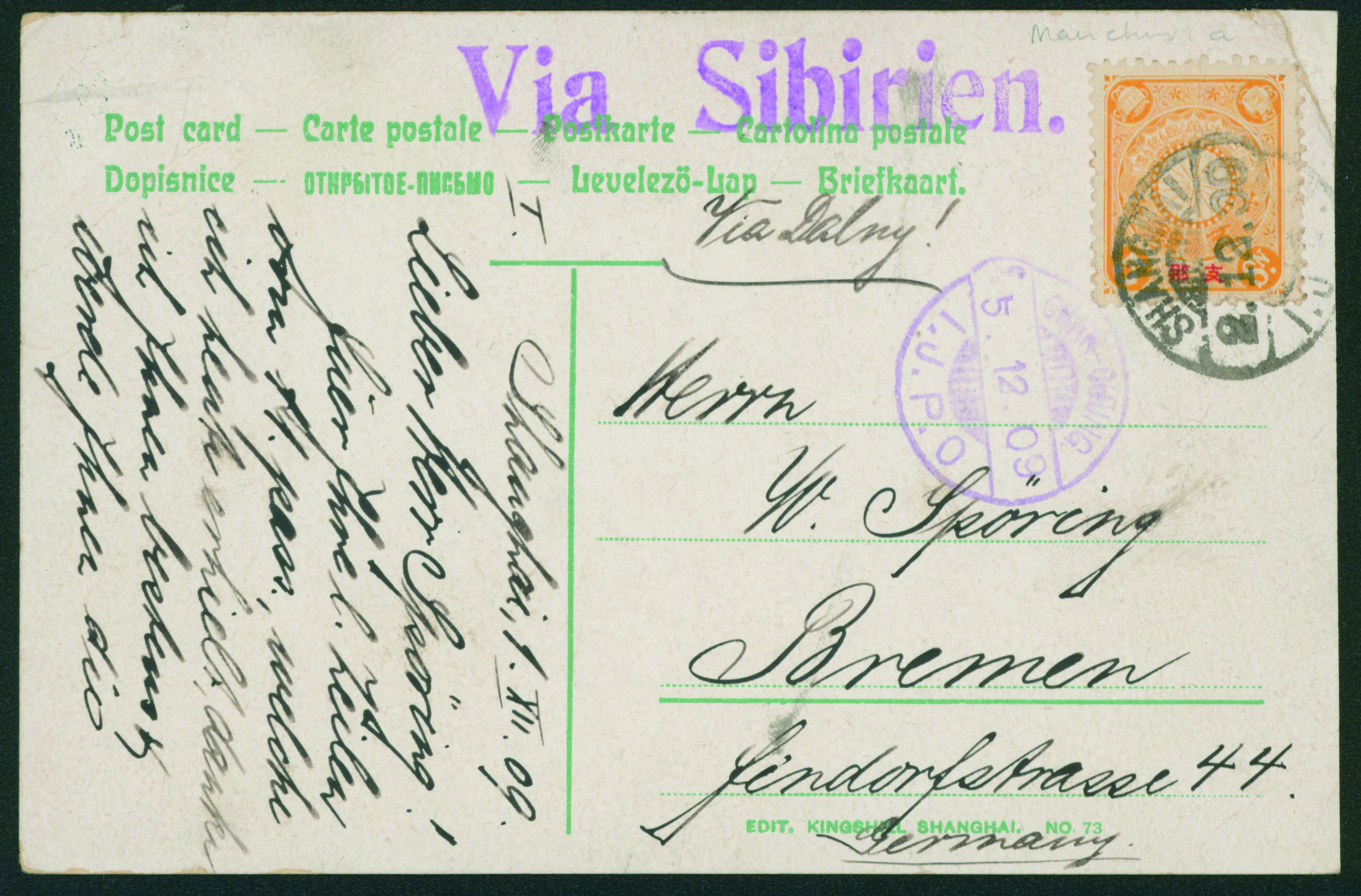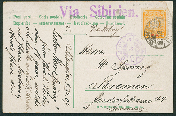[使用例] 支那字入菊5銭 単貼り 1909-12-02 SHANGHAI→CHANGCHUN→ドイツ 外信船便葉書 カバー補修