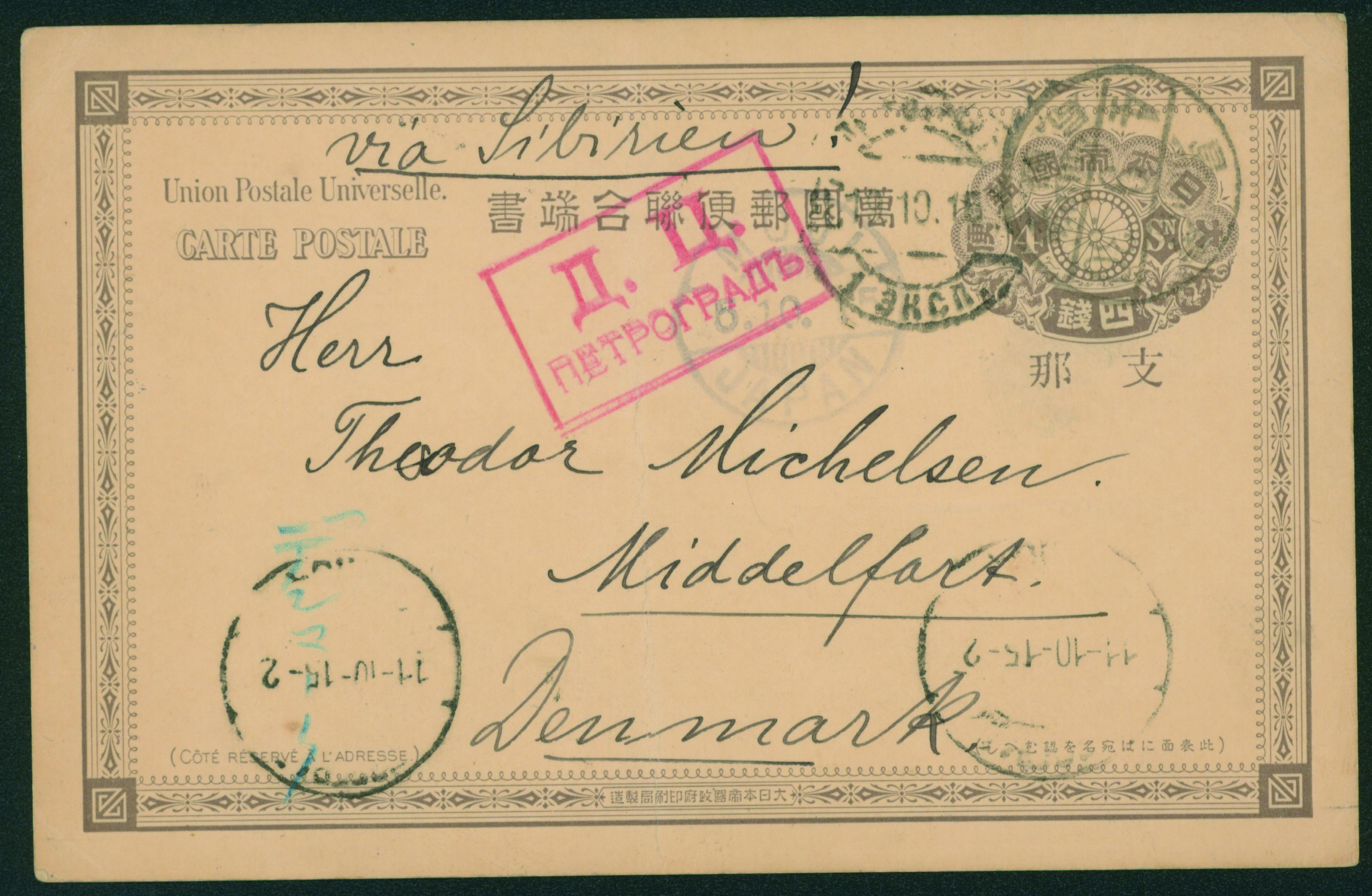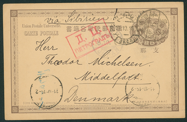 [使用例] 支那字入4銭薄墨連合葉書 櫛型印 大正4 9 30 青島/野戦局 →MOJI→デンマーク 外信船便葉書 検閲あり (露・ペトログラード)中折れ