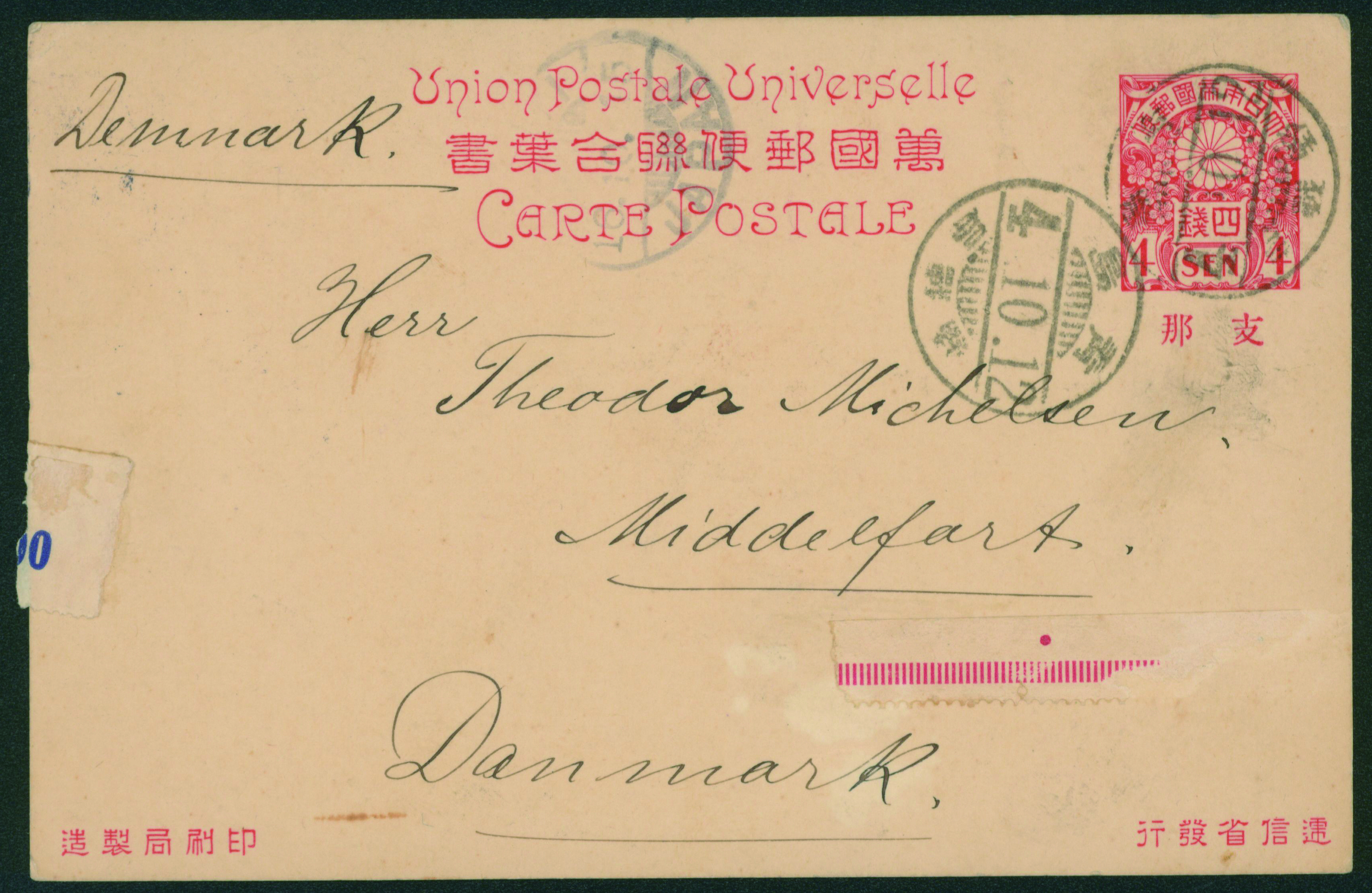[使用例] 支那字入4銭桜連合葉書 櫛型印 大正4 10 12 青島/野戦局 →デンマーク 付箋跡