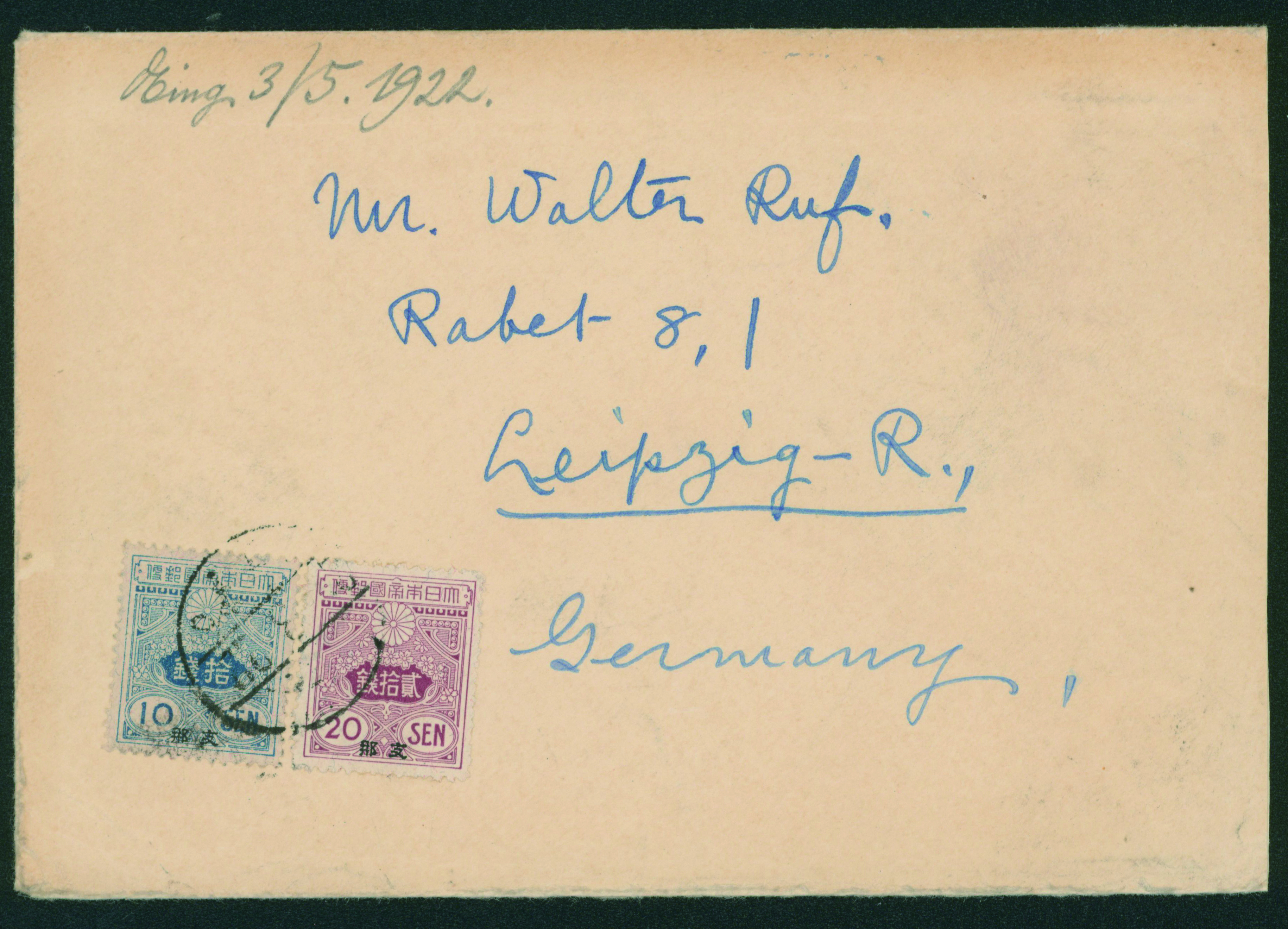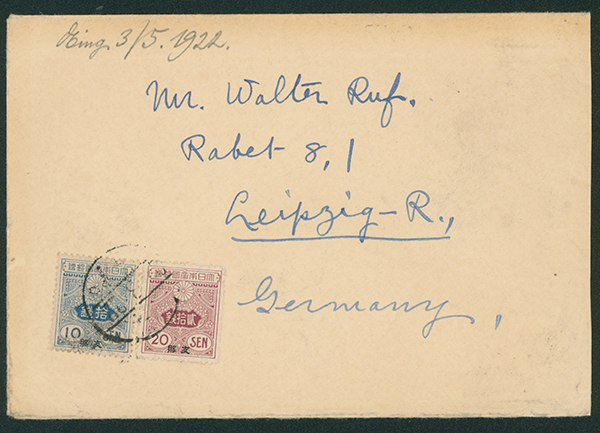 [使用例] 字入旧毛10銭, 20銭 欧文櫛型印 1922-03-? ドイツ宛て 20銭料金は1922年1月1日からの1年間のみの料金。重量便加算はさらに希少 外信船便書状重量便 消印不鮮明 30=20+10
