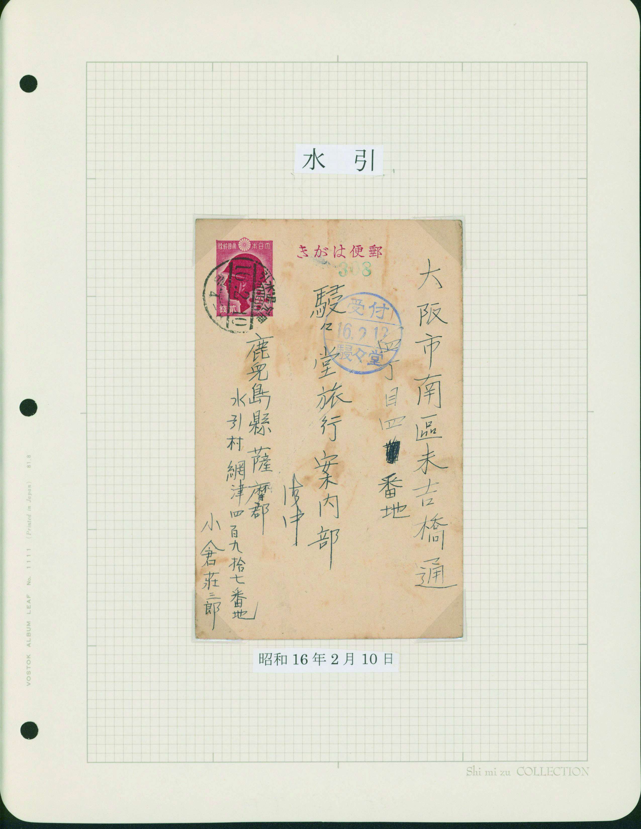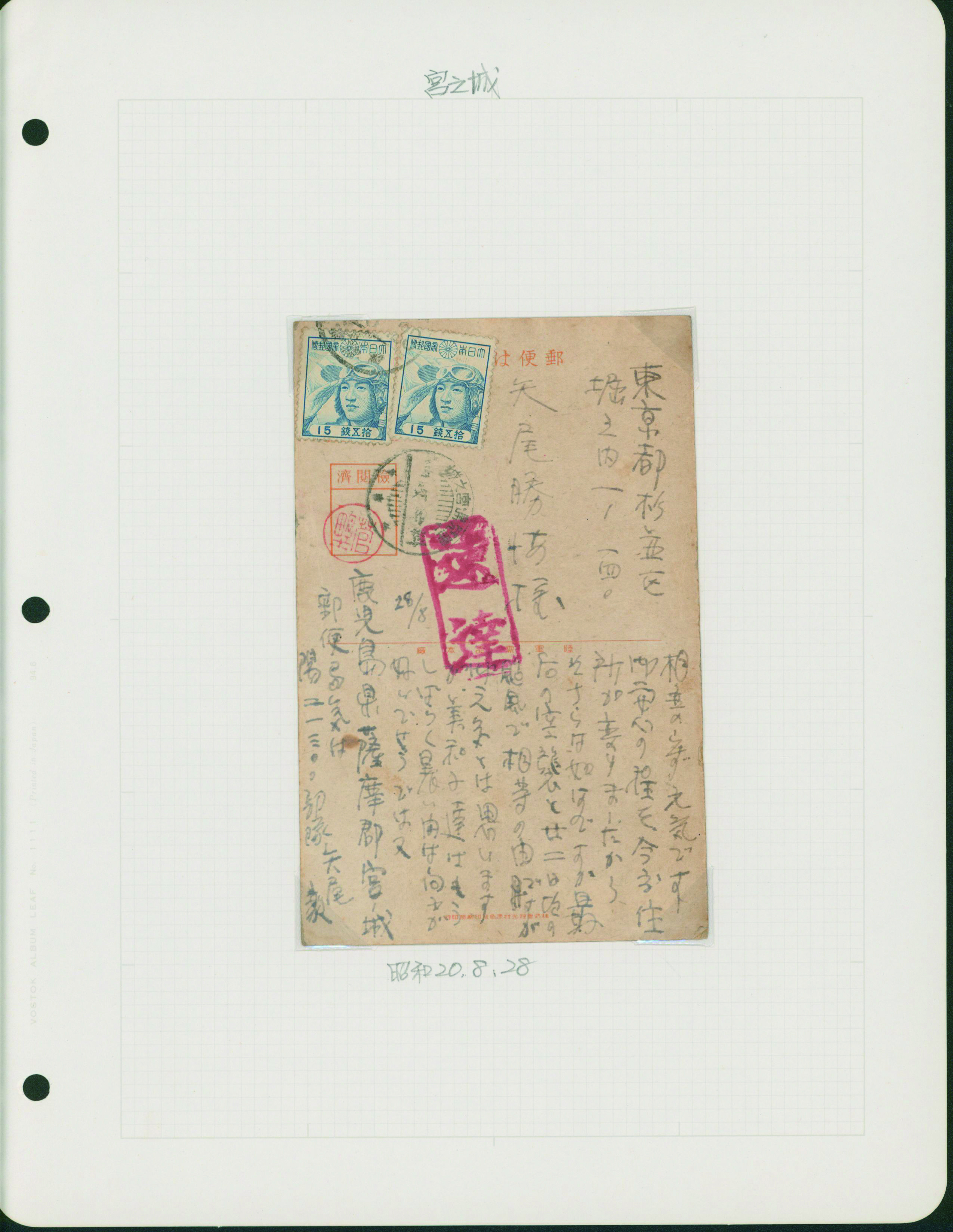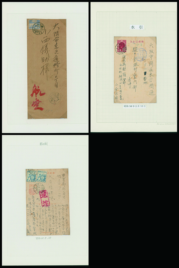 [使用例] 鹿児島使用例 カバー2通 葉書1枚 芦ノ湖18銭, 航空兵15銭, 戦傷病者葉書2銭 櫛型印 カバー薄汚れ