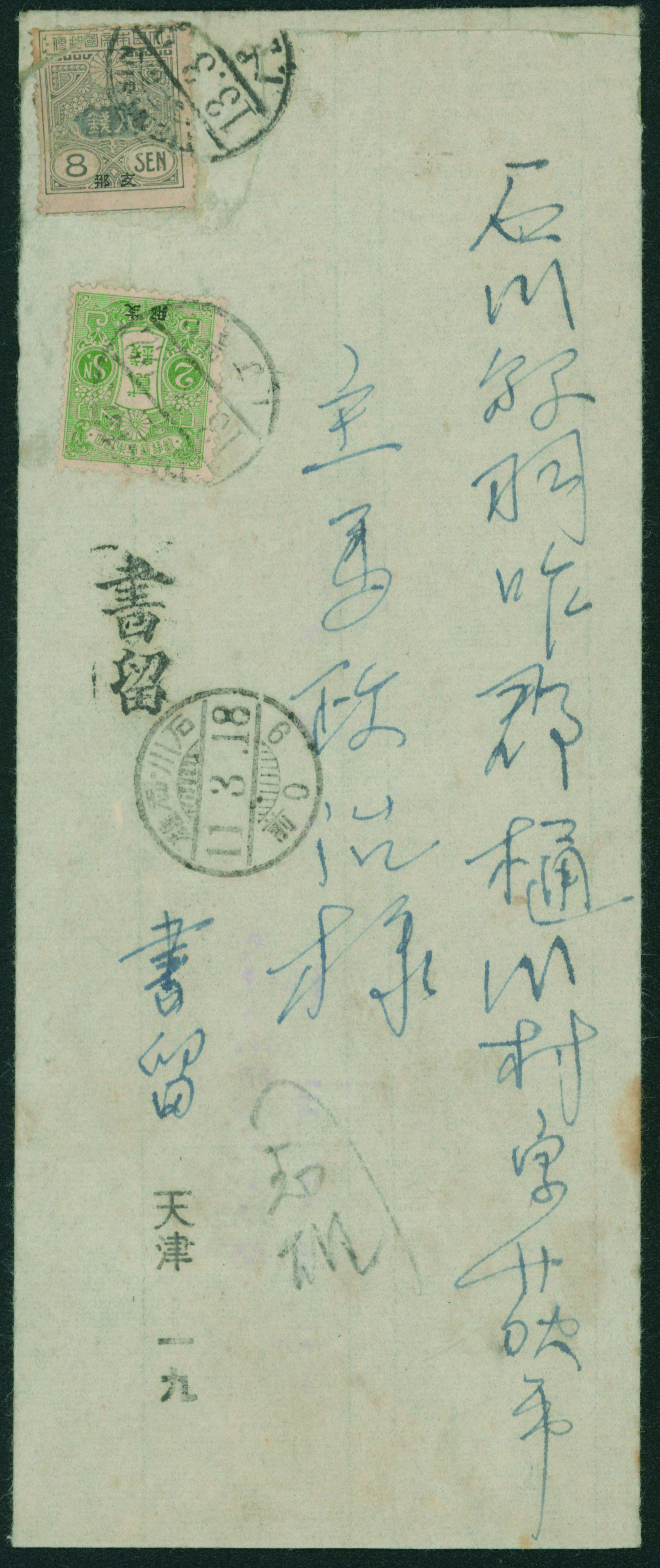 [使用例] 字入旧毛2銭, 8銭 切手補修 欧文櫛型印 1922-03-13 TIENTSIN→石川 到着印:志雄 書状書留 カバー補修