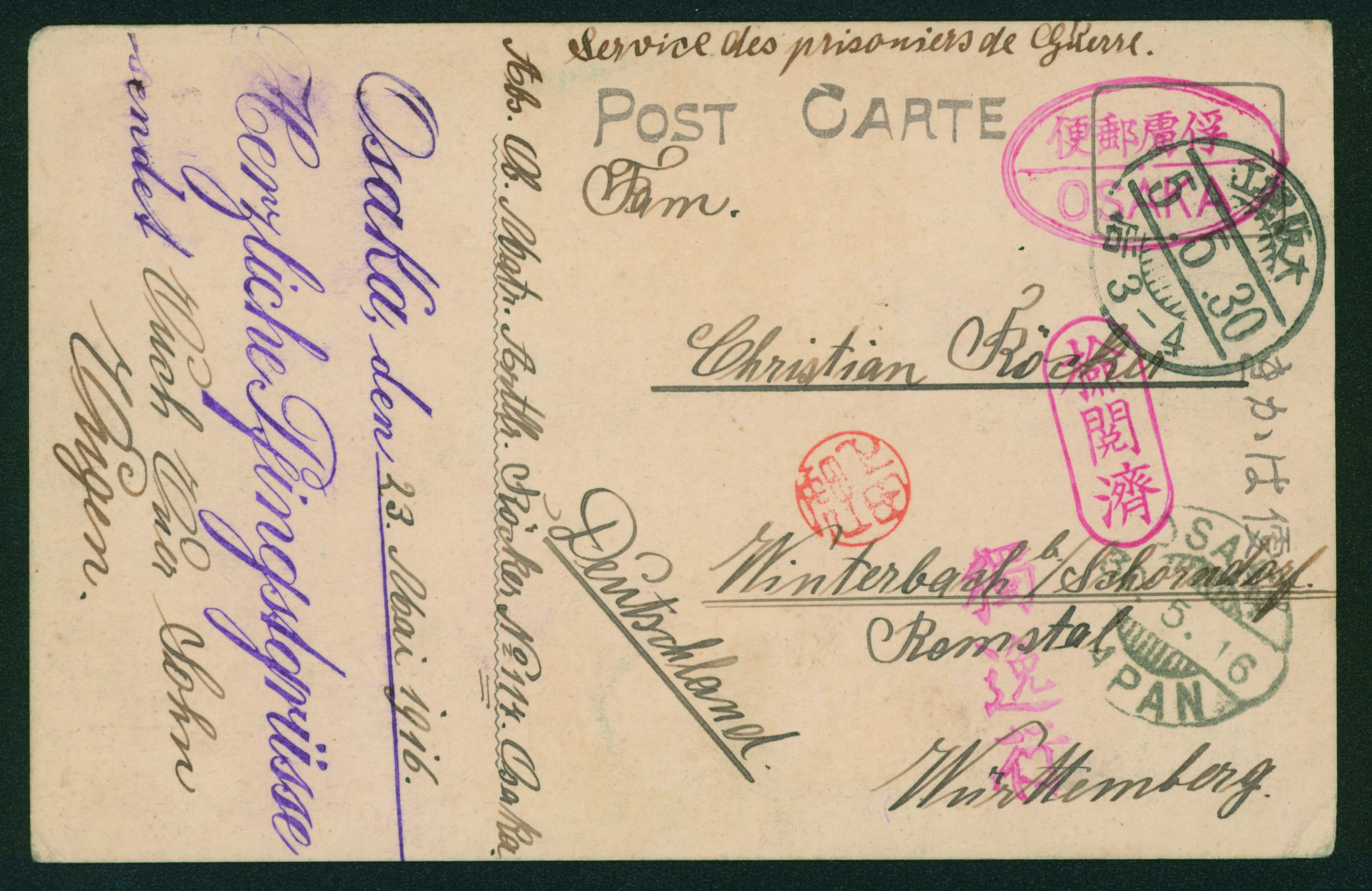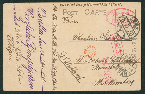 [使用例] 第一次世界大戦 捕虜郵便はがき 櫛型印 大正5 5 30 大阪堀江→OSAKA→ドイツ 楕円俘虜郵便印OSAKA 検閲あり