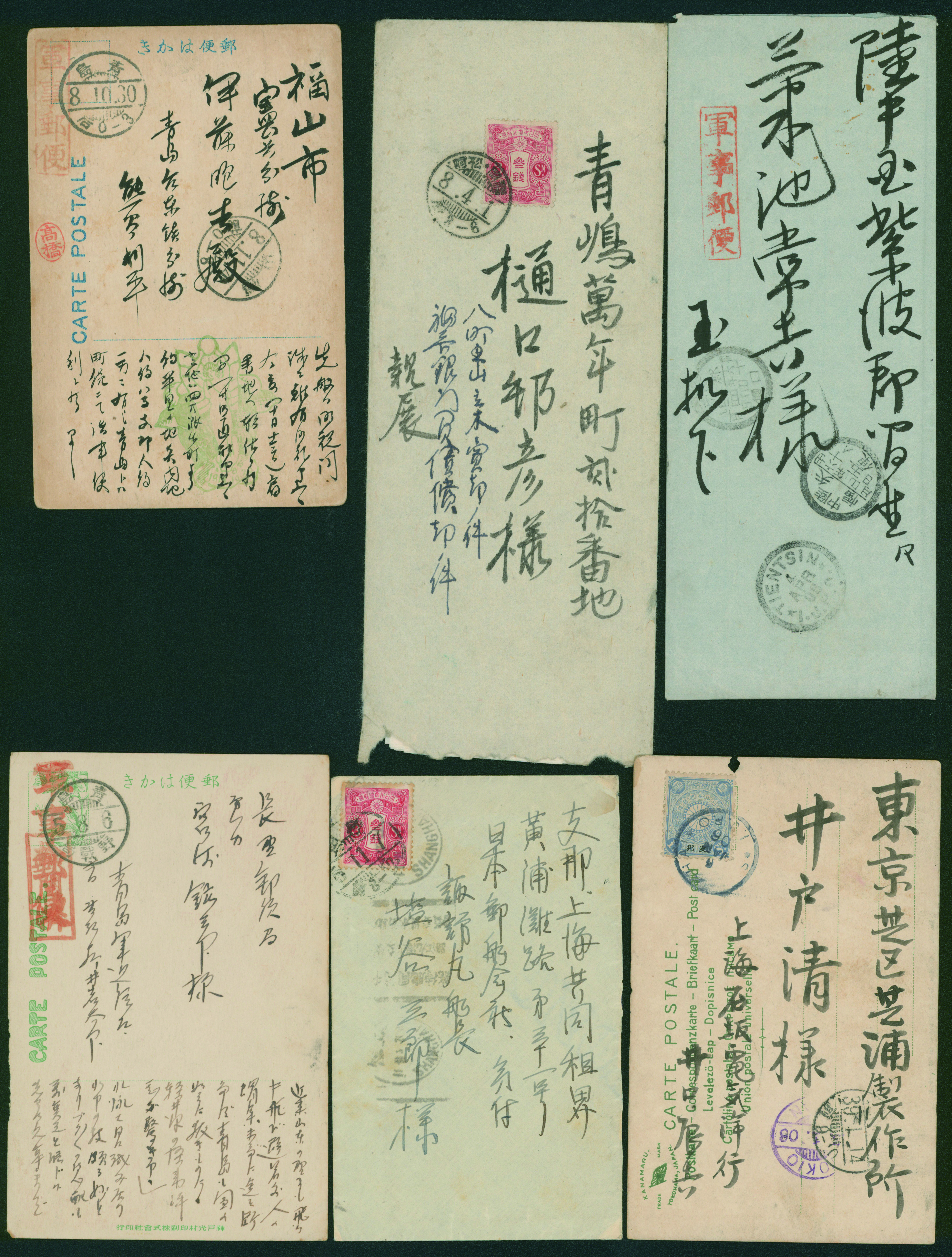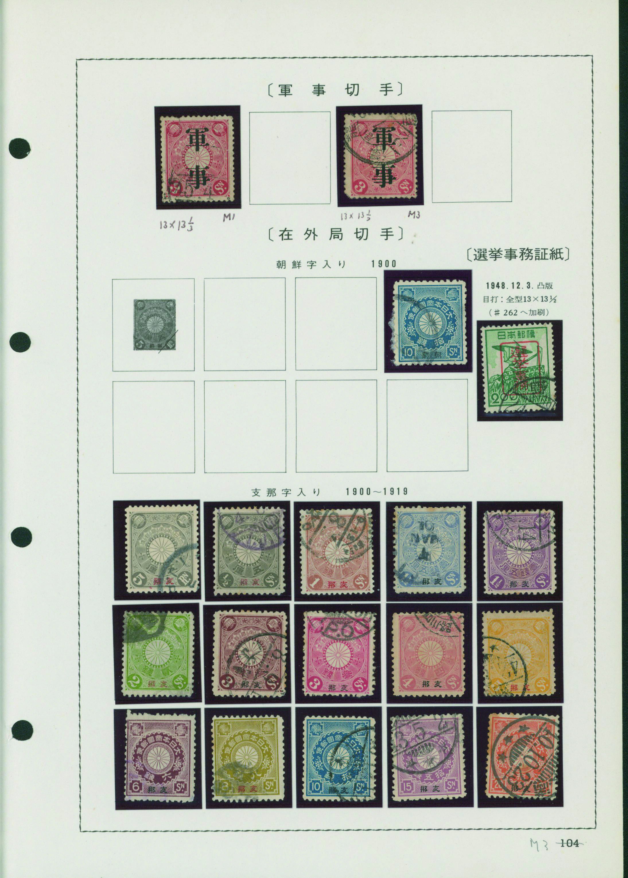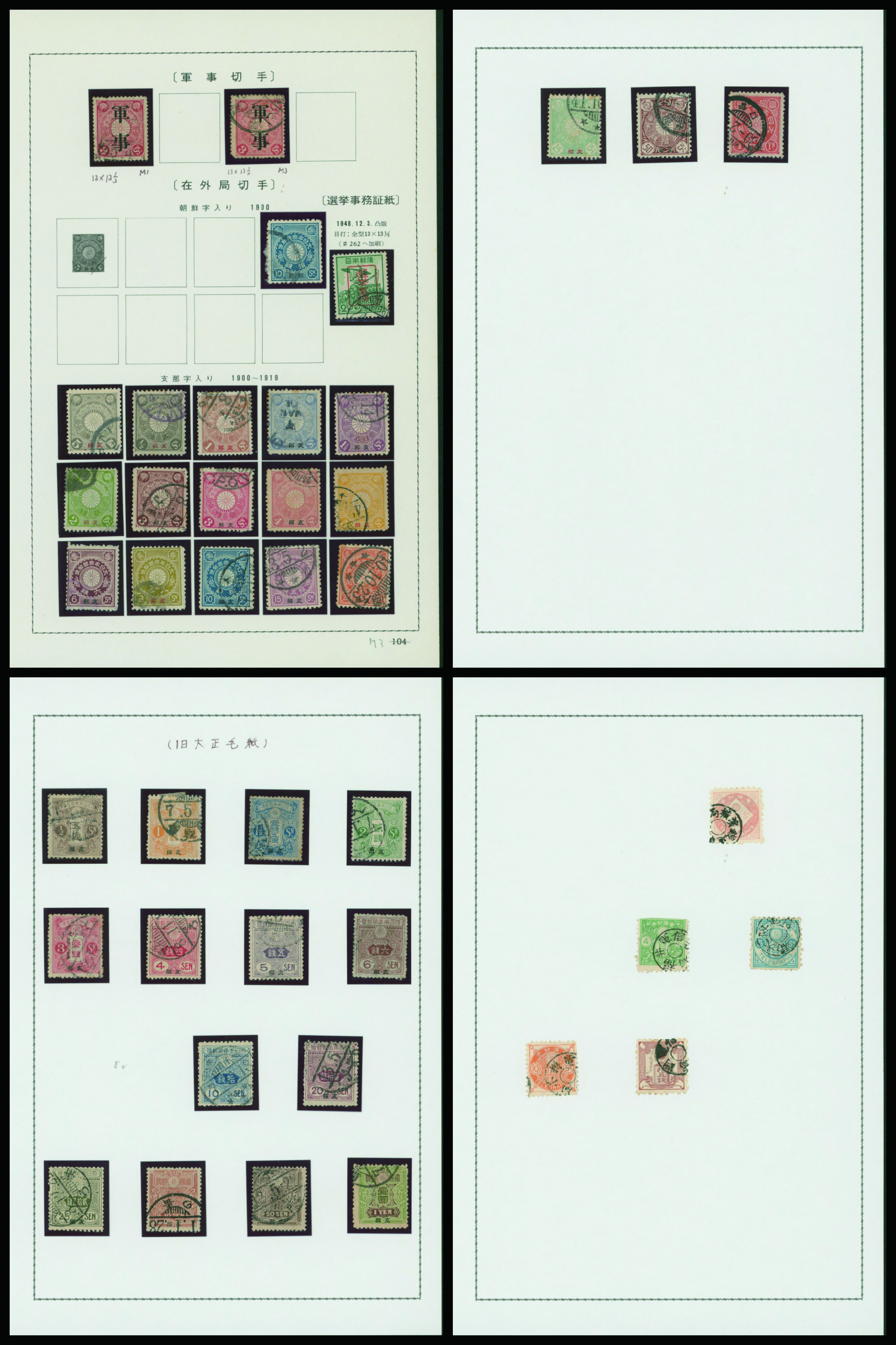 [済] 切手40枚 菊軍事2枚, 朝鮮字入10銭, 支那字入菊6銭, 8銭, 字入旧毛6銭, 30銭, 50銭 など 済 支菊は全種、旧毛10銭は無加刷
