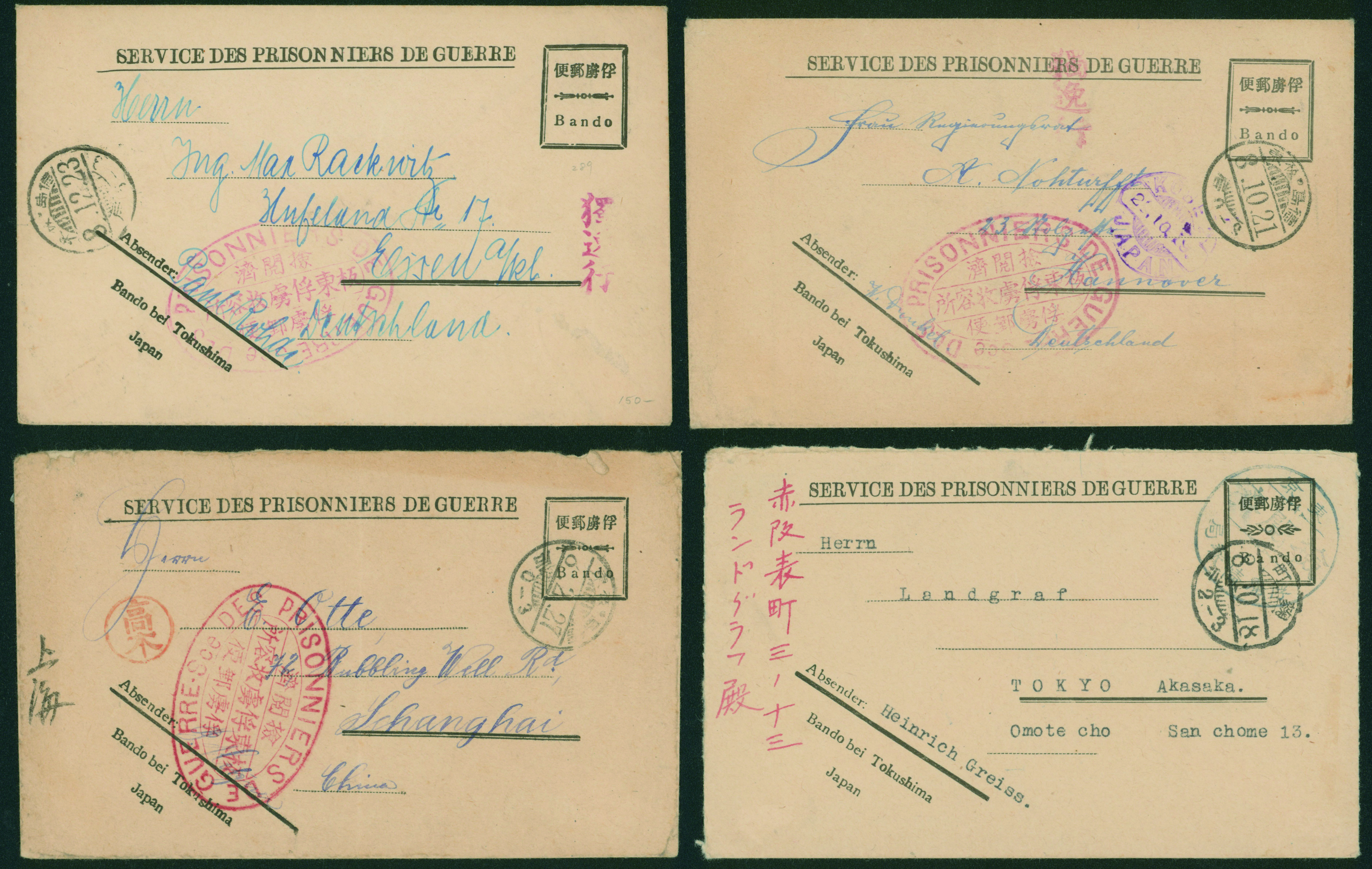 [使用例] 第一次世界大戦 俘虜郵便 カバー4通 大正8 内3通が坂東収容所 検閲あり