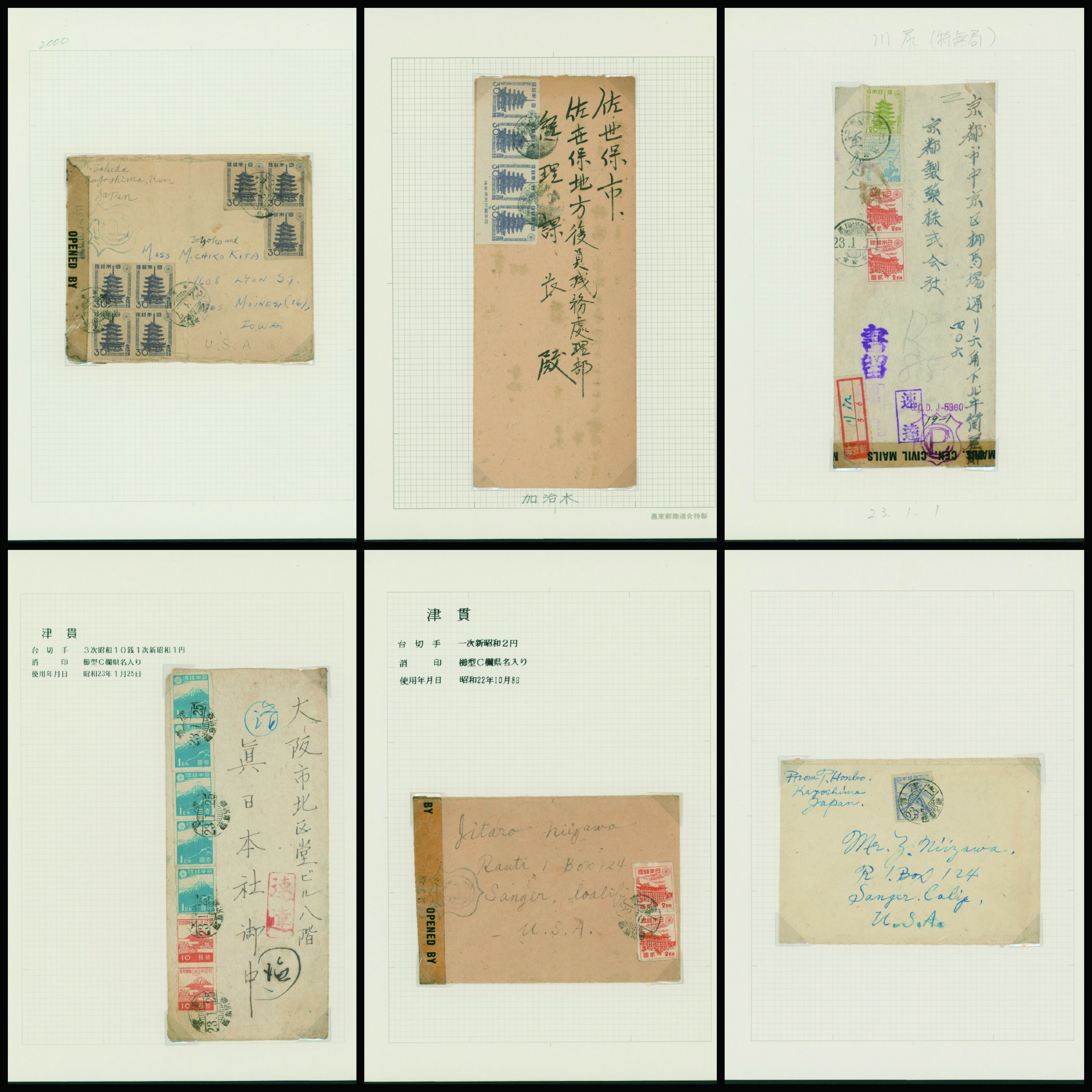 [使用例] [Accumulation] 新昭和切手 鹿児島使用例(外信含む)ロット カバー8通 五重塔30銭無目打, 清水寺2円無目打, 富士1円薄青, 落雁図4円, 清水寺2円目打あり など