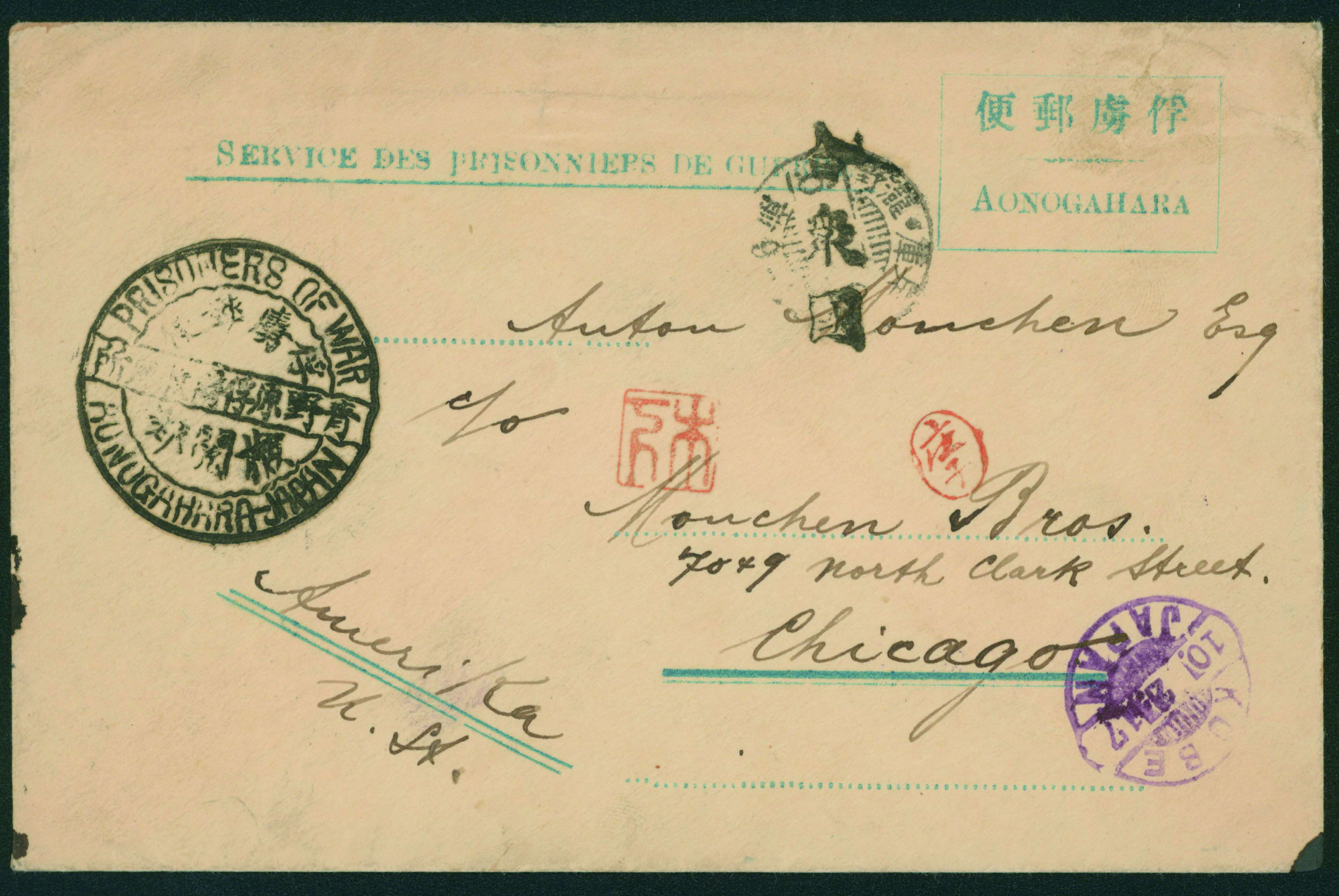 [使用例] 第一次世界大戦 俘虜郵便 櫛型印(黒) 大正6 2 ? 龍野→KOBE 2-10→シカゴ 青野原俘虜収容所 検閲あり