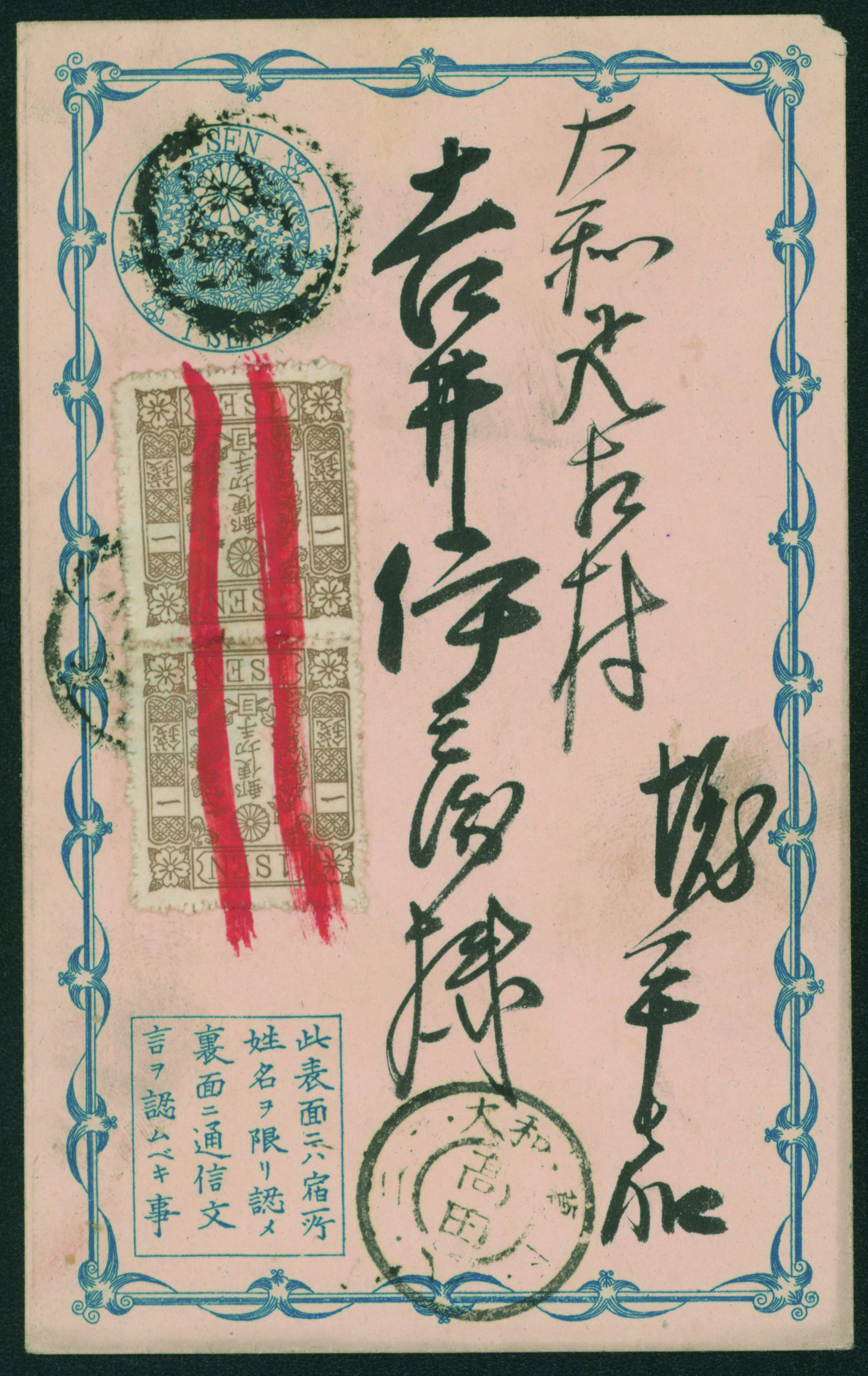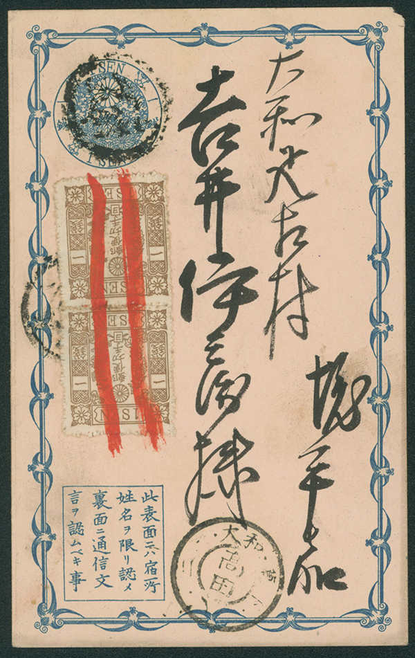 [使用例] 小型葉書1銭 カナなし, 改色桜1銭茶カナ ヨ ペア 記番印 高田宛て 持込税不足