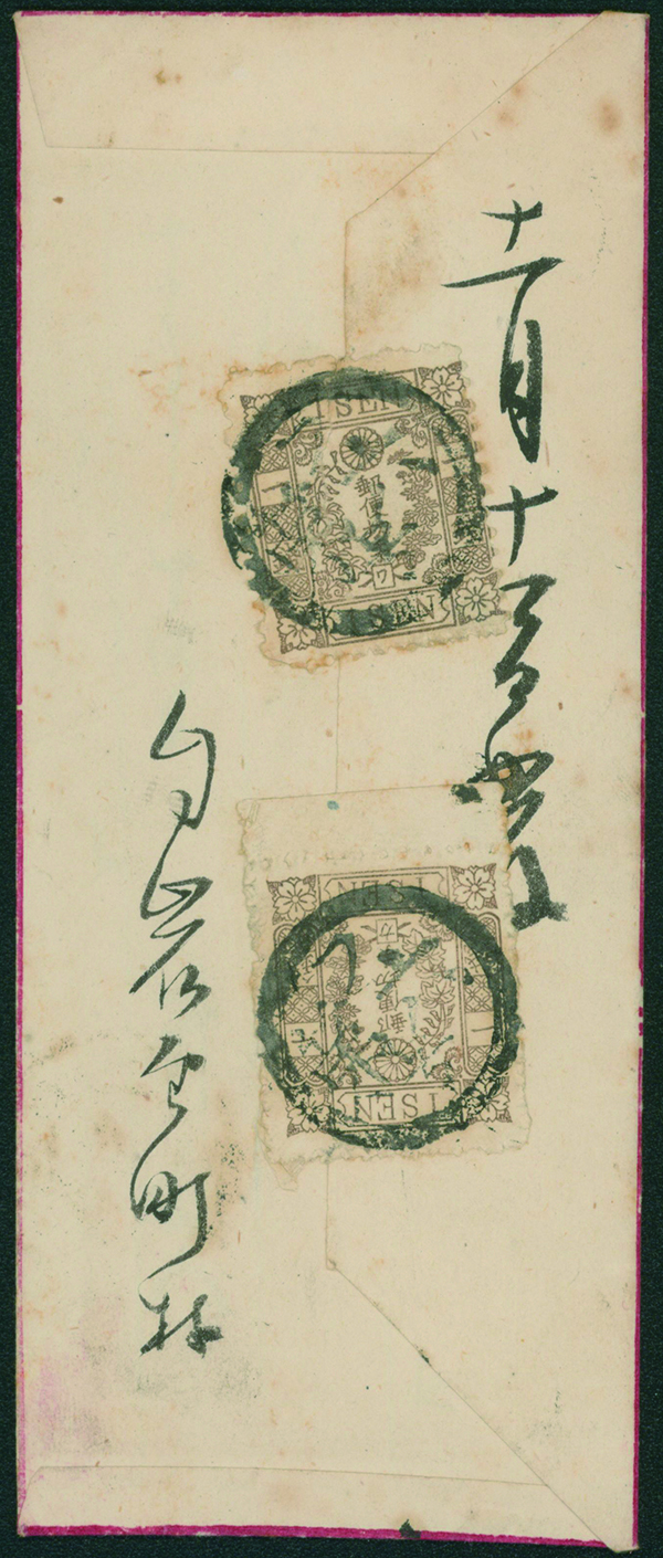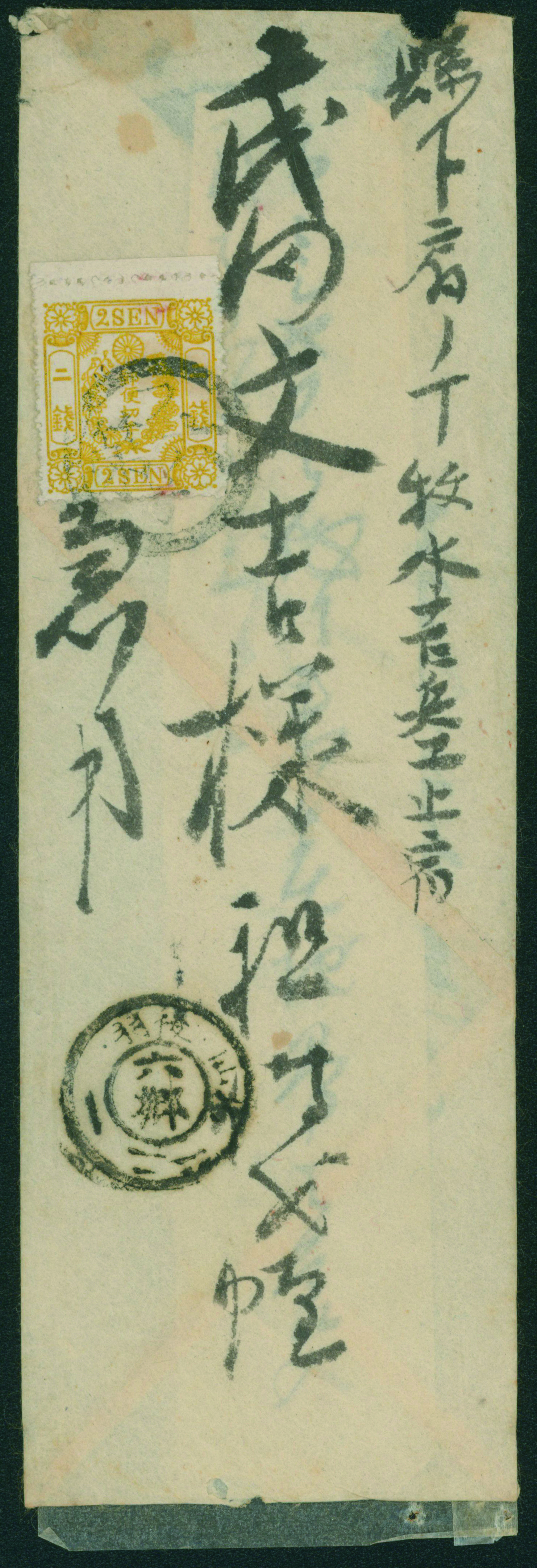 [使用例] 房2銭 単貼り 白抜記番印(子一) 明治8 11 21 大阪→東京,11/24→秋田