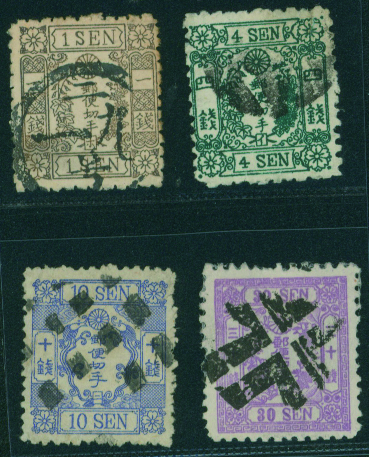 [済] 切手4枚 改色桜1銭茶カナ ホ 済 記番印(ニ19号) 4銭緑カナ, 10銭青カナ, 30銭紫カナ