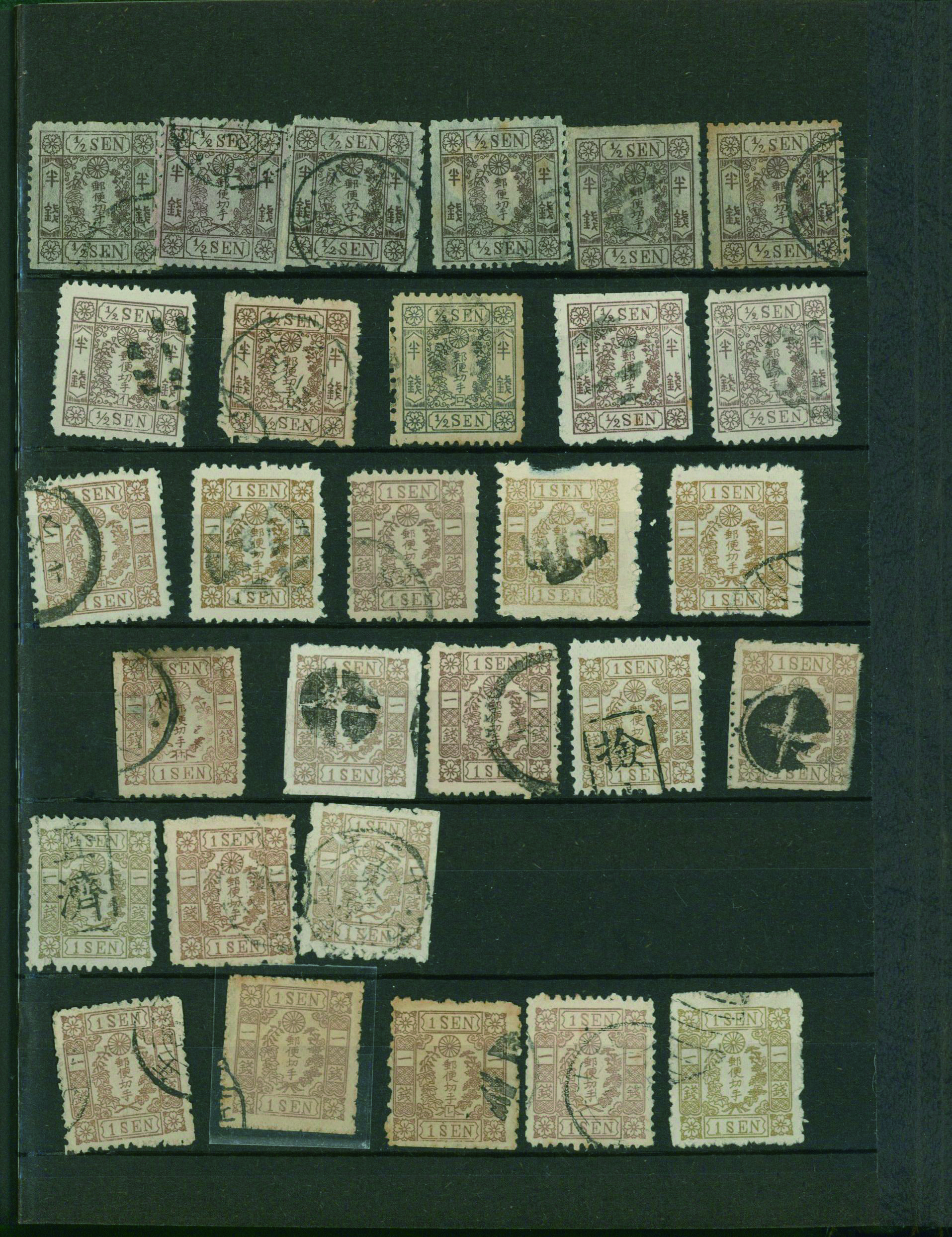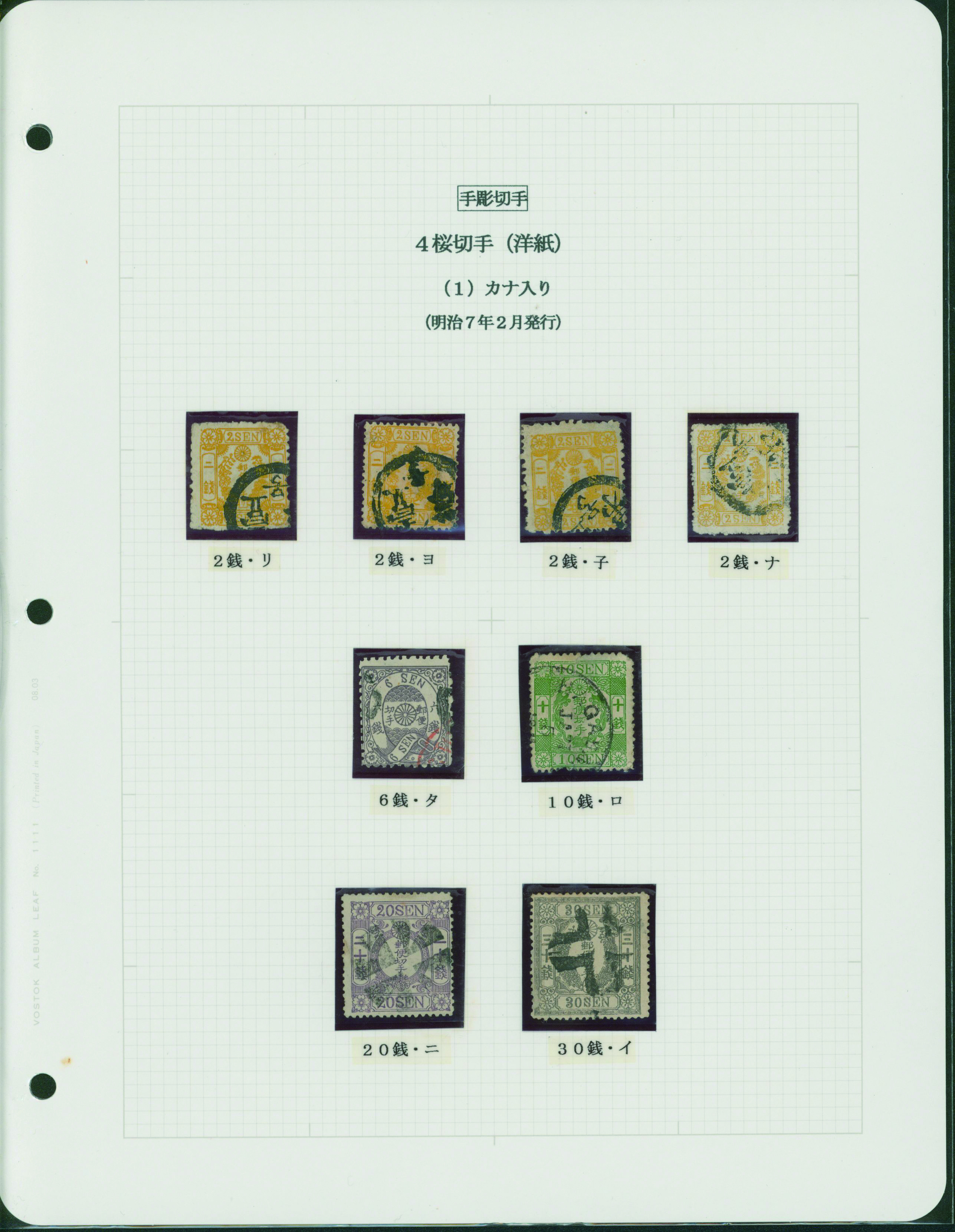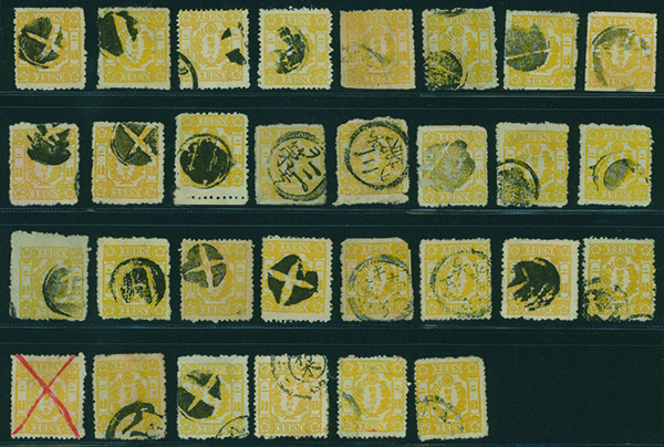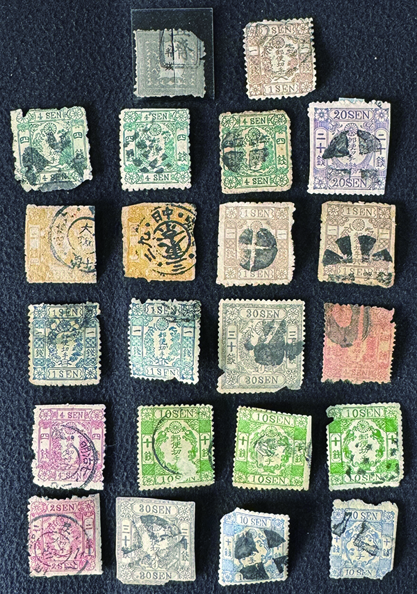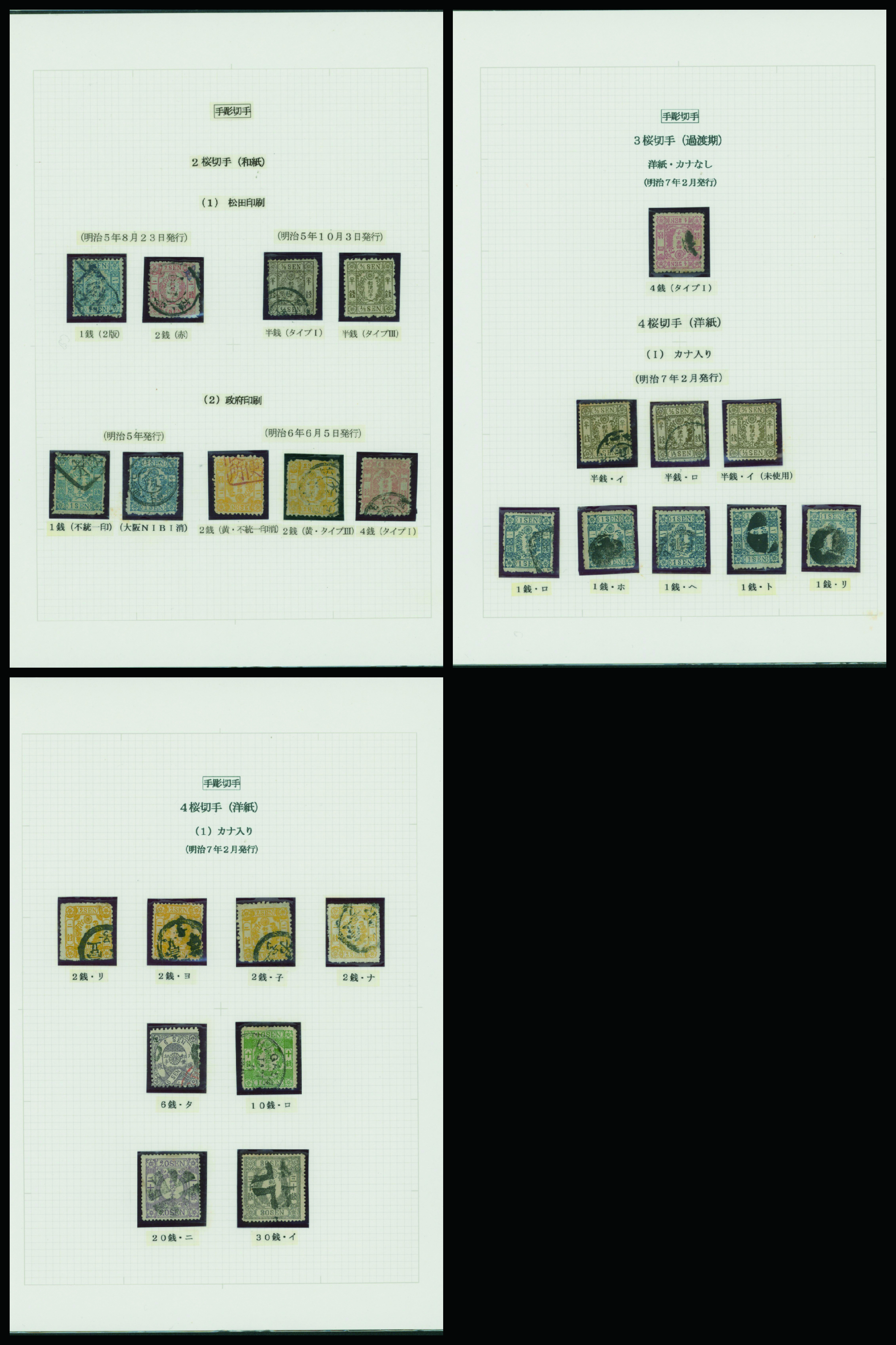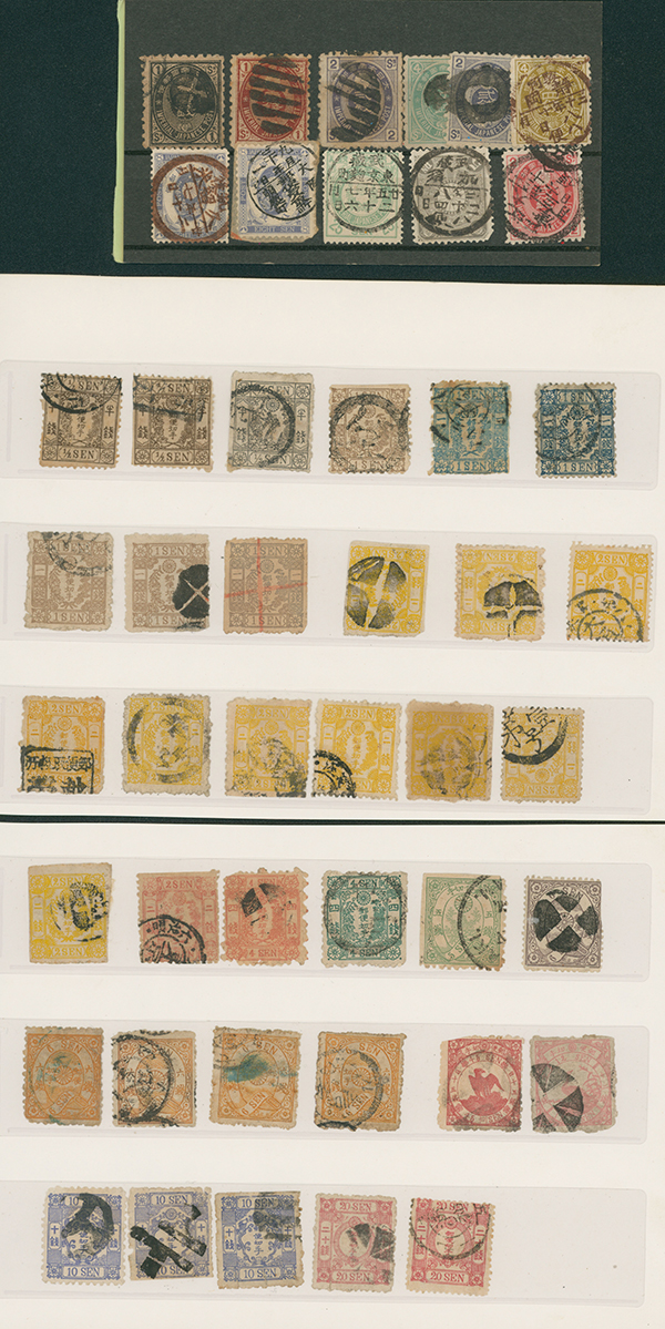[済] 和桜松田半銭, 政府1銭, 政府2銭赤, 4銭, 洋桜1銭青カナ, 鳥12銭, 45銭, 改色桜半銭灰カナ, 4銭緑カナ, 6銭橙カナ, 10銭青カナ, 20銭赤カナ, ネギ5銭, 新小判8銭 など 済 35枚 多くが状態悪い手彫・桜切手24枚と、 満月印消しなど印影良好な小判・菊切手11枚