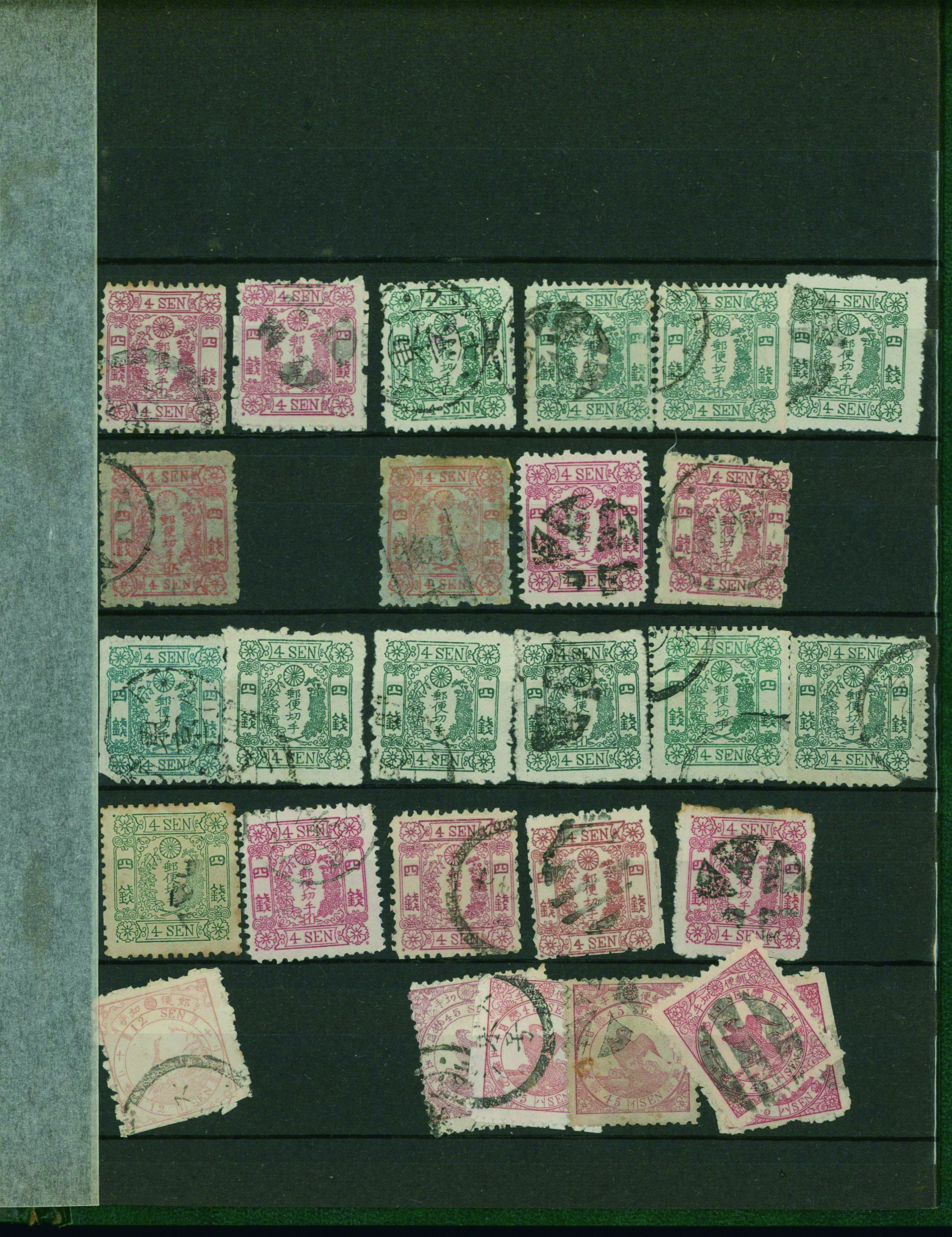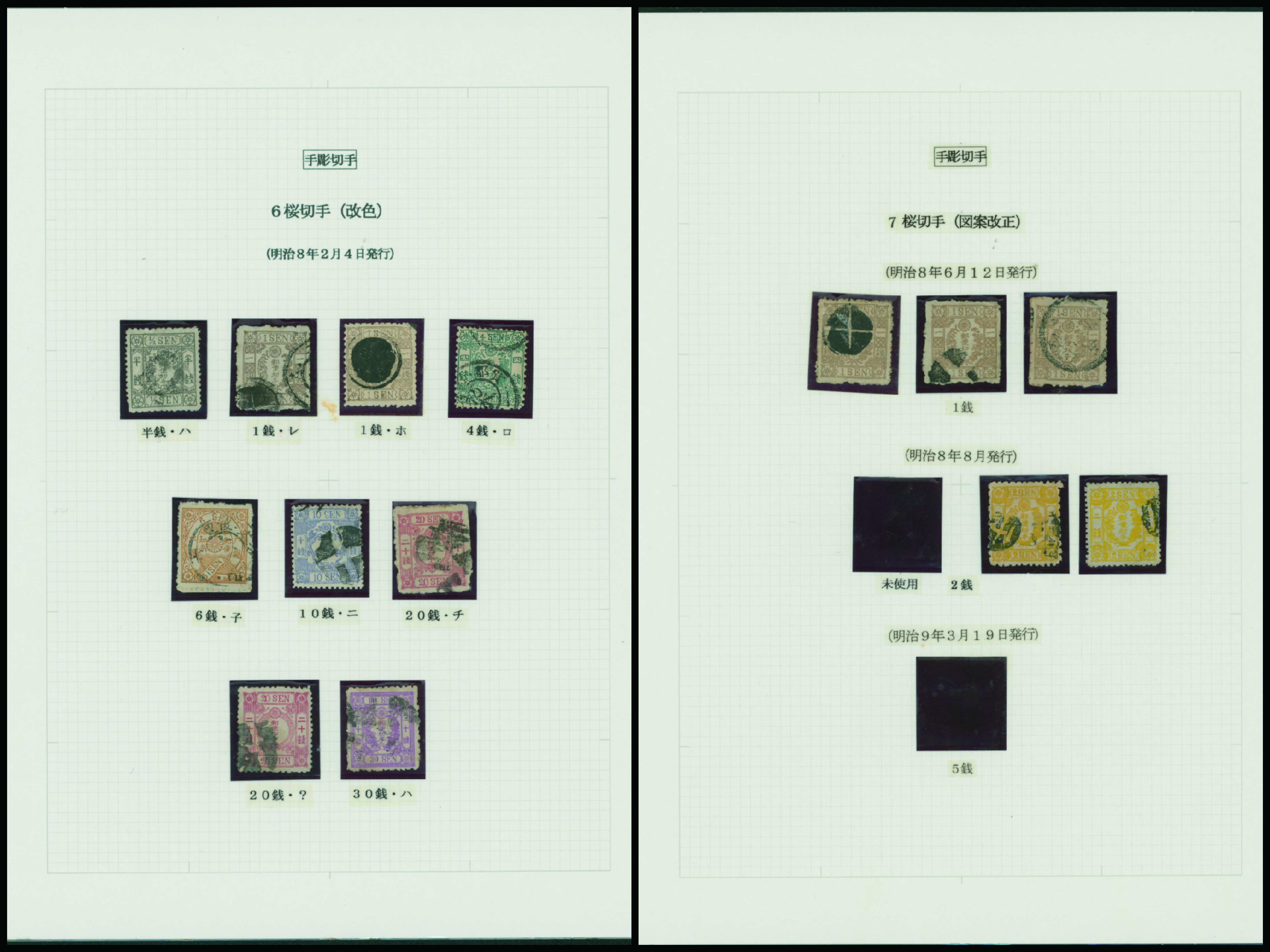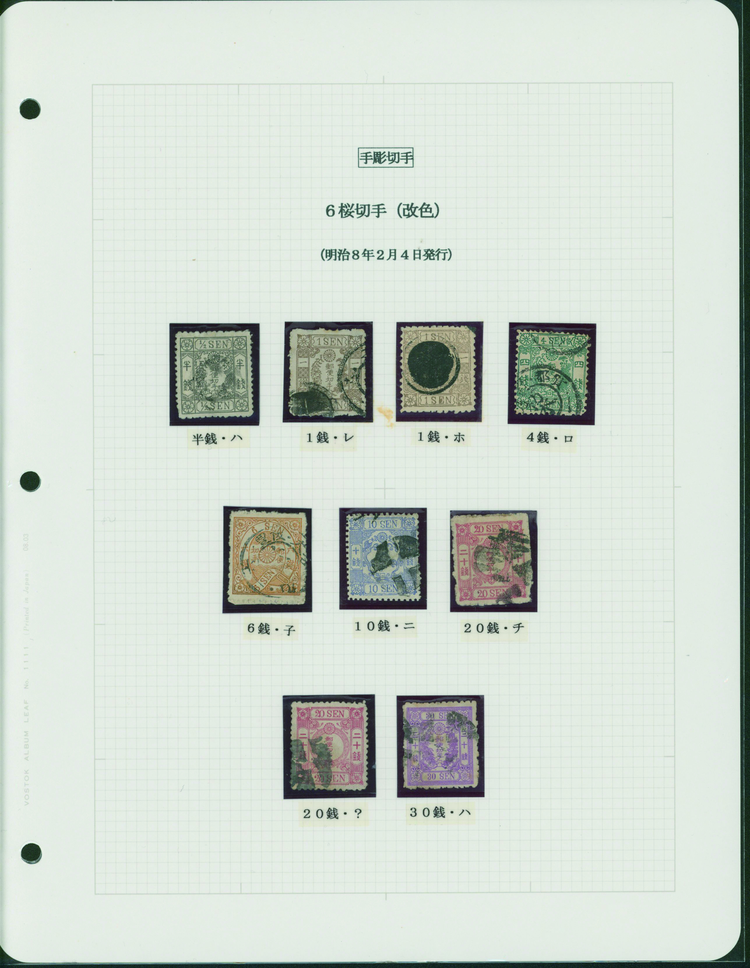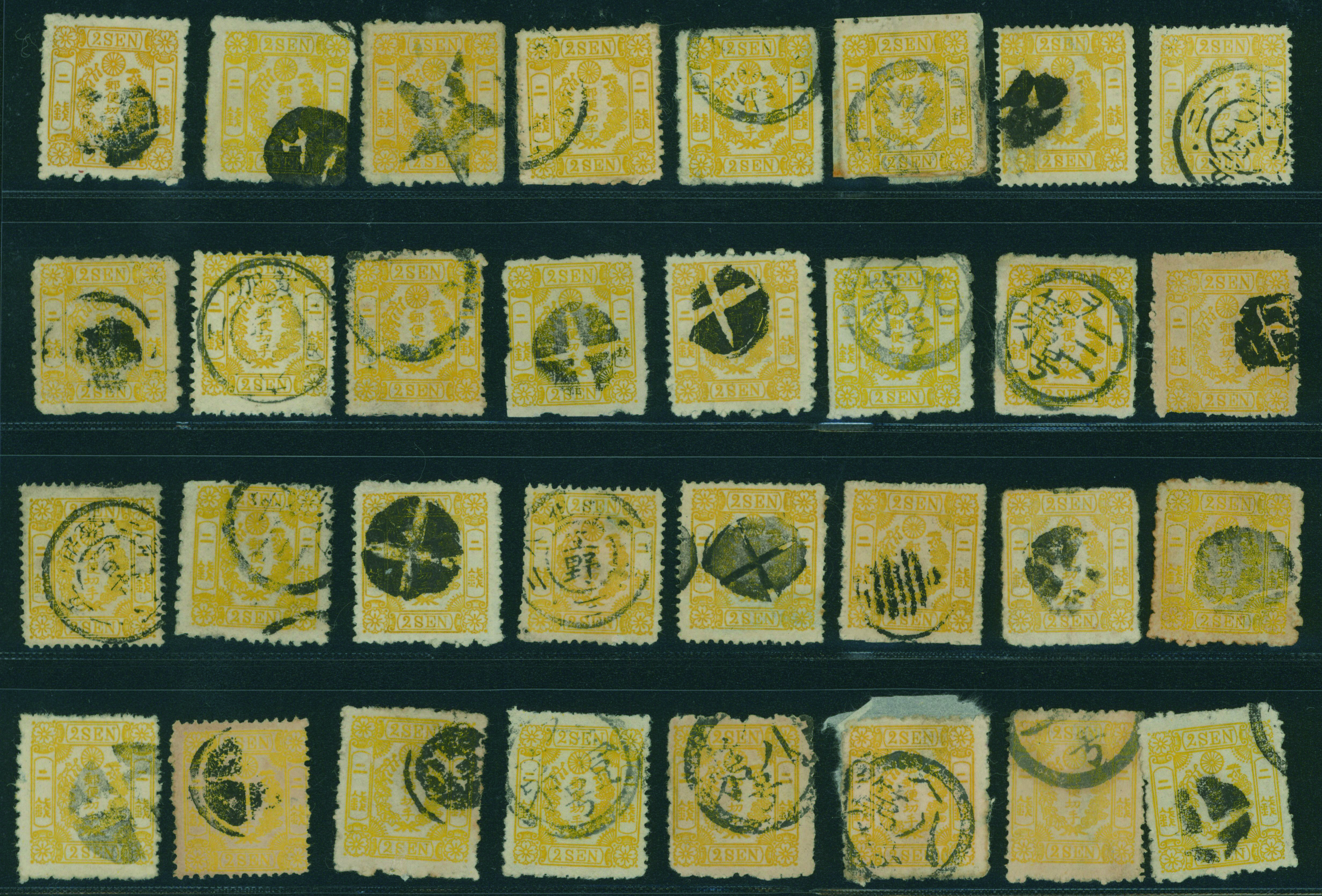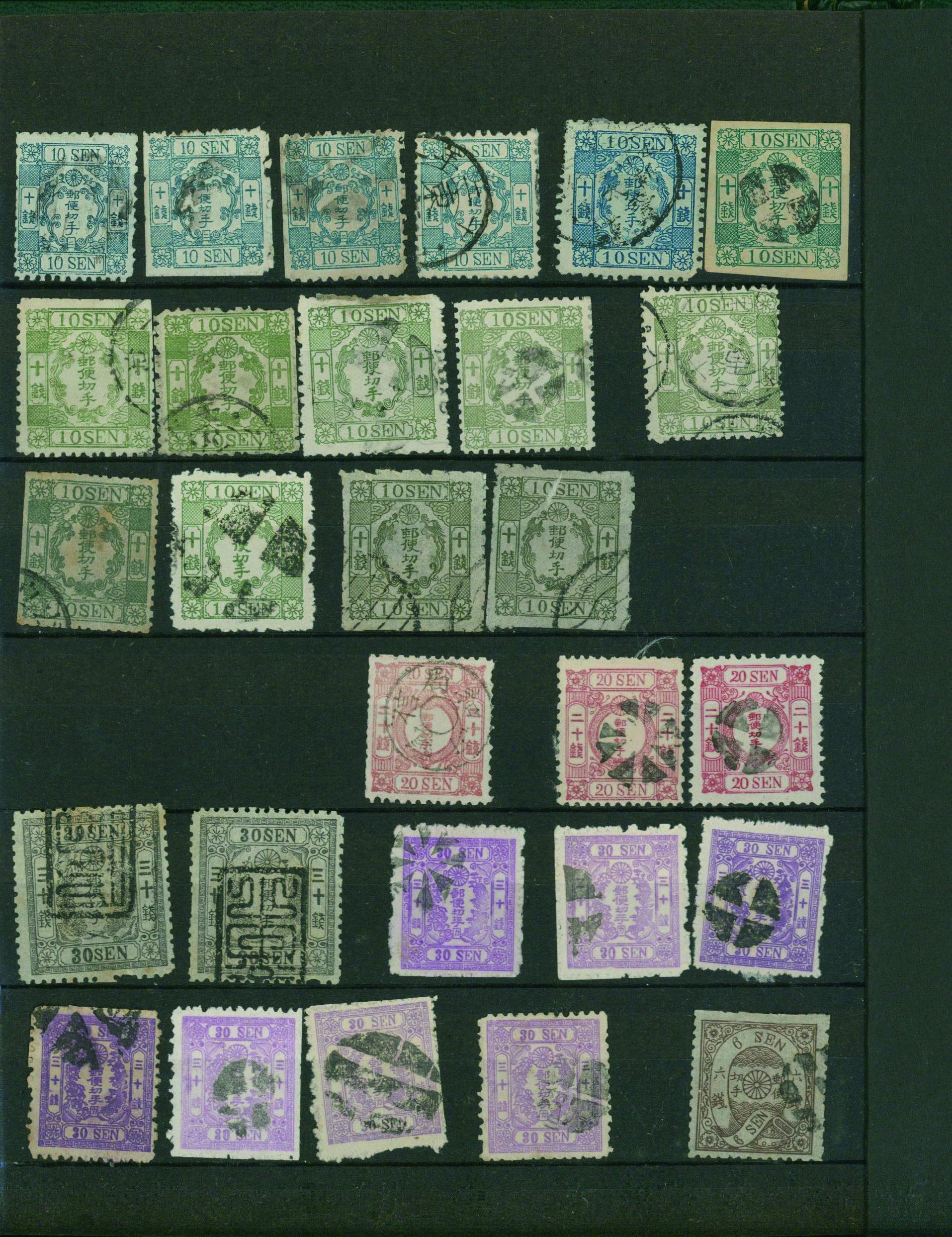 [済] 和桜松田半銭, 政府1銭, 政府2銭赤, 4銭, 洋桜1銭青カナ, 鳥12銭, 45銭, 改色桜半銭灰カナ, 4銭緑カナ, 6銭橙カナ, 10銭青カナ, 20銭赤カナ, ネギ5銭, 新小判8銭 など 済 35枚 多くが状態悪い手彫・桜切手24枚と、 満月印消しなど印影良好な小判・菊切手11枚