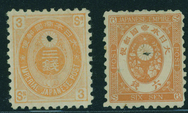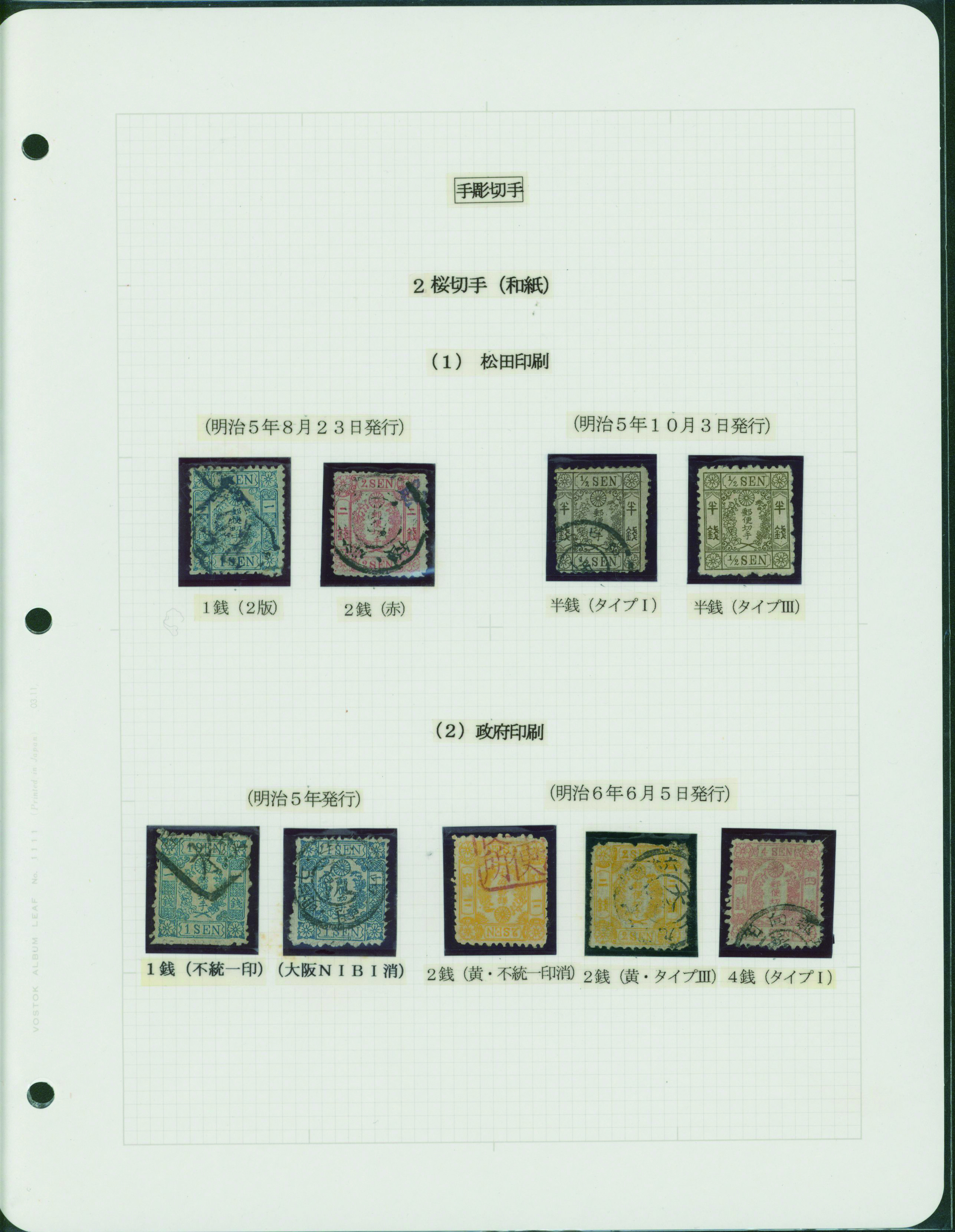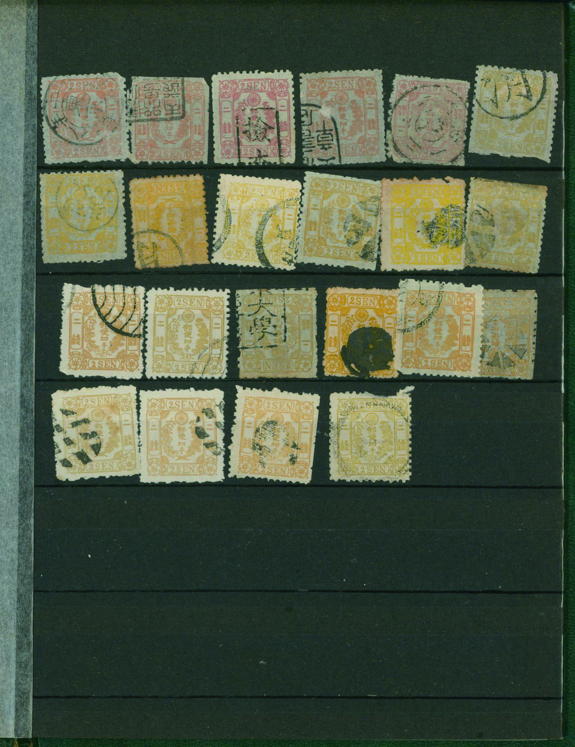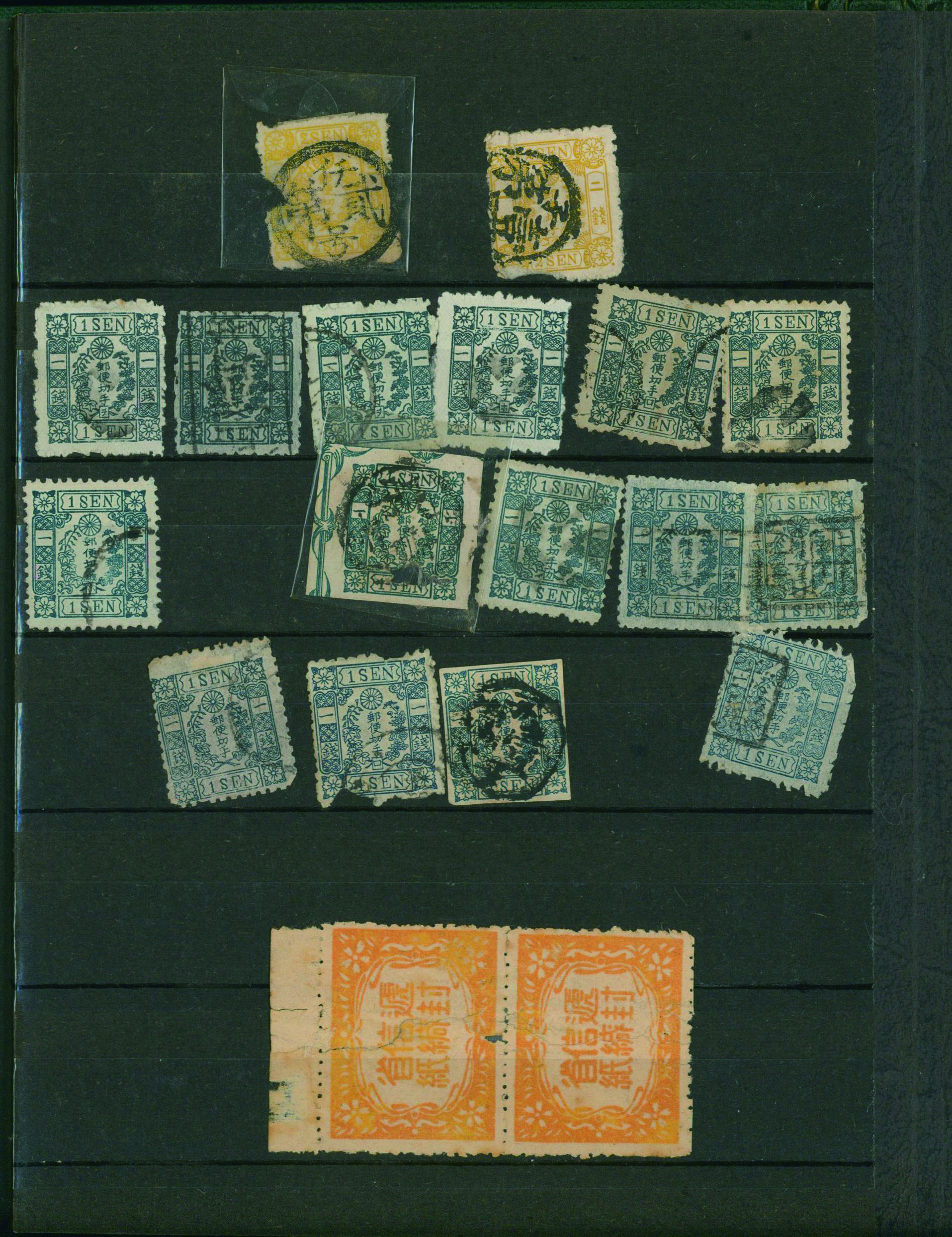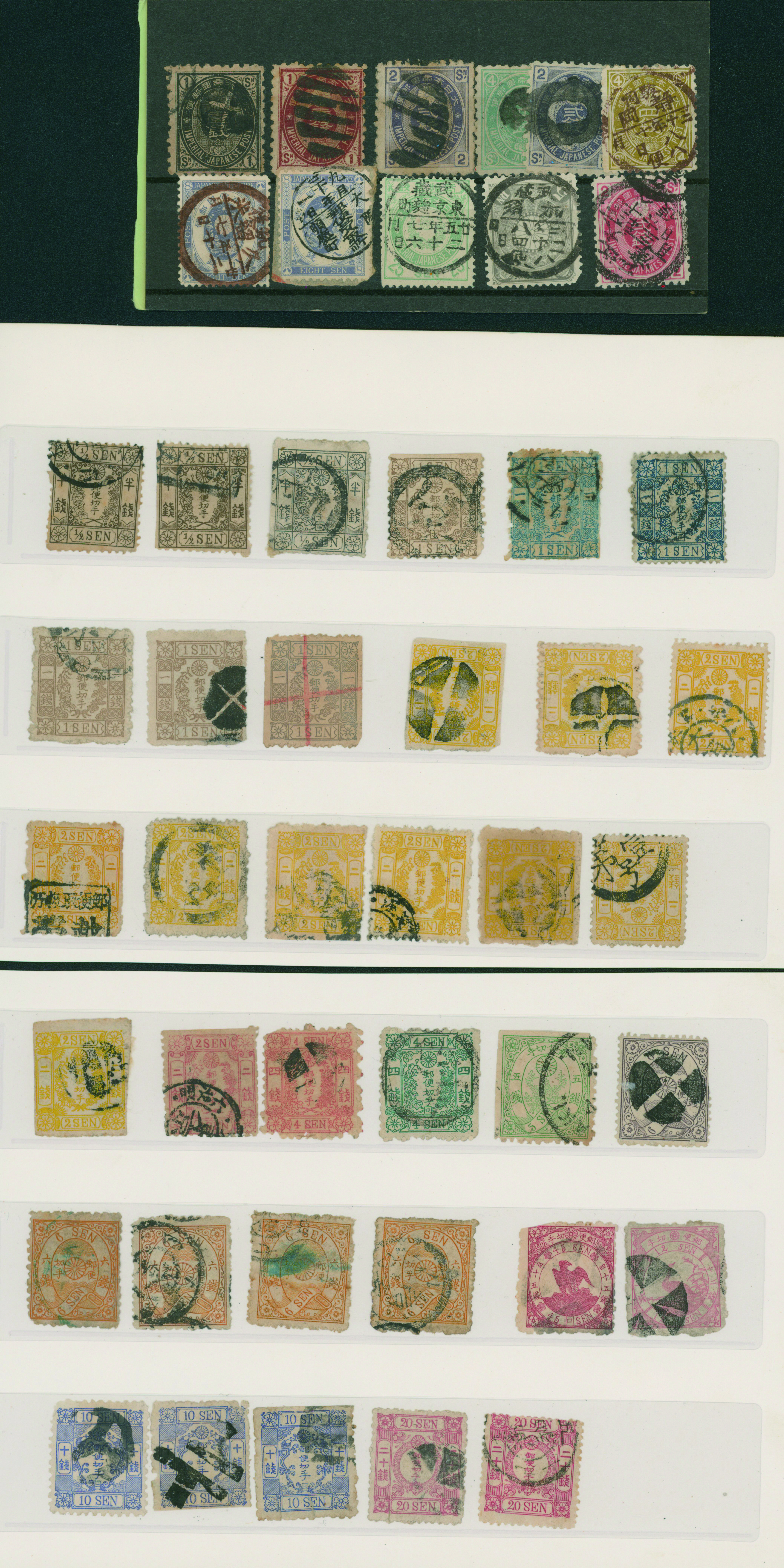 [済] 和桜松田半銭, 政府1銭, 政府2銭赤, 4銭, 洋桜1銭青カナ, 鳥12銭, 45銭, 改色桜半銭灰カナ, 4銭緑カナ, 6銭橙カナ, 10銭青カナ, 20銭赤カナ, ネギ5銭, 新小判8銭 など 済 35枚 多くが状態悪い手彫・桜切手24枚と、 満月印消しなど印影良好な小判・菊切手11枚