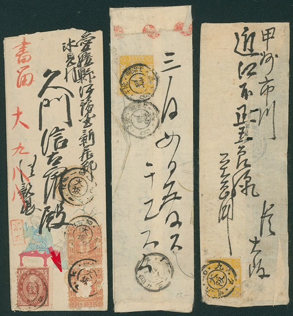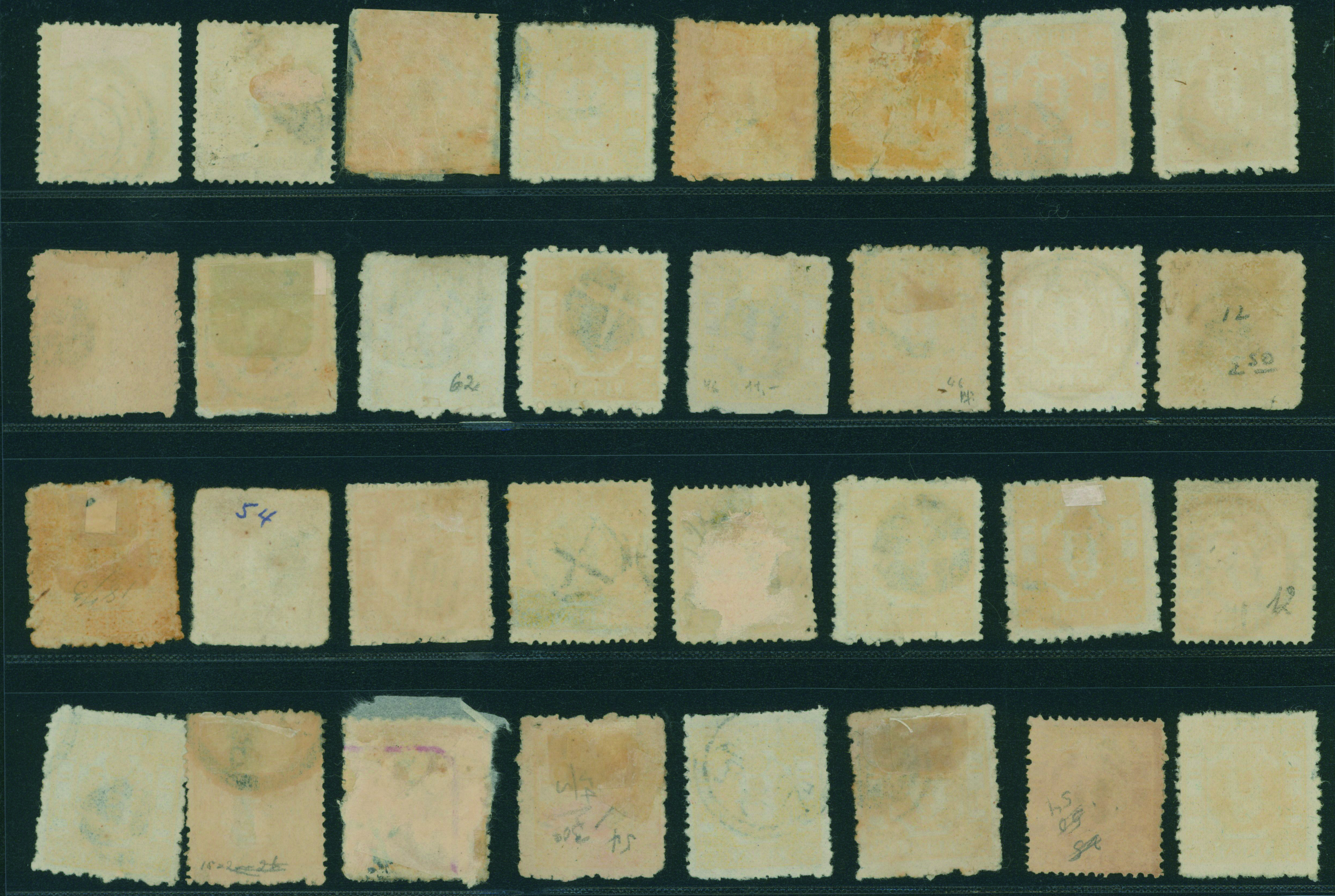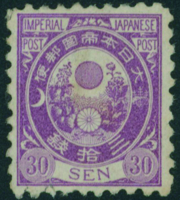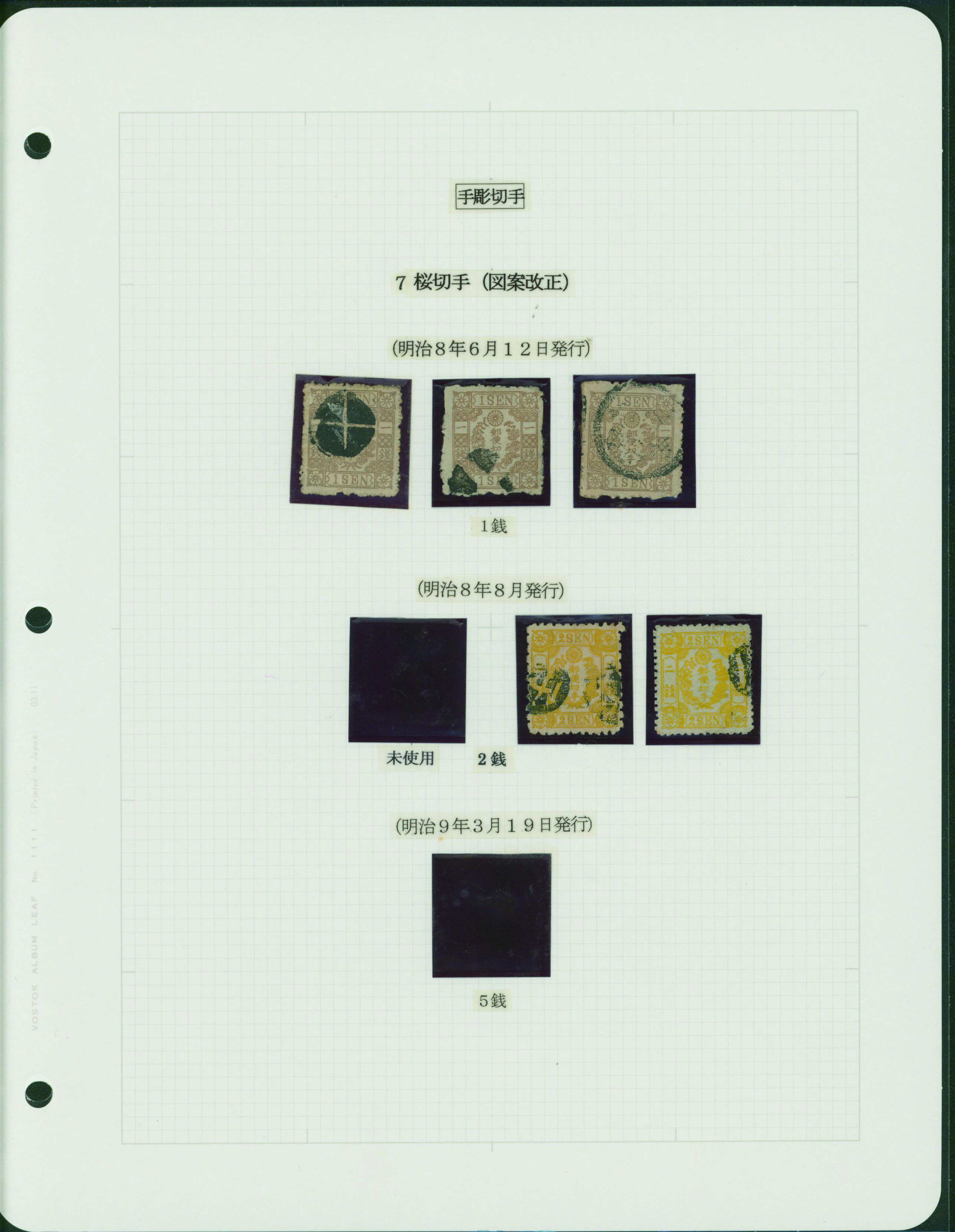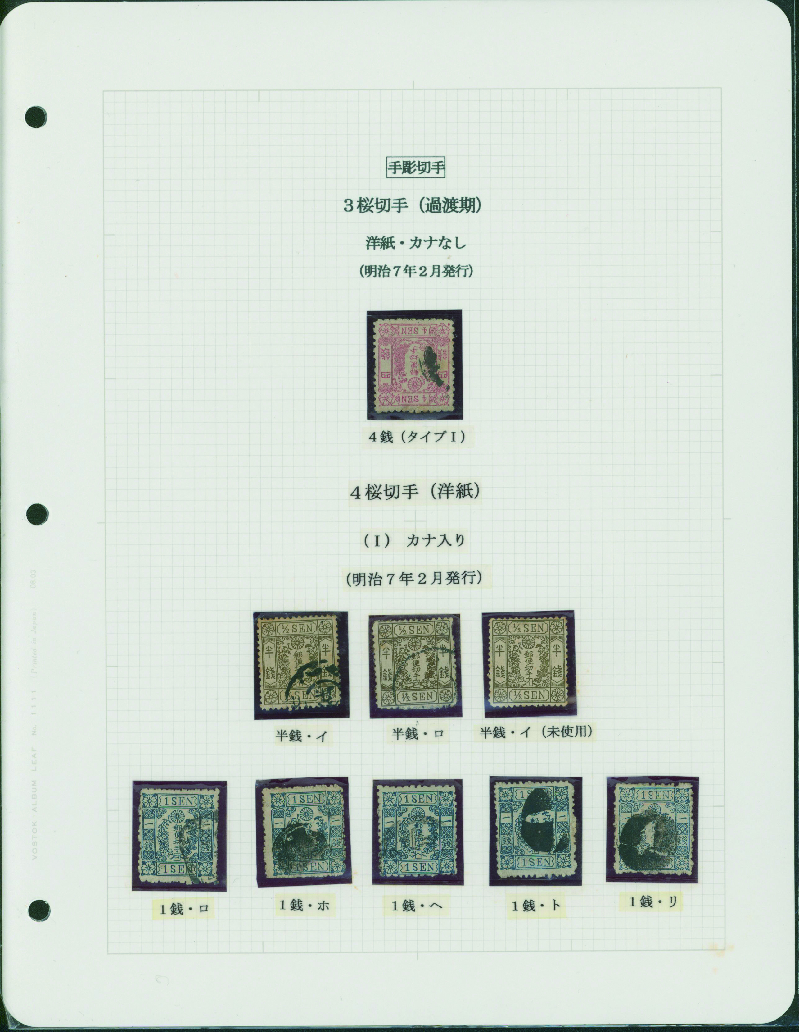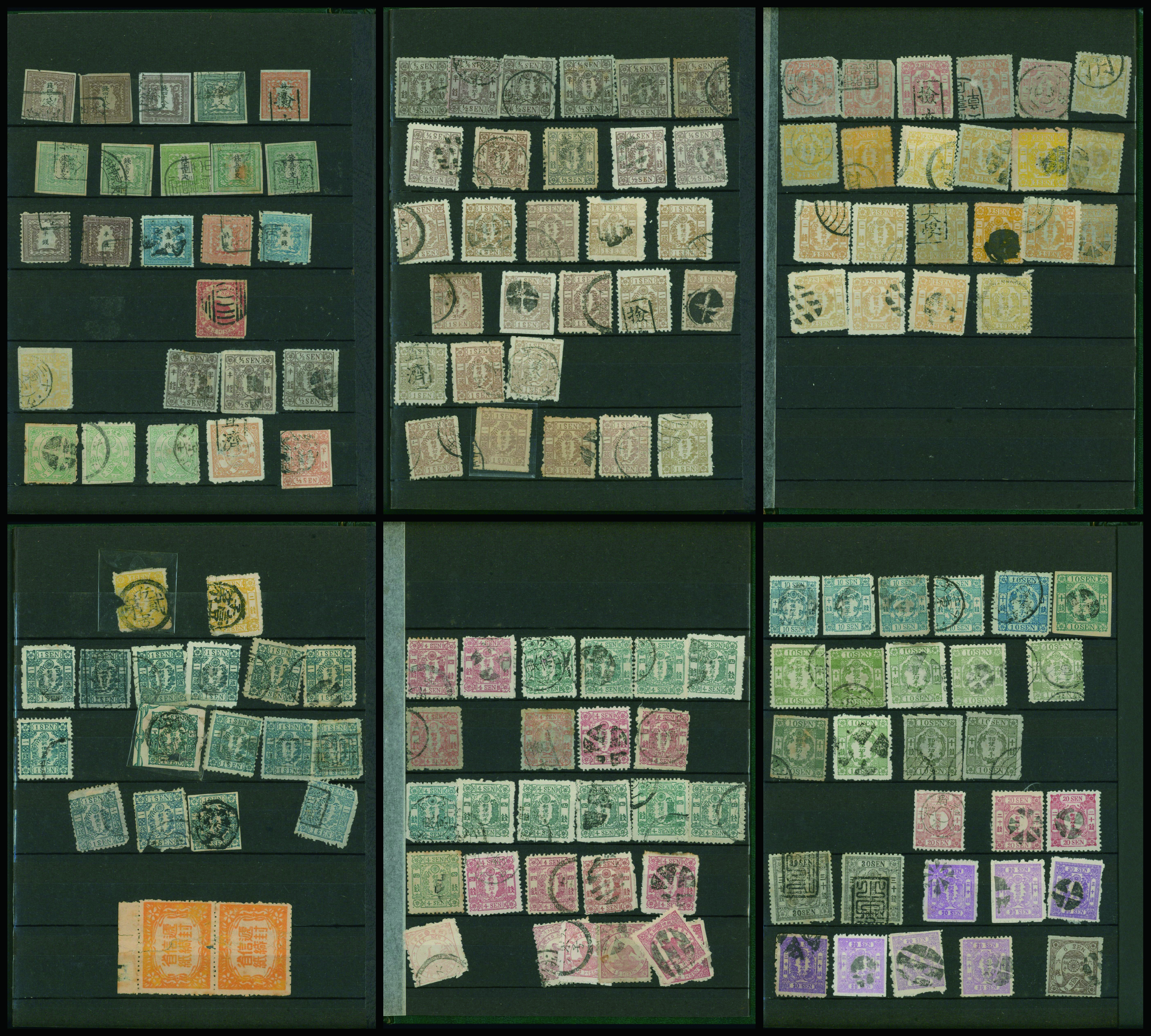 [済] 和桜松田半銭, 政府1銭, 政府2銭赤, 4銭, 洋桜1銭青カナ, 鳥12銭, 45銭, 改色桜半銭灰カナ, 4銭緑カナ, 6銭橙カナ, 10銭青カナ, 20銭赤カナ, ネギ5銭, 新小判8銭 など 済 35枚 多くが状態悪い手彫・桜切手24枚と、 満月印消しなど印影良好な小判・菊切手11枚