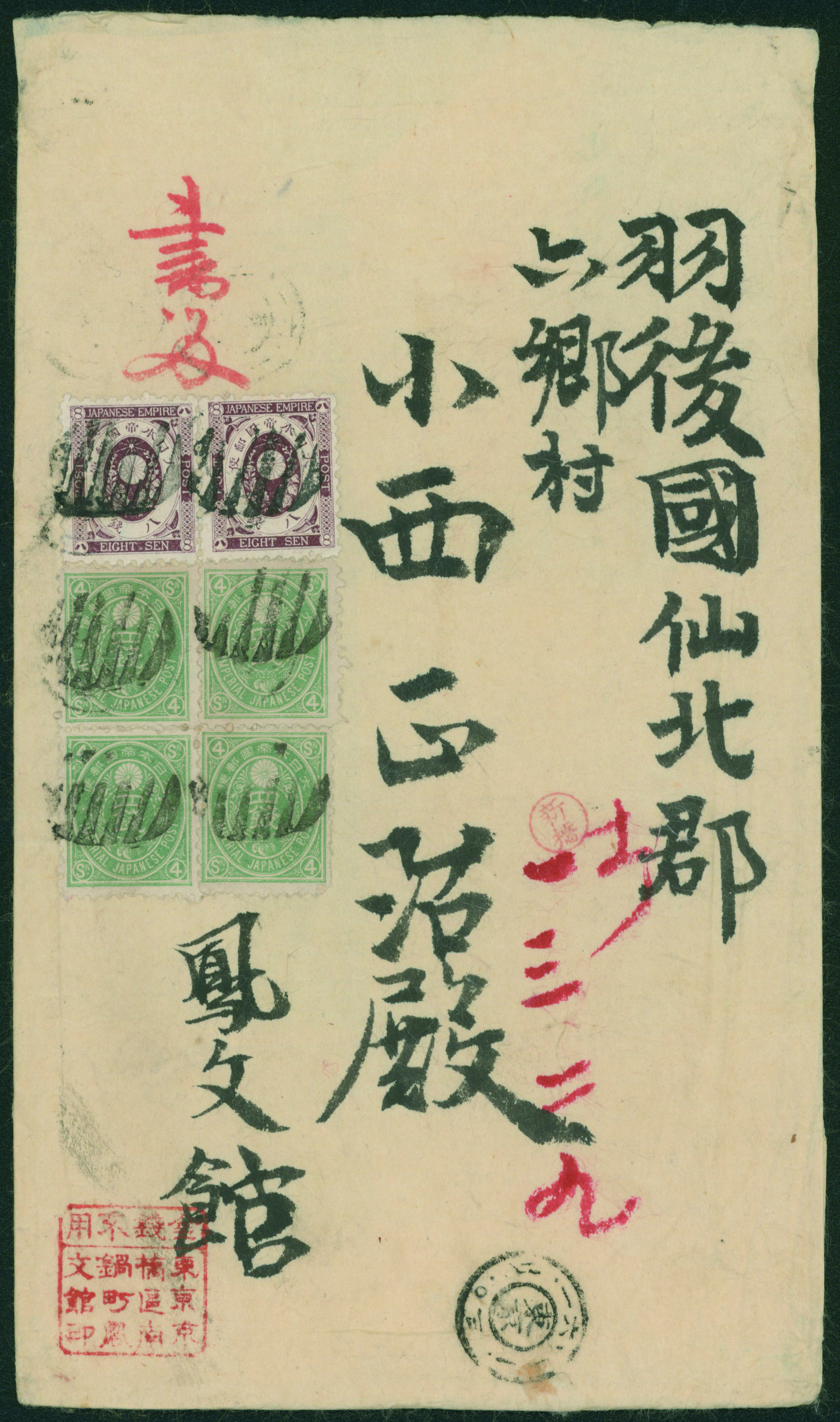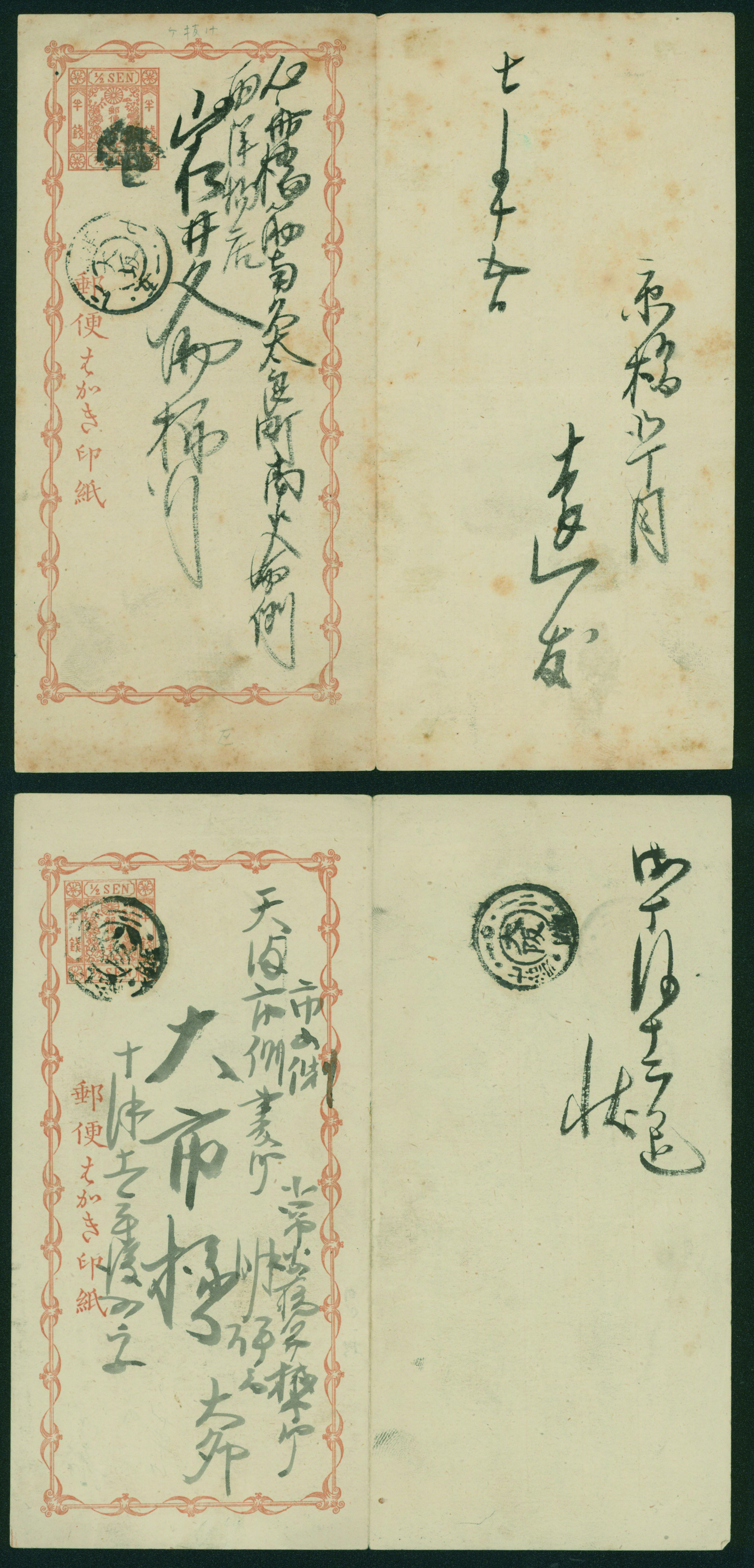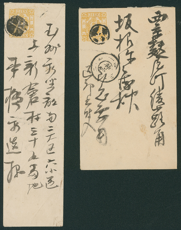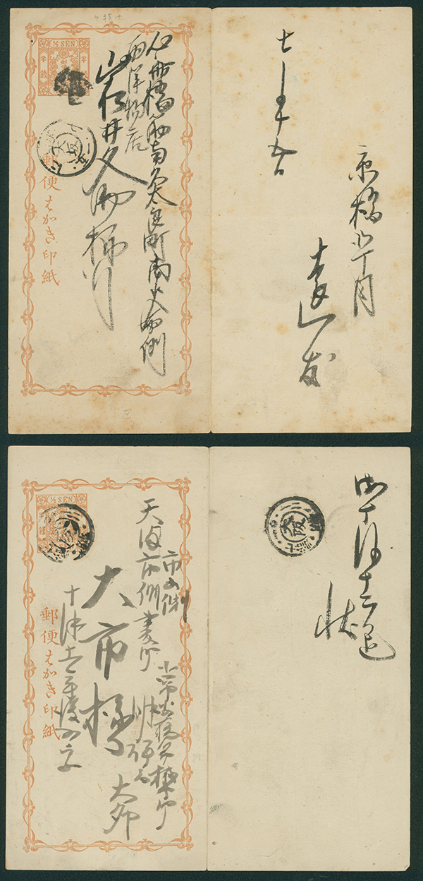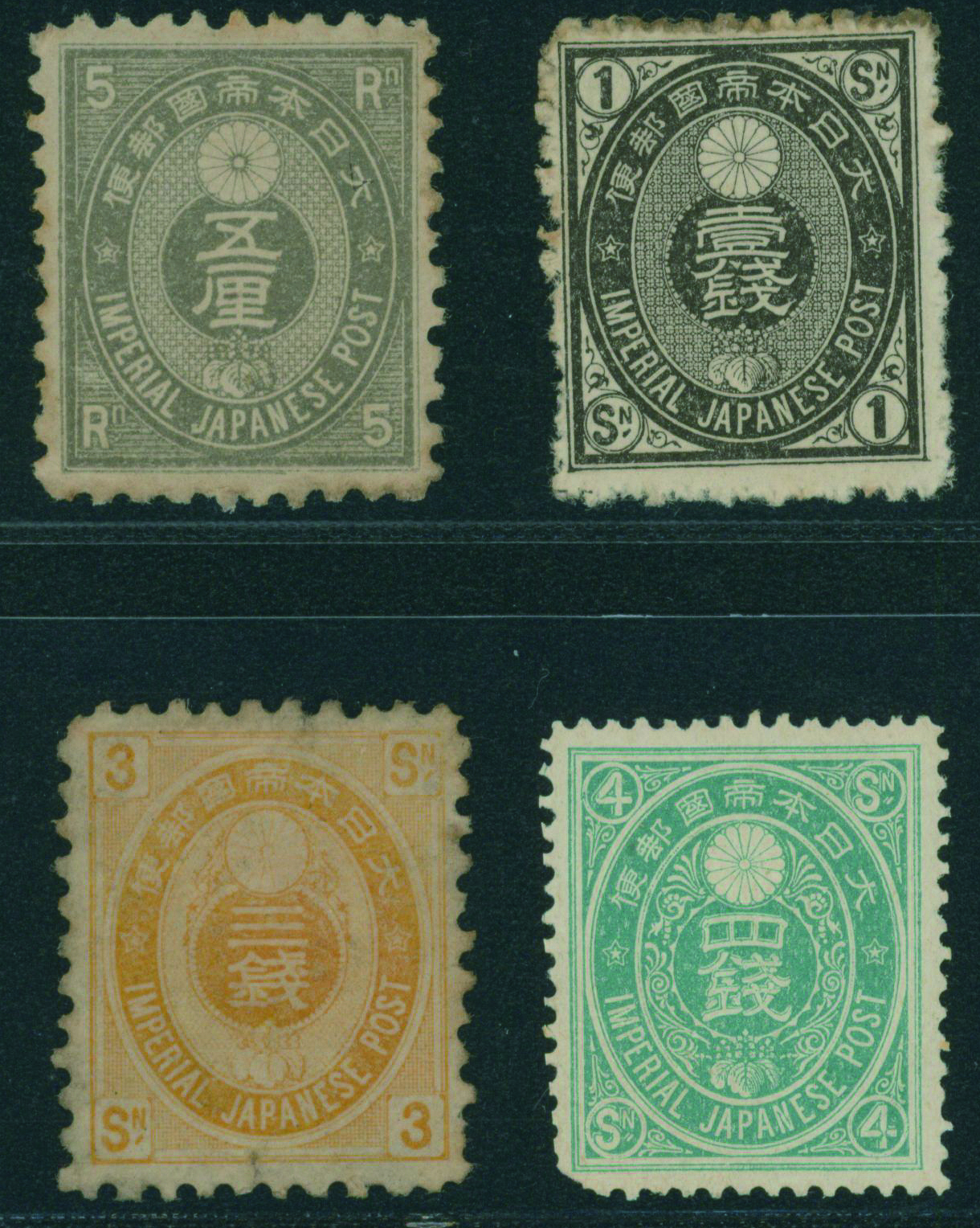 [済] 和桜松田半銭, 政府1銭, 政府2銭赤, 4銭, 洋桜1銭青カナ, 鳥12銭, 45銭, 改色桜半銭灰カナ, 4銭緑カナ, 6銭橙カナ, 10銭青カナ, 20銭赤カナ, ネギ5銭, 新小判8銭 など 済 35枚 多くが状態悪い手彫・桜切手24枚と、 満月印消しなど印影良好な小判・菊切手11枚