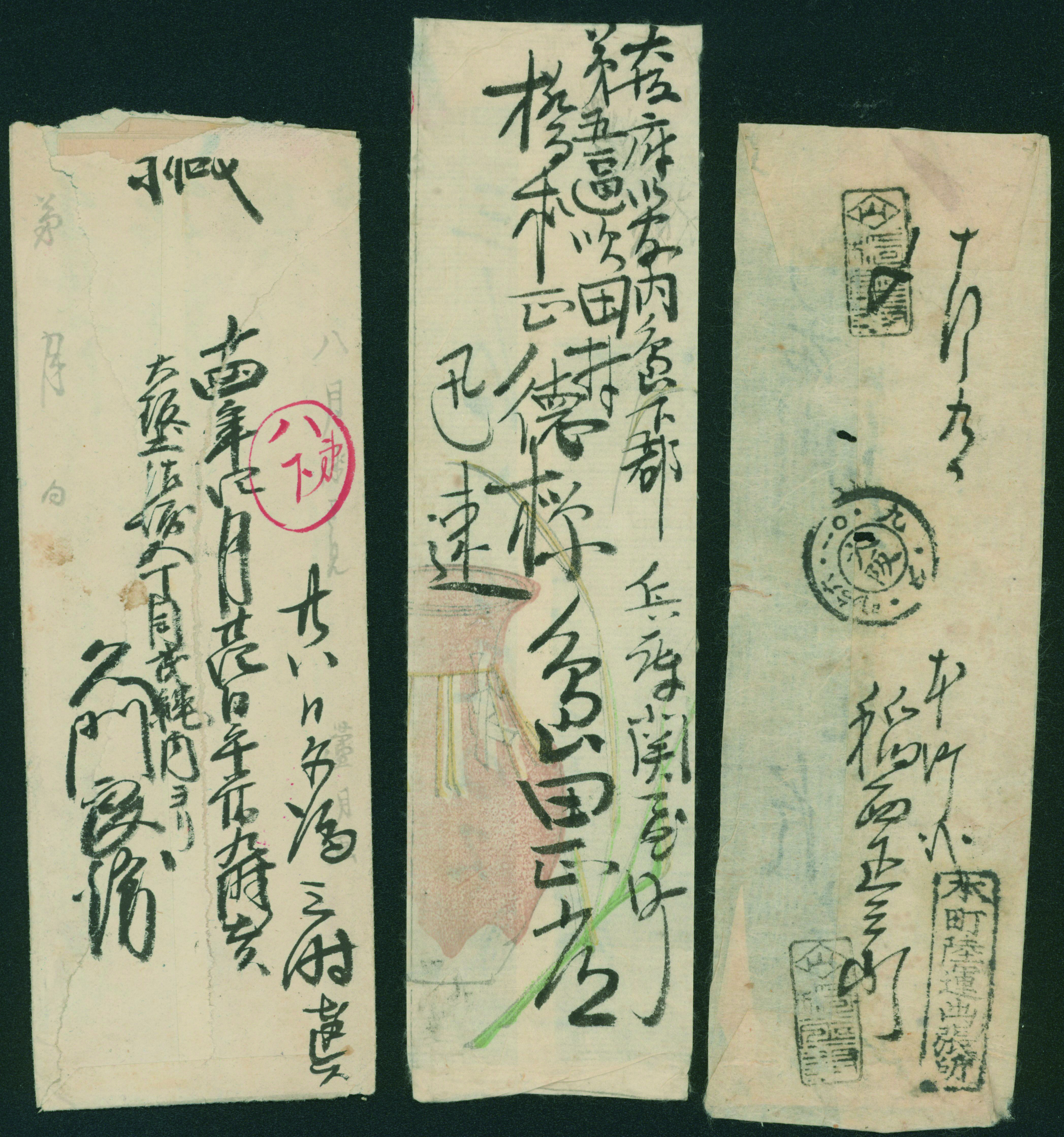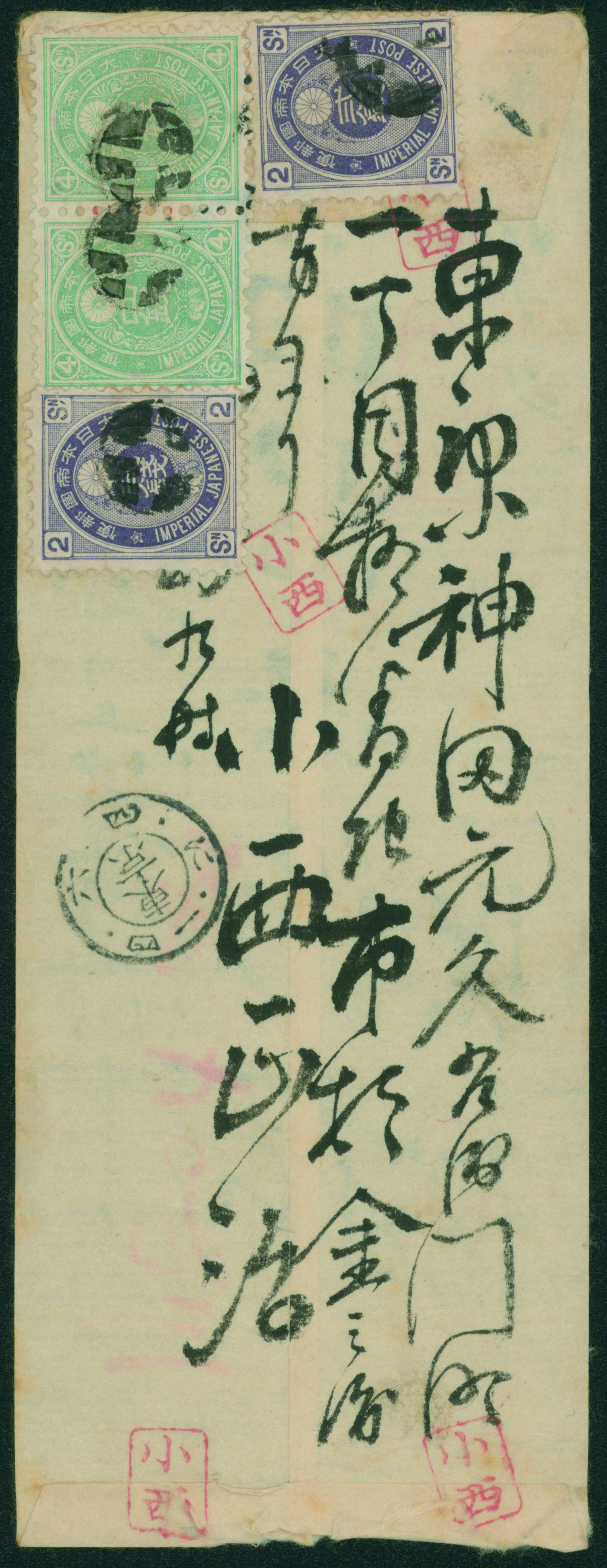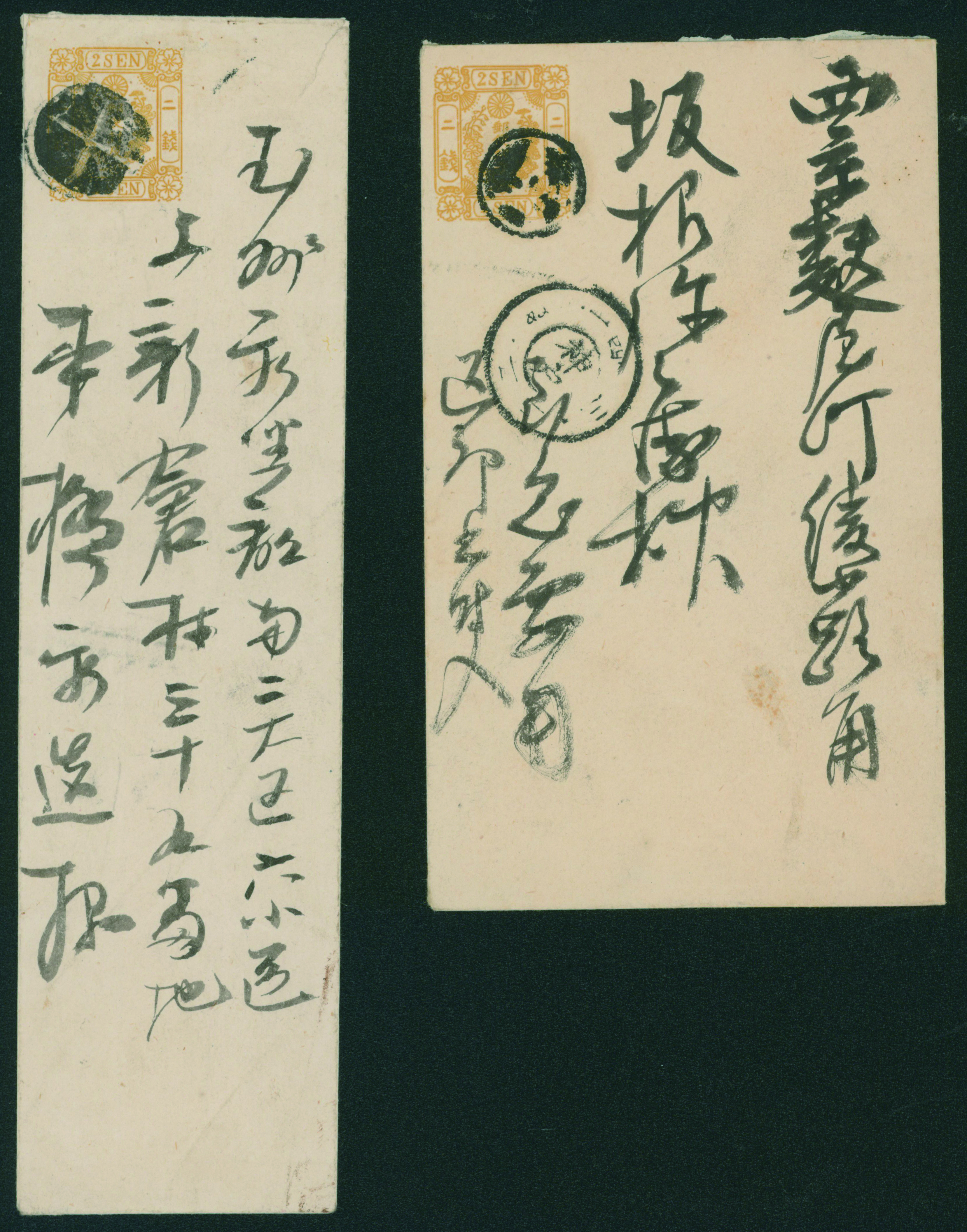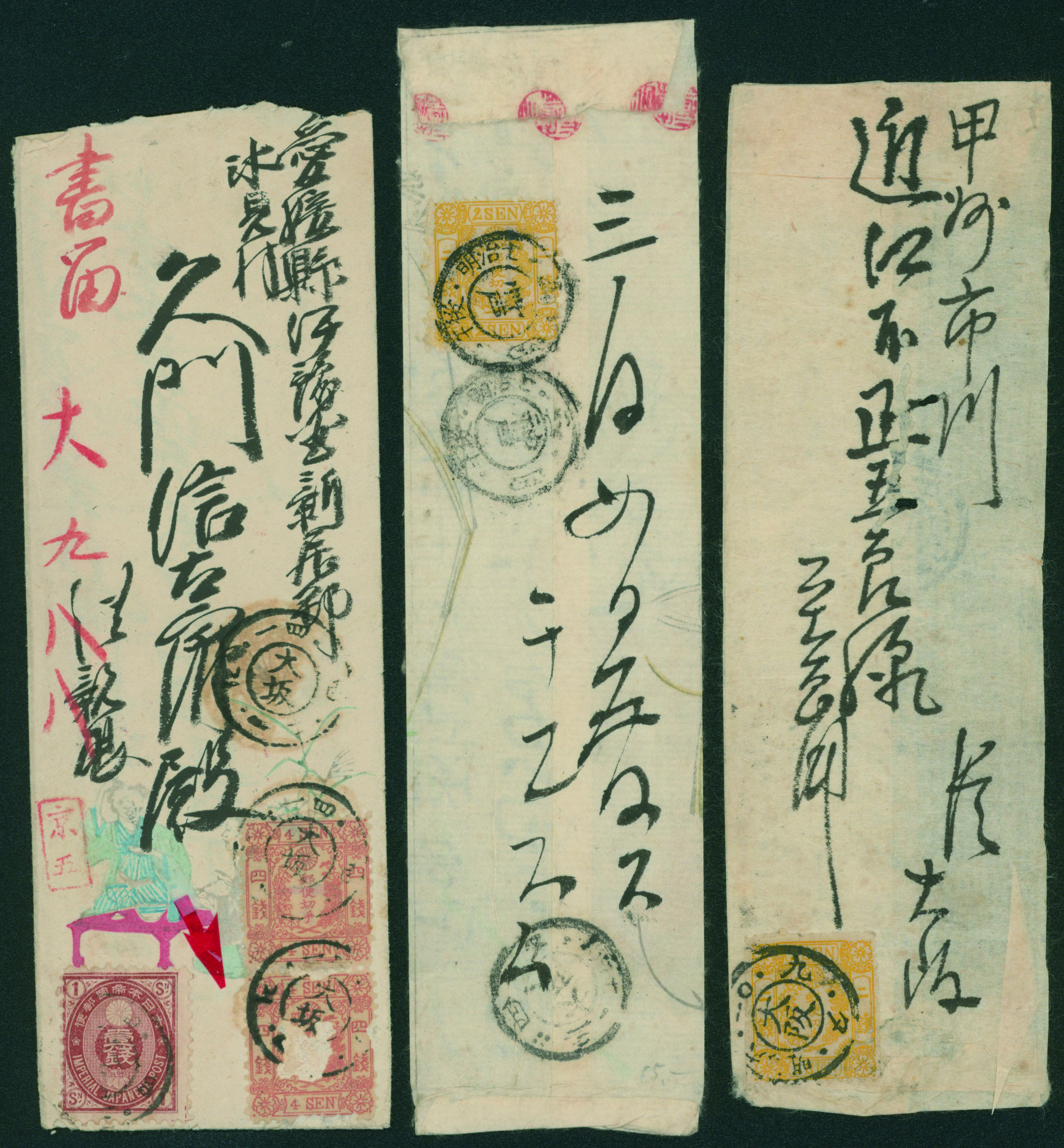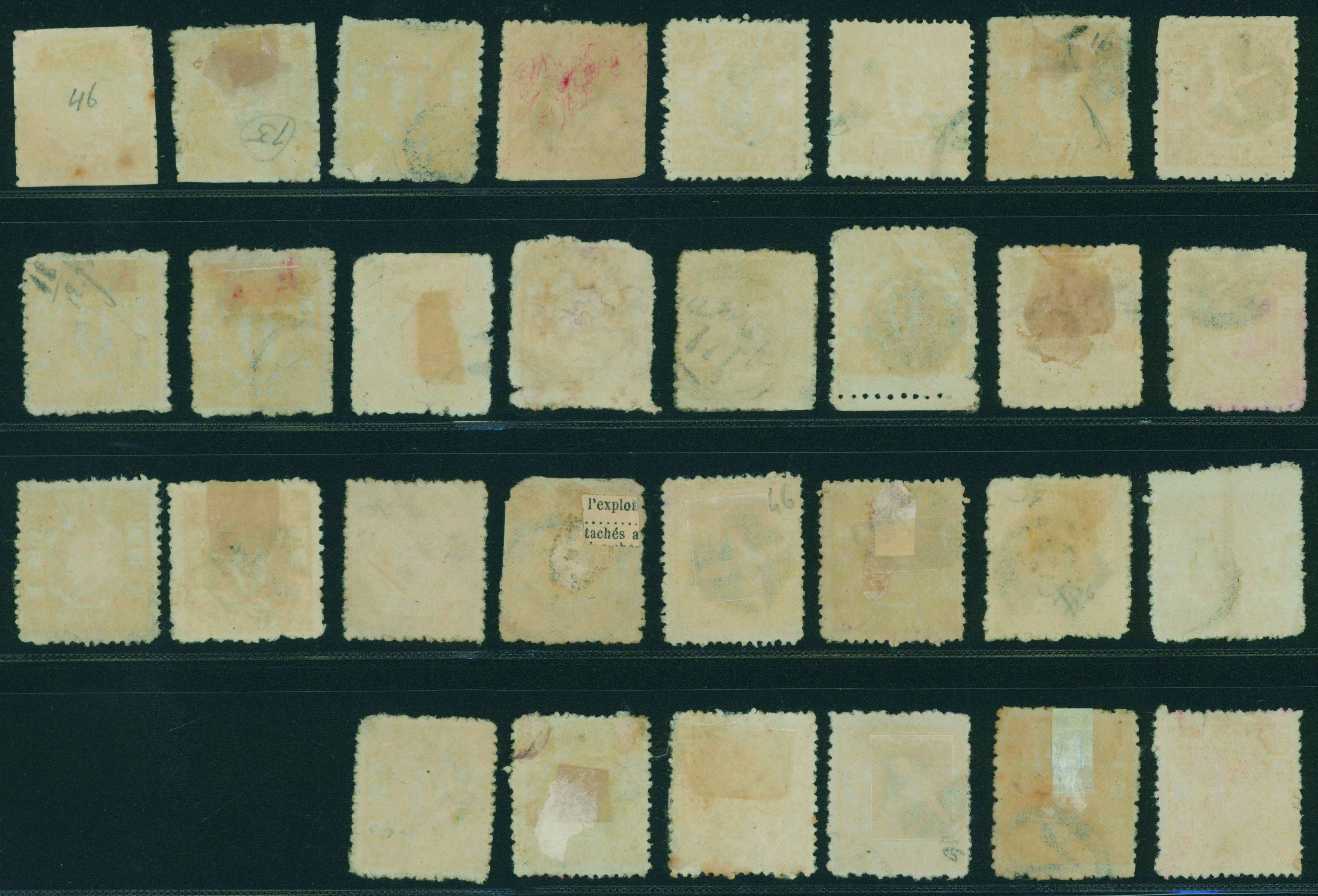 [済] 和桜松田半銭, 政府1銭, 政府2銭赤, 4銭, 洋桜1銭青カナ, 鳥12銭, 45銭, 改色桜半銭灰カナ, 4銭緑カナ, 6銭橙カナ, 10銭青カナ, 20銭赤カナ, ネギ5銭, 新小判8銭 など 済 35枚 多くが状態悪い手彫・桜切手24枚と、 満月印消しなど印影良好な小判・菊切手11枚