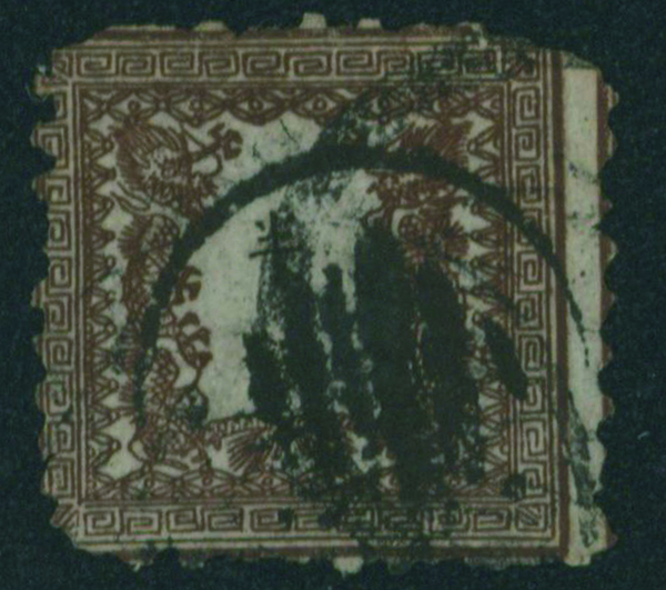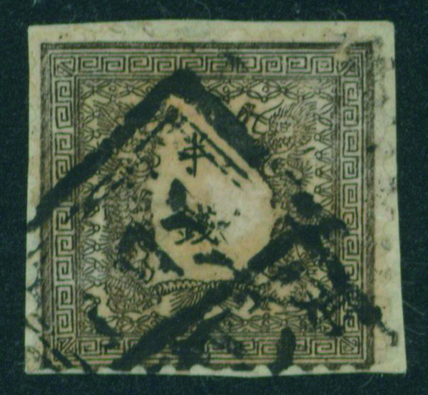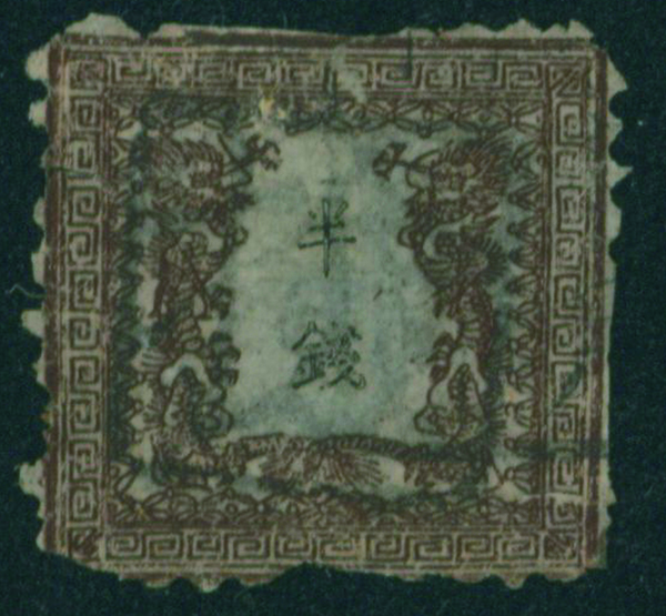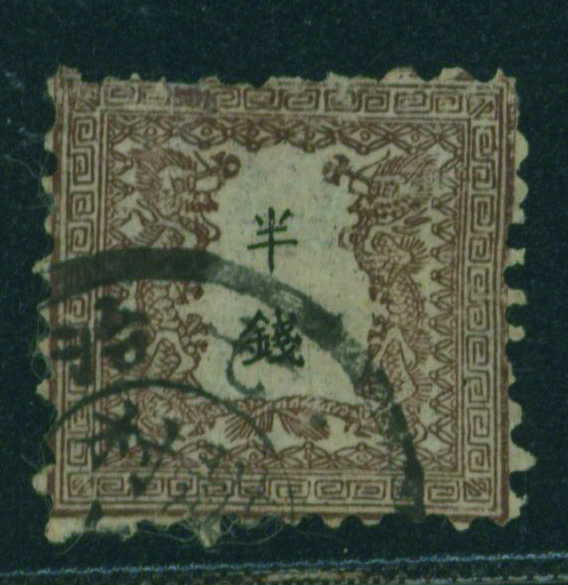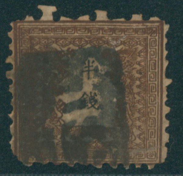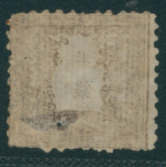 [済] 竜半銭 1版 pos.26 灰茶 済 裏一部薄い 切手中央部に欠損穴 全体に裏打ち補修 不統一印(角検) 東京