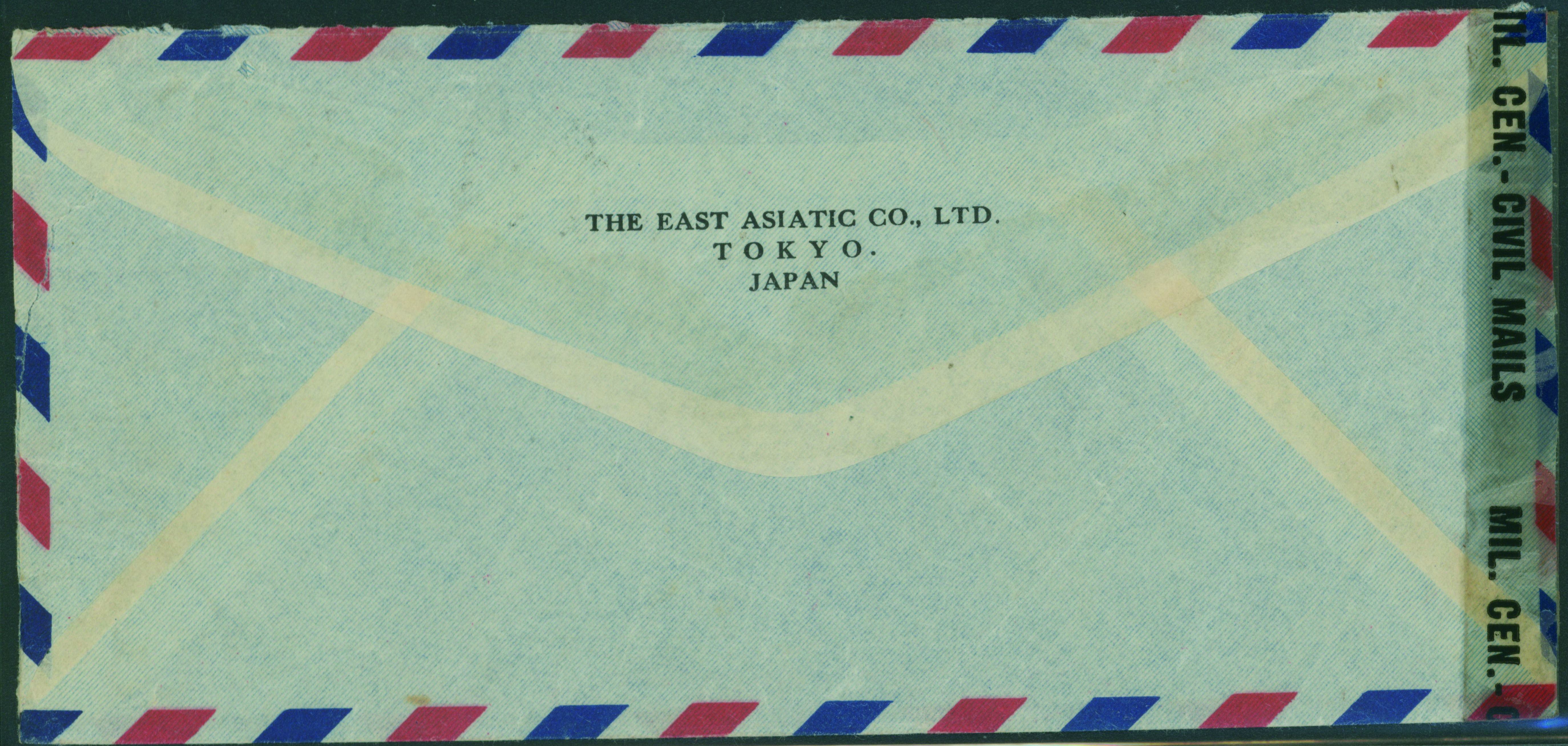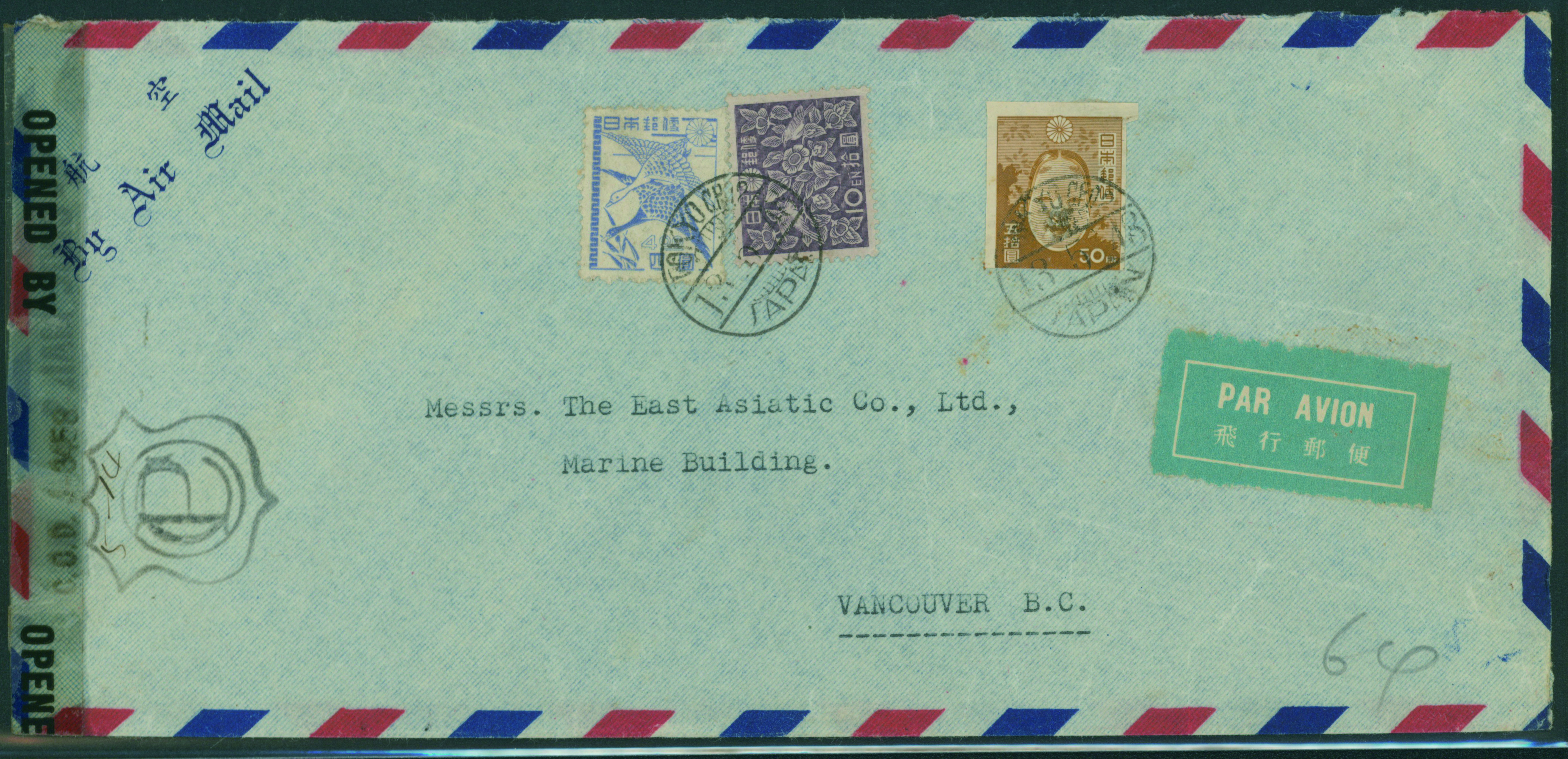 [使用例] 能面50円無目打, 落雁図4円, 螺鈿横10円 印面に切込み 欧文櫛型印 1948-05-13 TOKYO CPO2→カナダ 外信航空書状 検閲あり