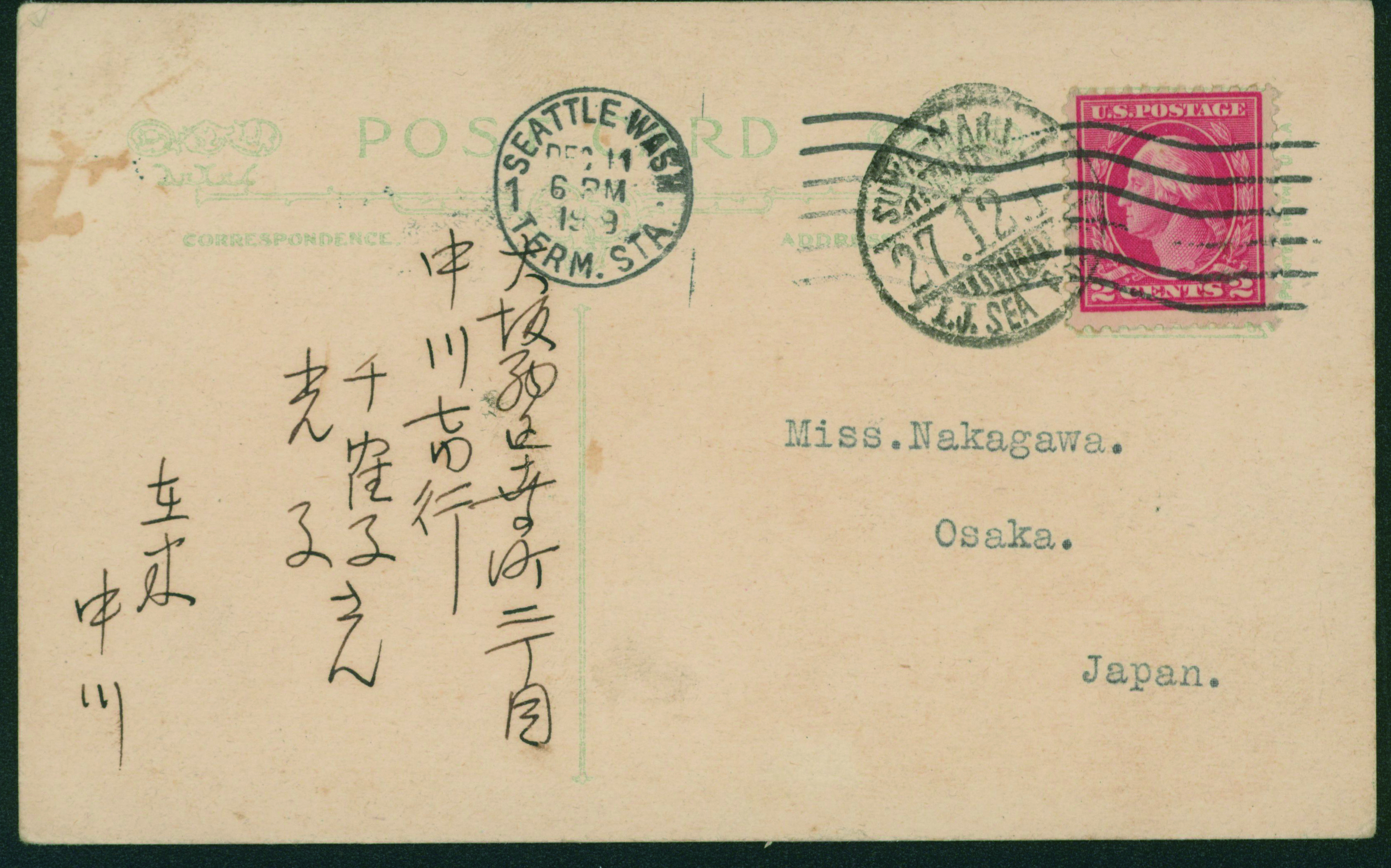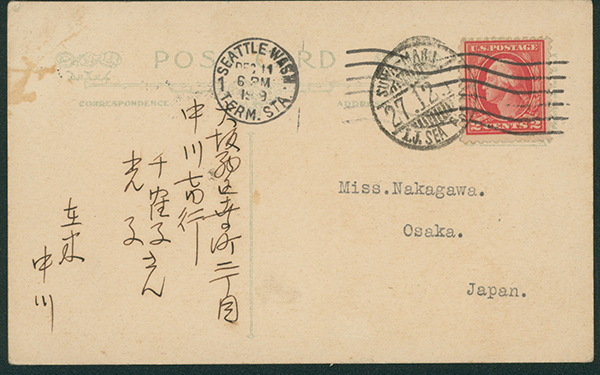 [使用例] 2通 風景2銭 単貼り 欧文櫛型印(紫) 1930-04-25 TATSUTA-MARU 外信船便印刷物 +旧中国1分葉書にジャンク1分加貼 SHIMONOSEKI/Japanパクボー便