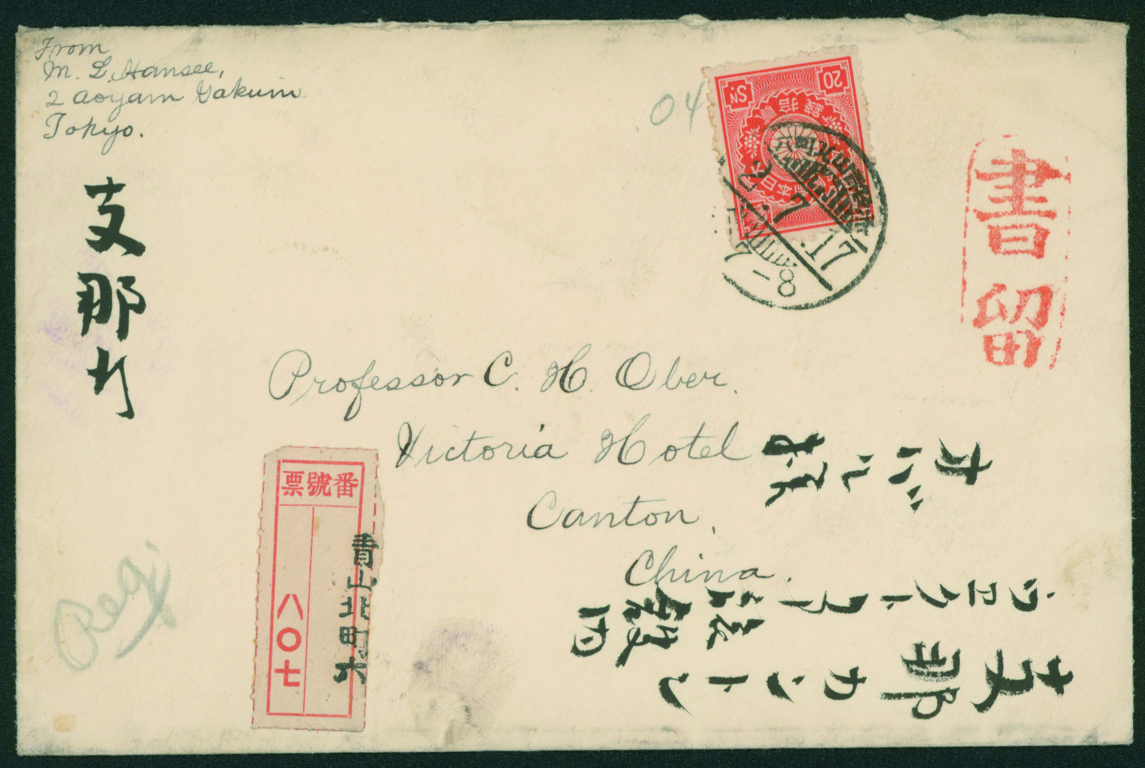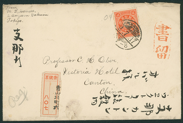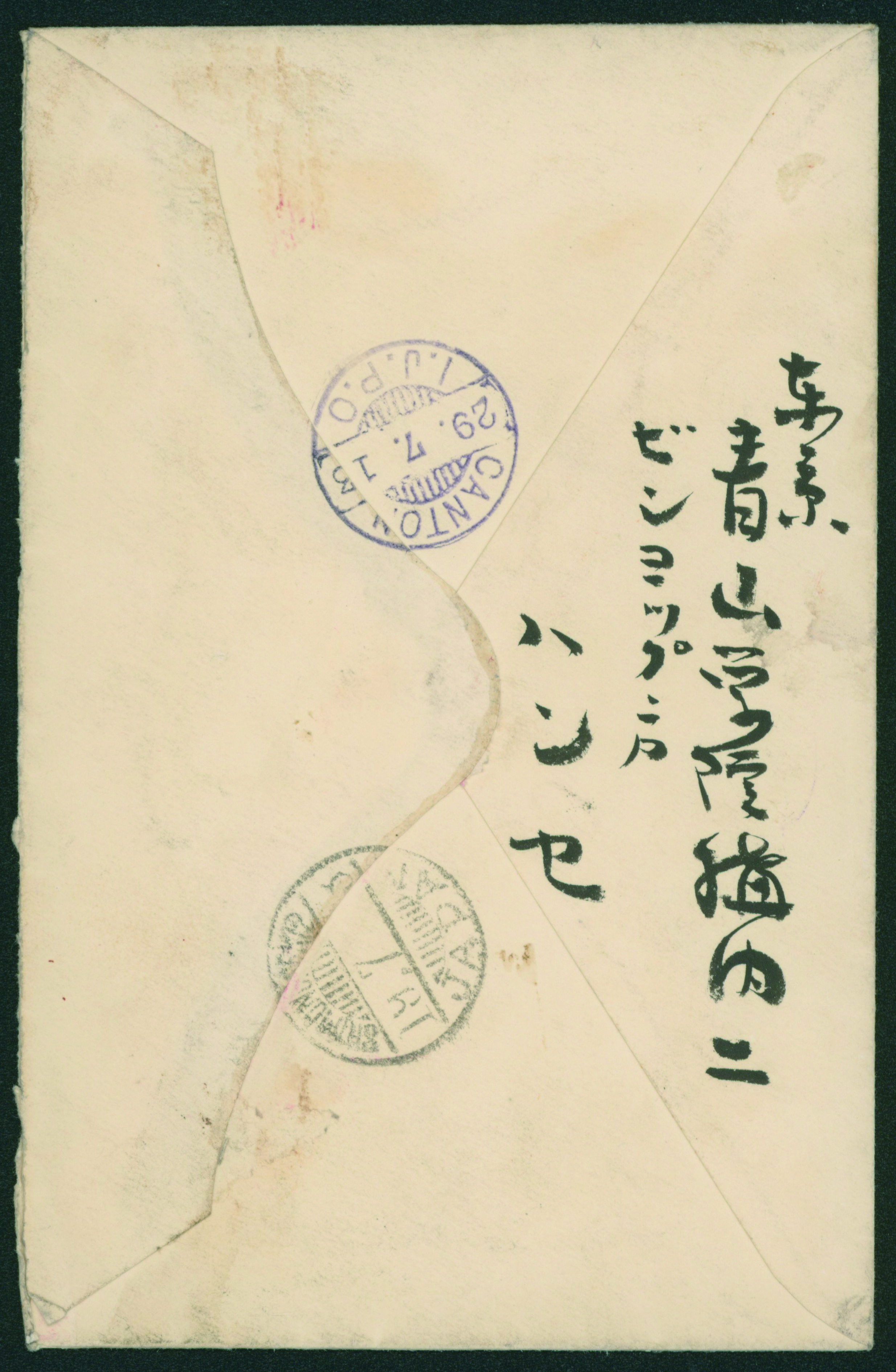 [使用例] 菊20銭 単貼り 櫛型印 大正2 7 17 赤坂青山北町六→SHIMONOSEKI 2 / JAPAN→広東 到着印:7/29 外信船便書状書留