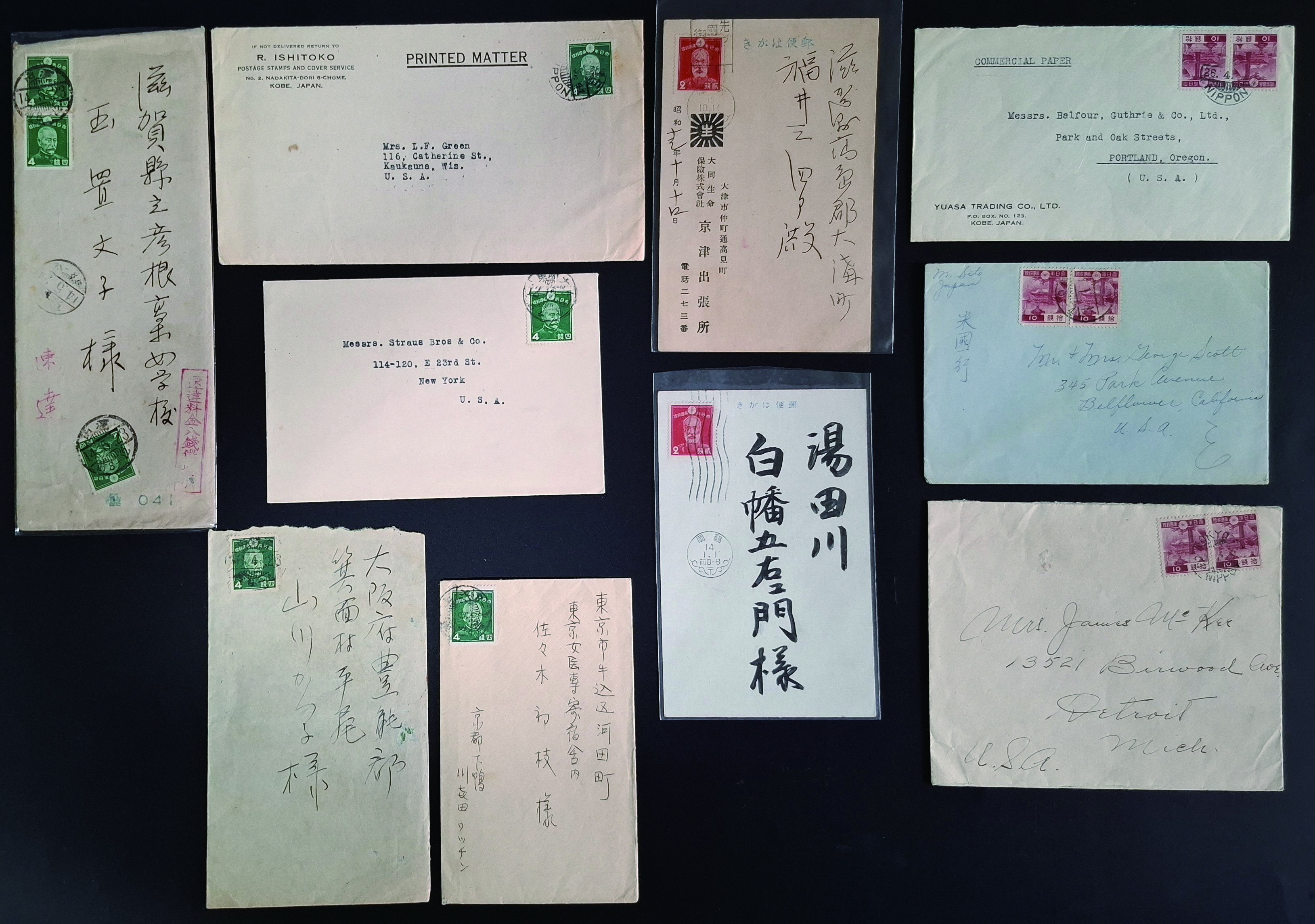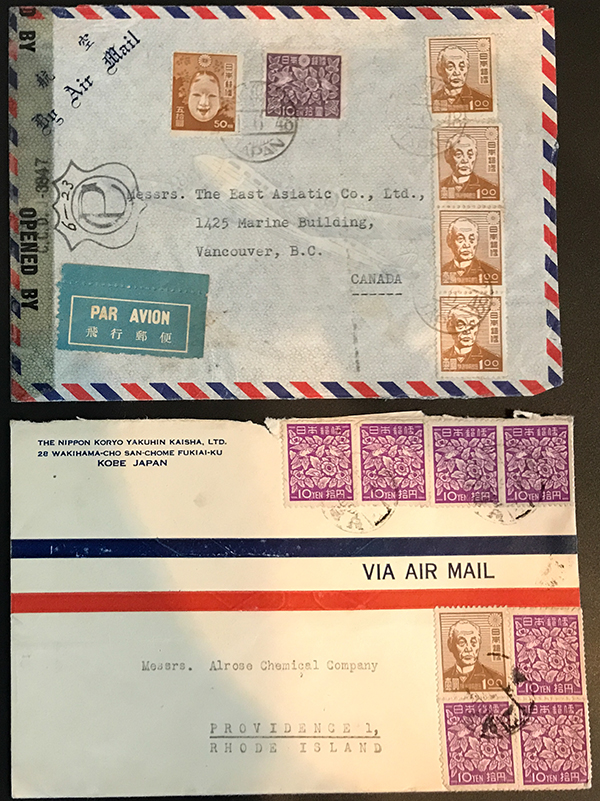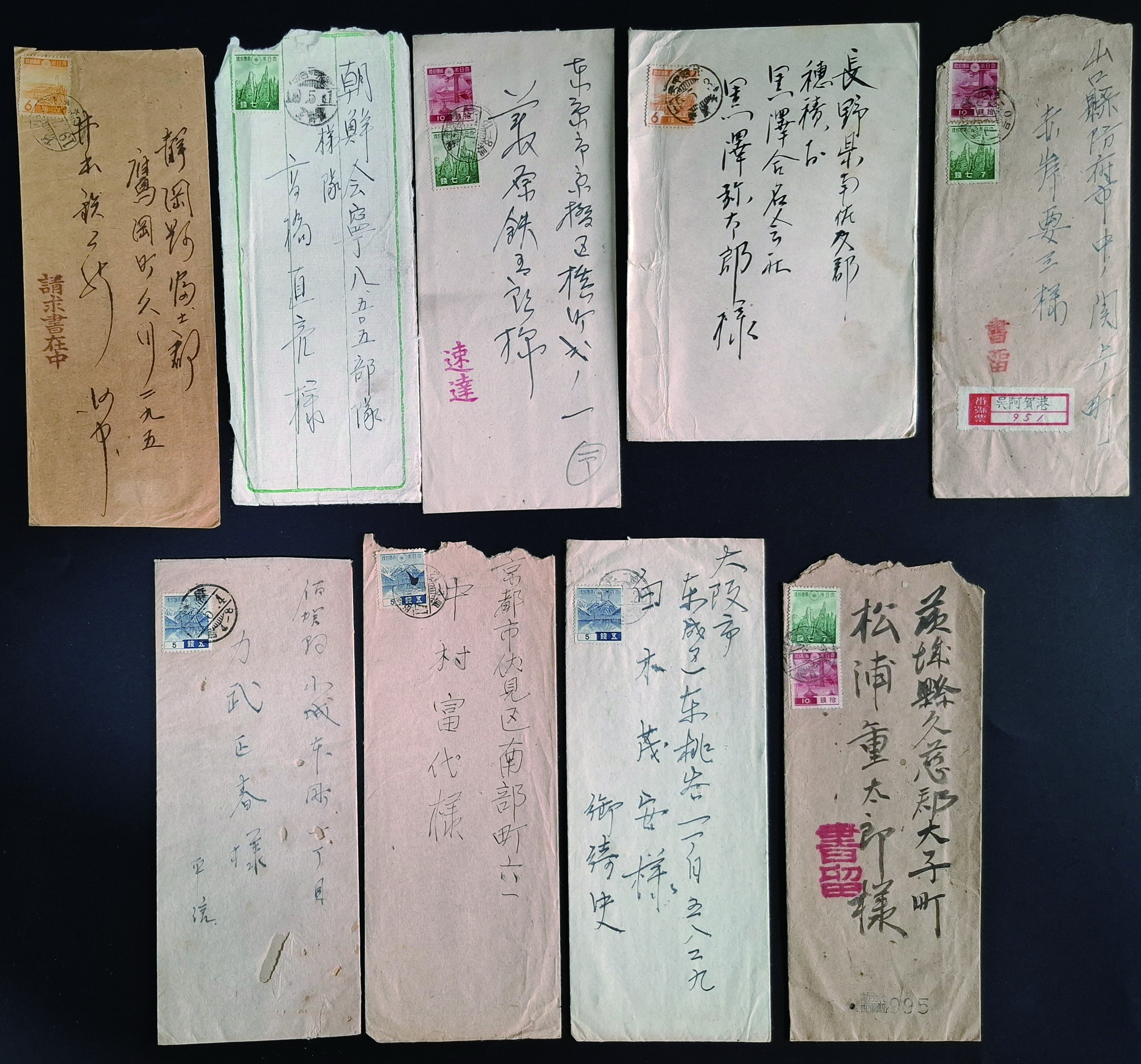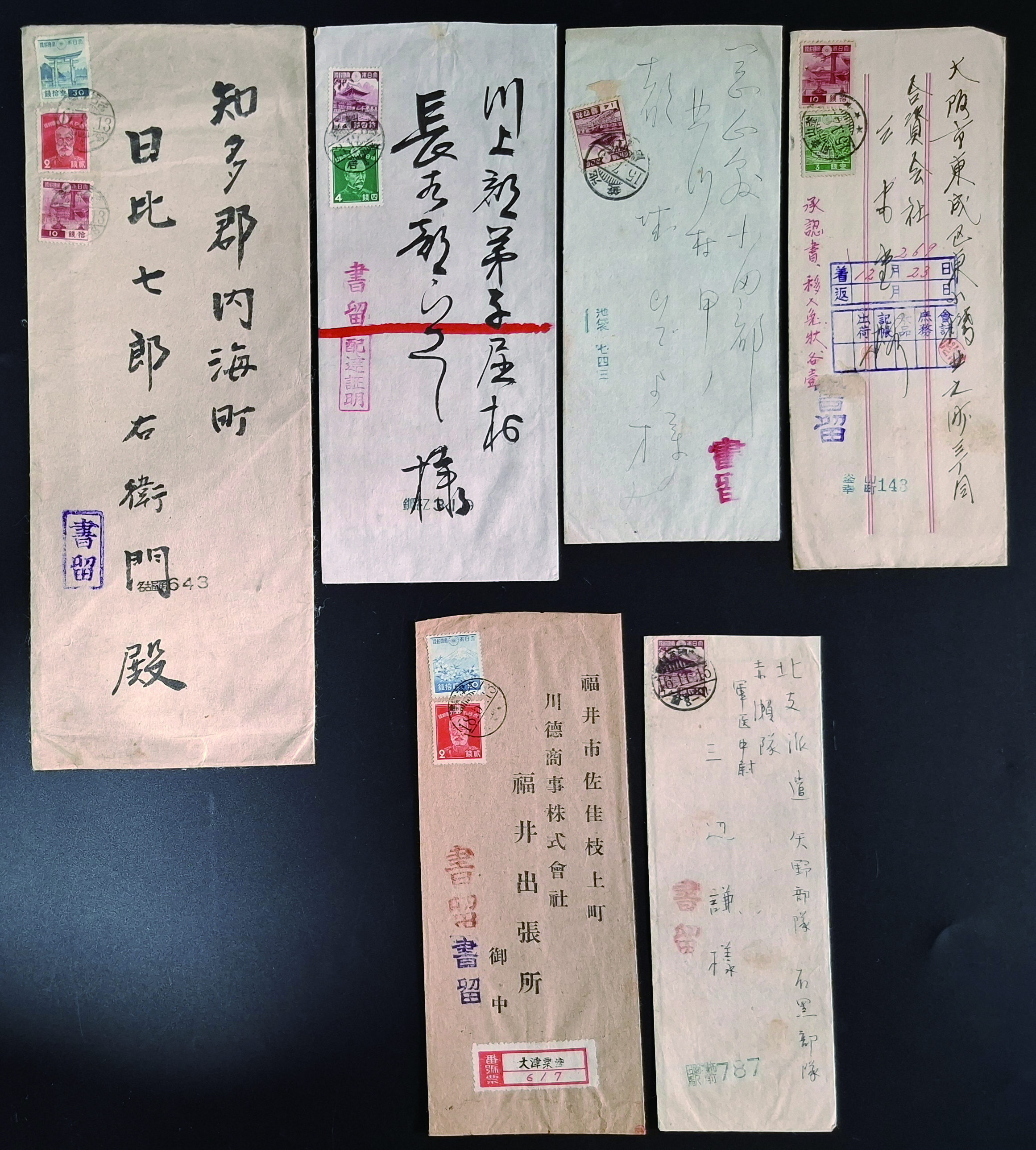 カテゴリー:3次昭和・新昭和(復興時期の切手)カバーロット , 2 covers 1946-1948 issue 1 Yen , 10 Yen , 50 Yen , 1948 issue 10 Yen airmail , letter, vague cancellation,最低値: 20,000 円