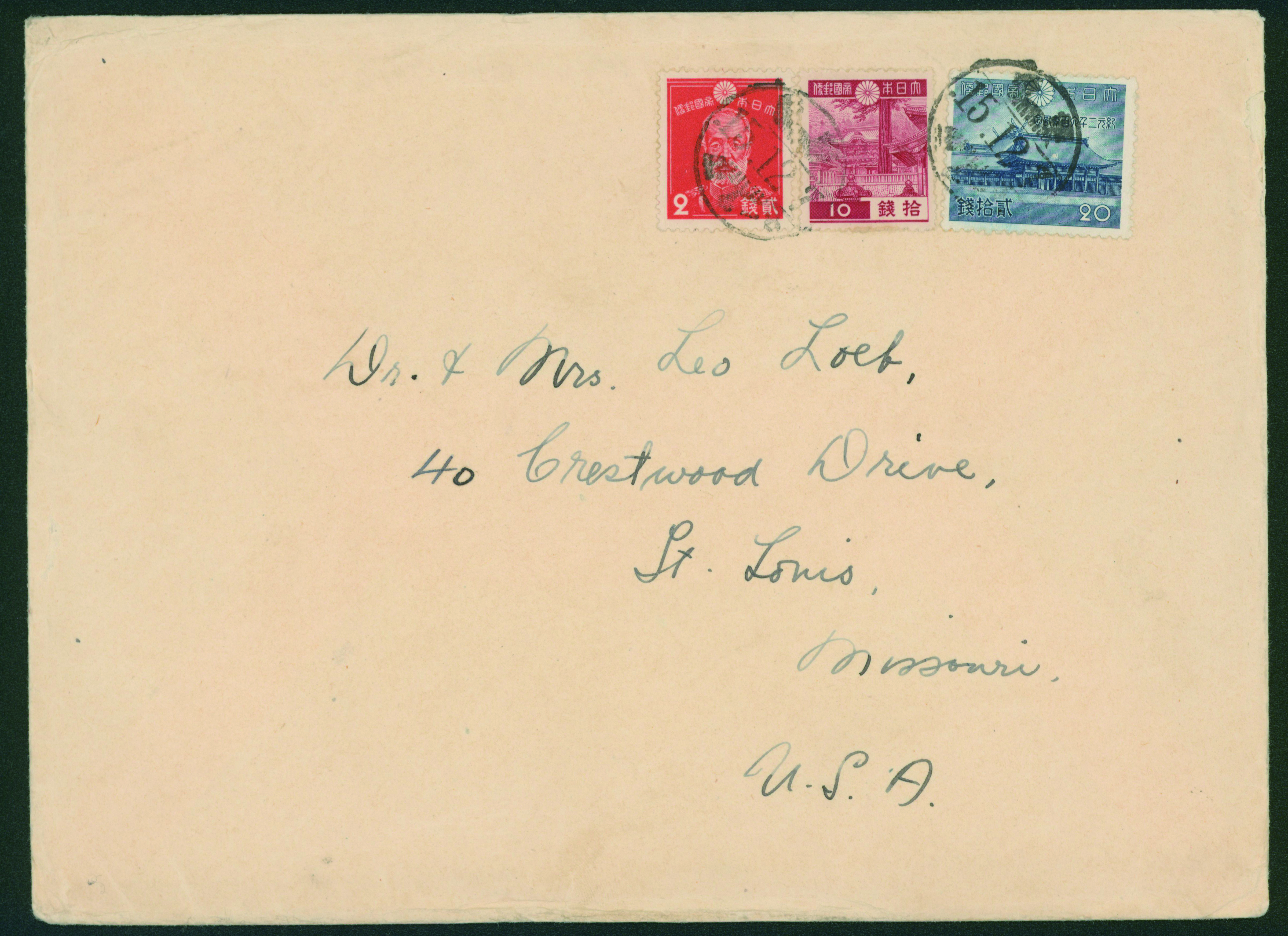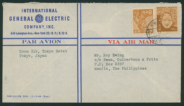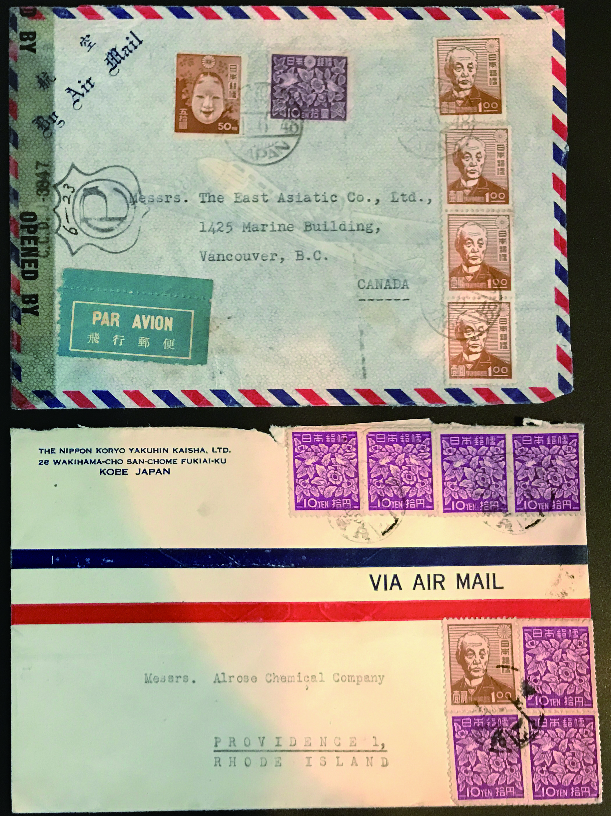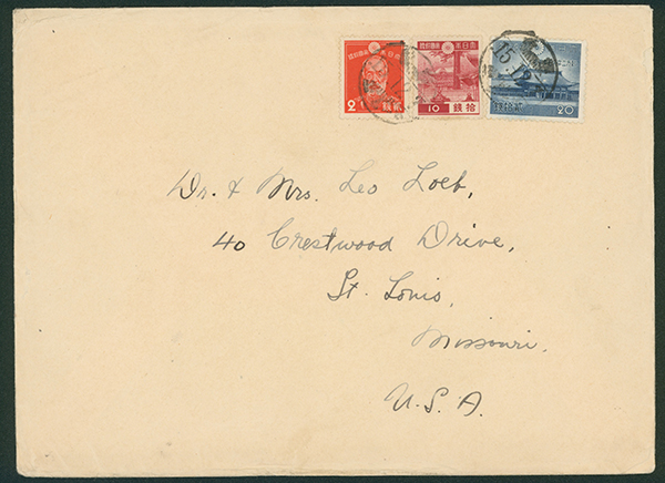 カテゴリー:3次昭和・新昭和(復興時期の切手)カバーロット , 2 covers 1946-1948 issue 1 Yen , 10 Yen , 50 Yen , 1948 issue 10 Yen airmail , letter, vague cancellation,最低値: 20,000 円