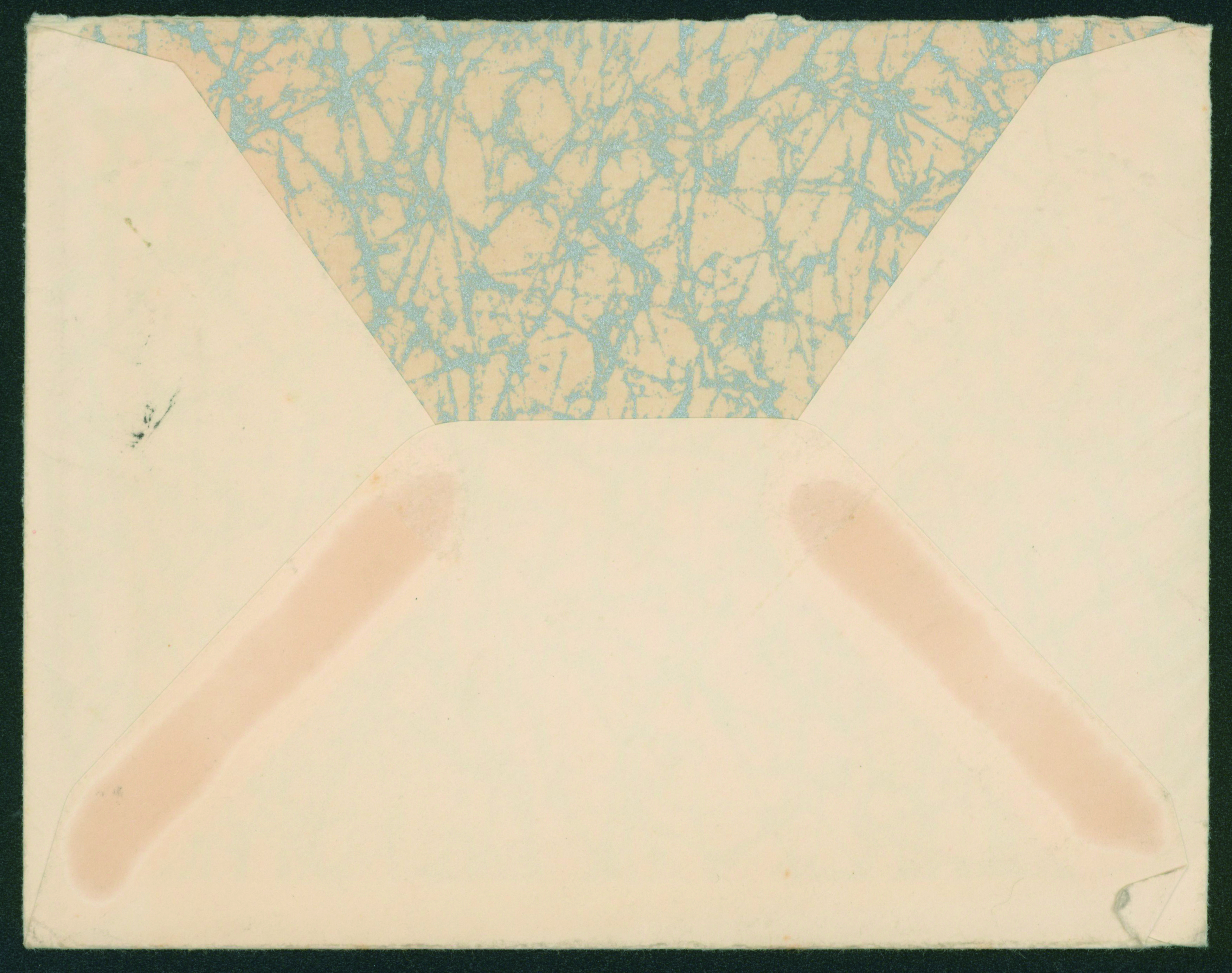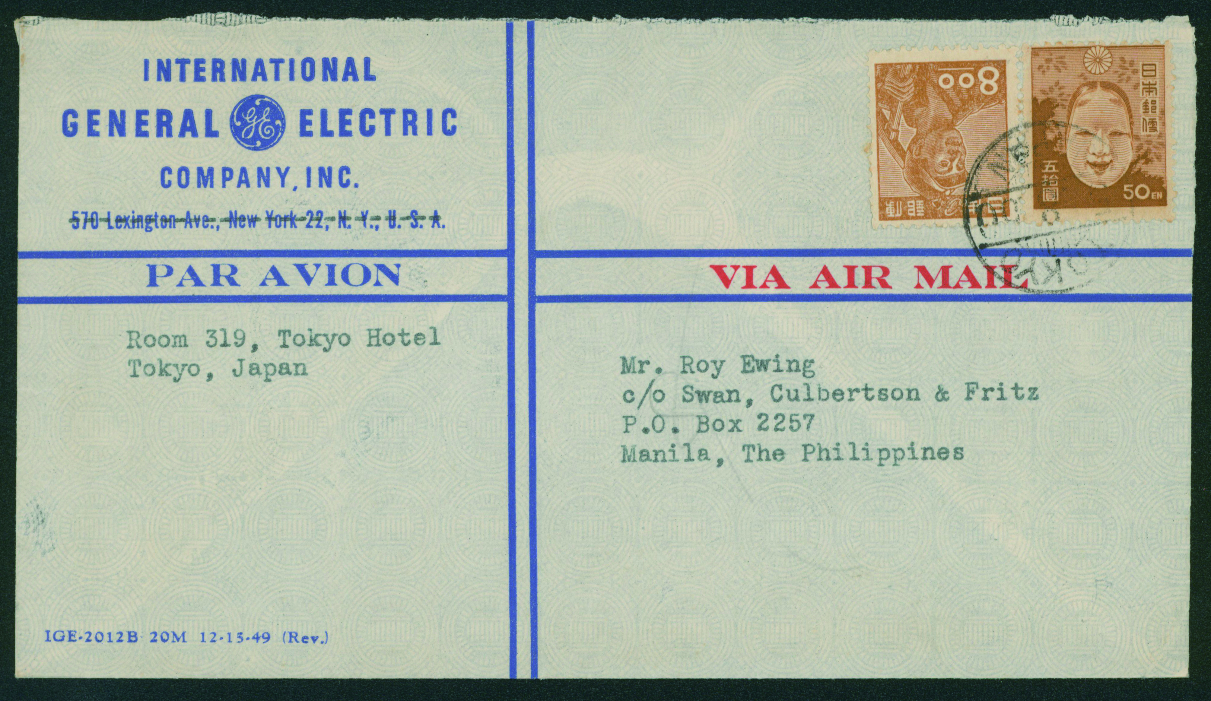 [使用例] カバー2通 それぞれ 前島1.00円, 螺鈿横10円, 能面50円目打あり, 螺鈿縦10円 などを貼り 航空 書状 消印不鮮明