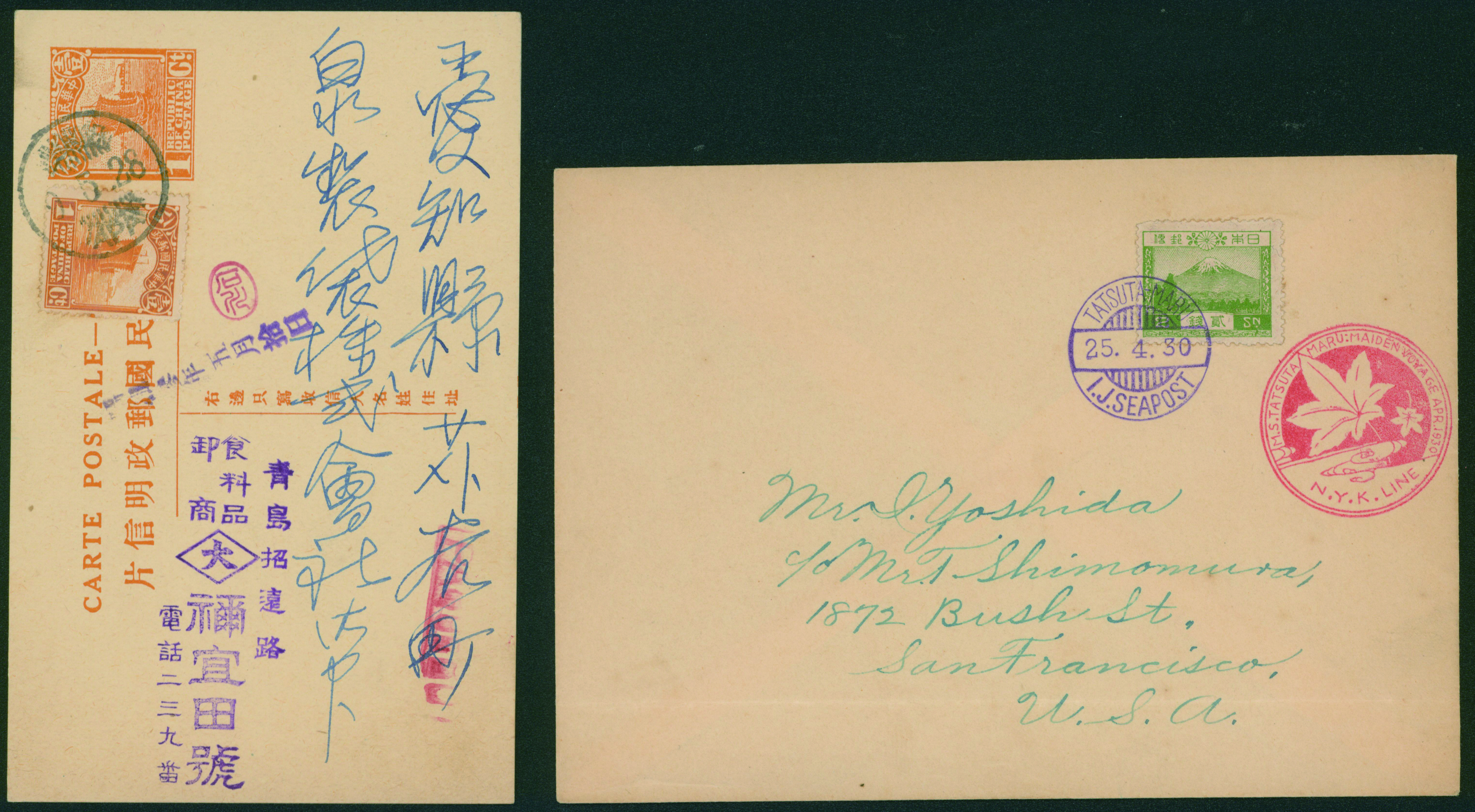 カテゴリー:船内印・パクボー 2 examples 1926 Landscape issue 2 Sen single franking cancelled by roman letter comb cds in purple 1930-04-25 TATSUTA-MARU and a Chinese Paquebot postal card cancelled at Shimonoseki最低値: 20,000 円