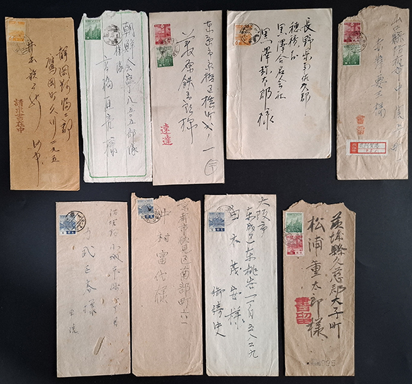 カテゴリー:1次・2次昭和(大ロット) , 9 covers 1937-1940 issue 5 Sen, 6 Sen, 7 Sen cancelled by comb cds最低値: 3,000 円