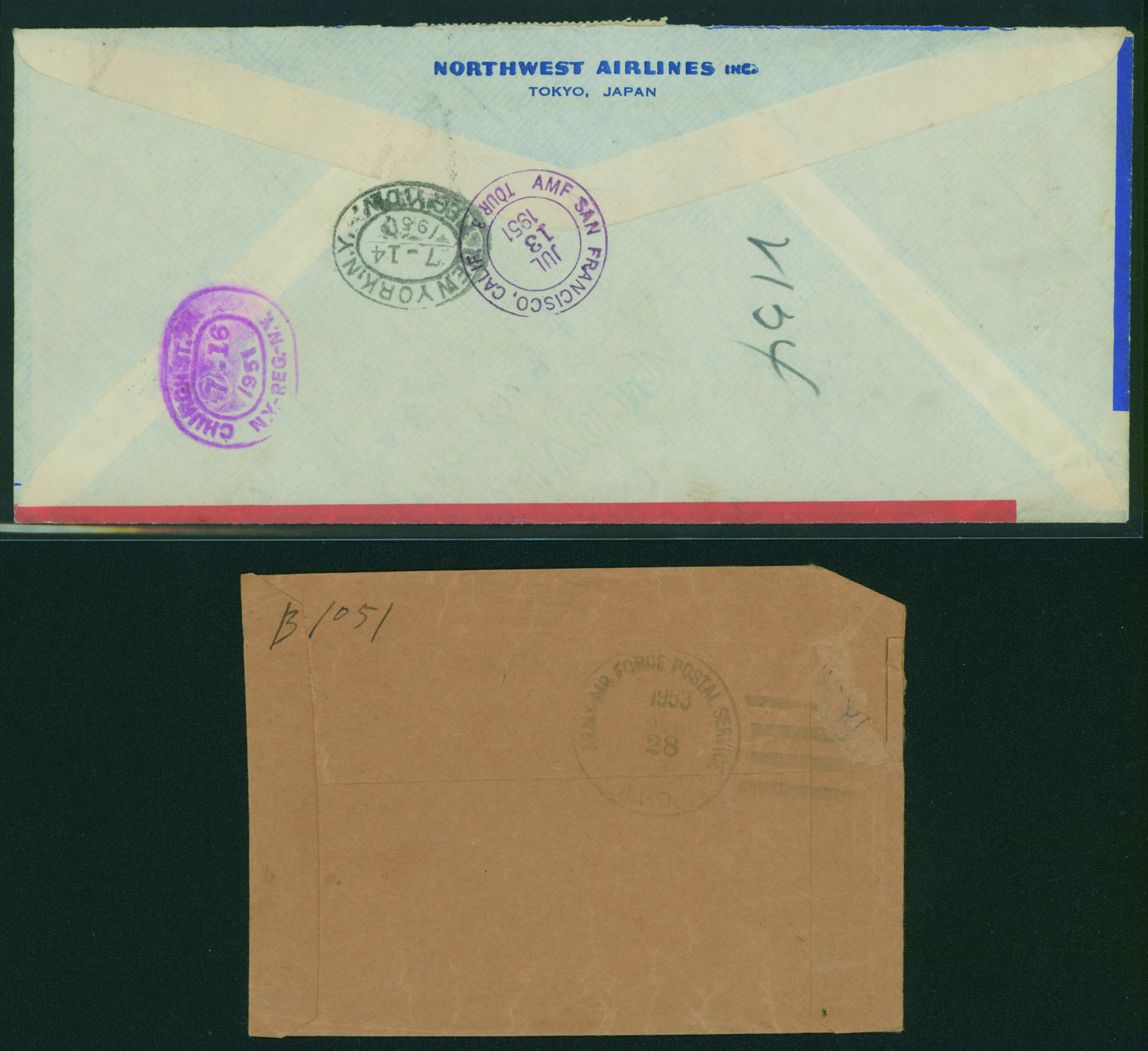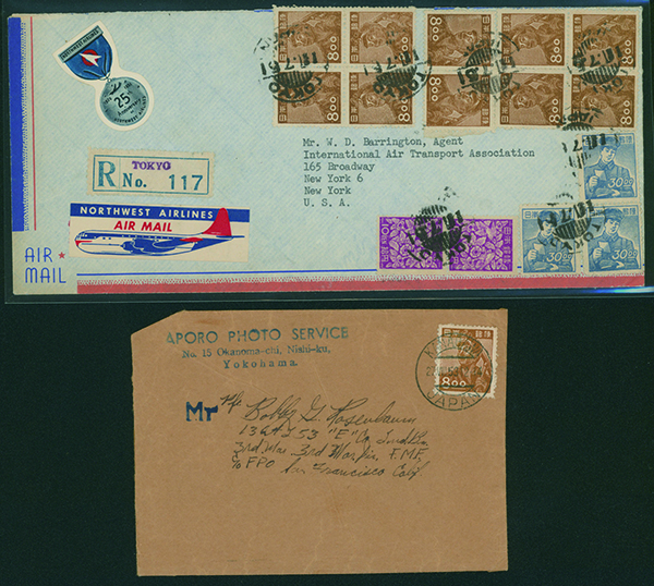 [使用例] カバー2通 炭鉱夫8円10枚, 郵便配達30円3枚, 螺鈿縦10円ペア 単貼り 欧文櫛型印 1951-07-11 TOKYO→SANFRANCISCO→米国 到着印:NEW YORK 1951-07-16 書留外信航空書状重量便 と、炭鉱夫8円単貼り APOメール 欧文三日月印 1958-8-28 KANAGAWA 到着印:ARMYPOSTALSERVICE A.P.O. 1958-08-28 重量便