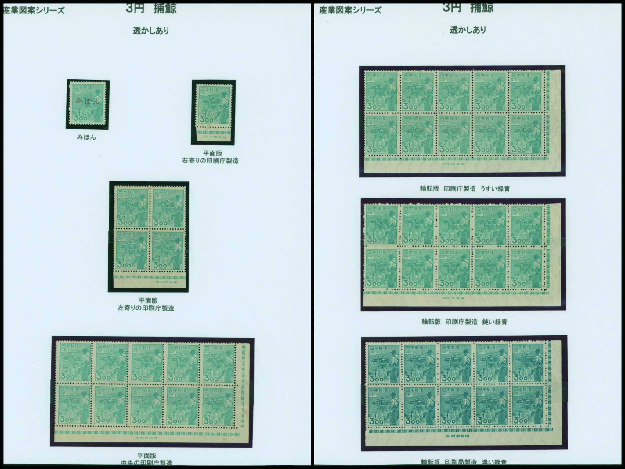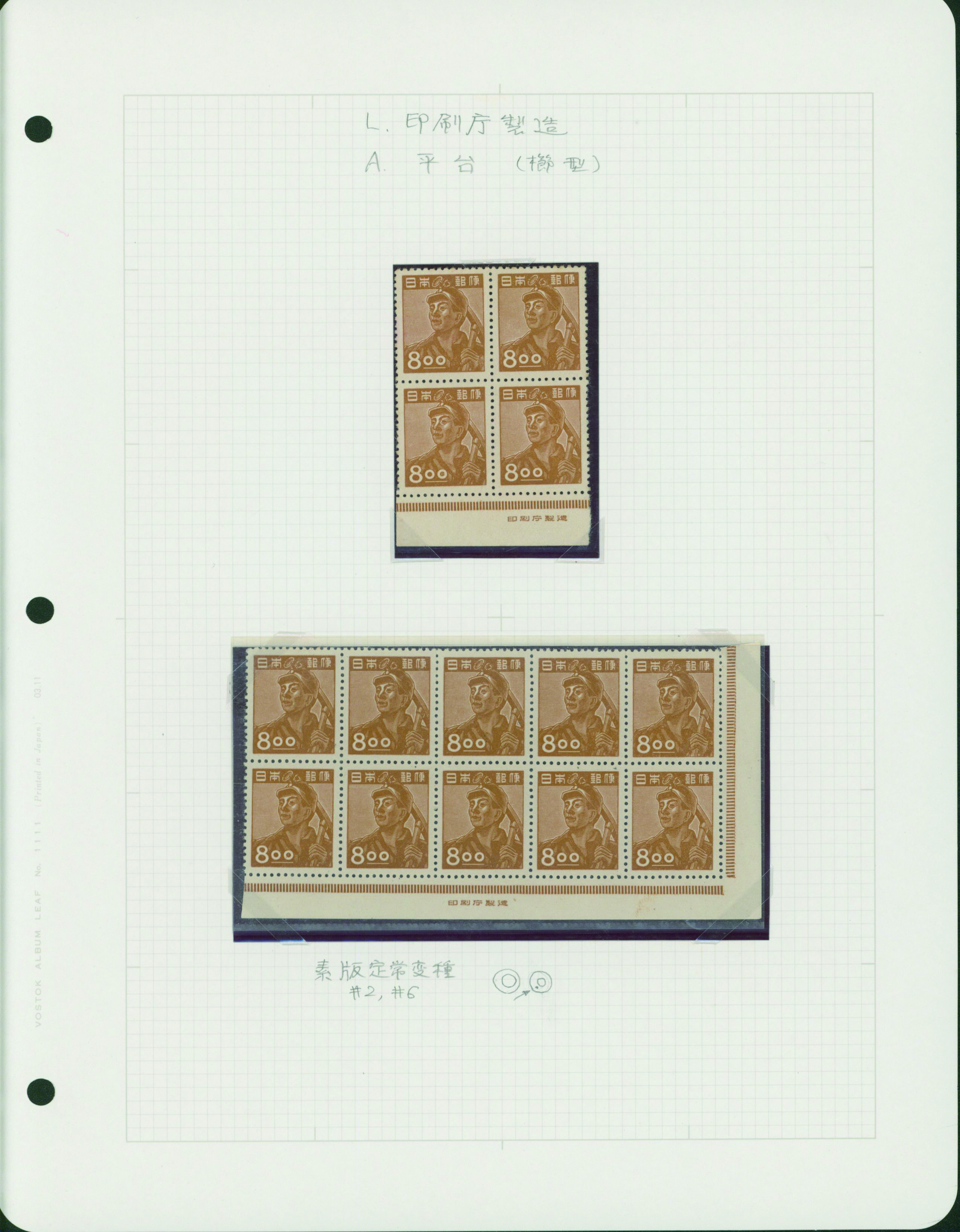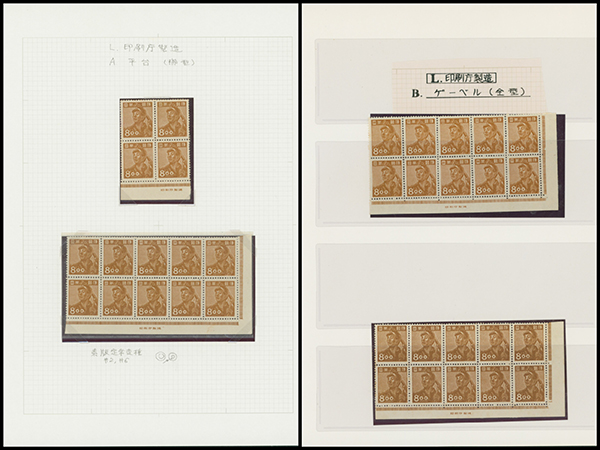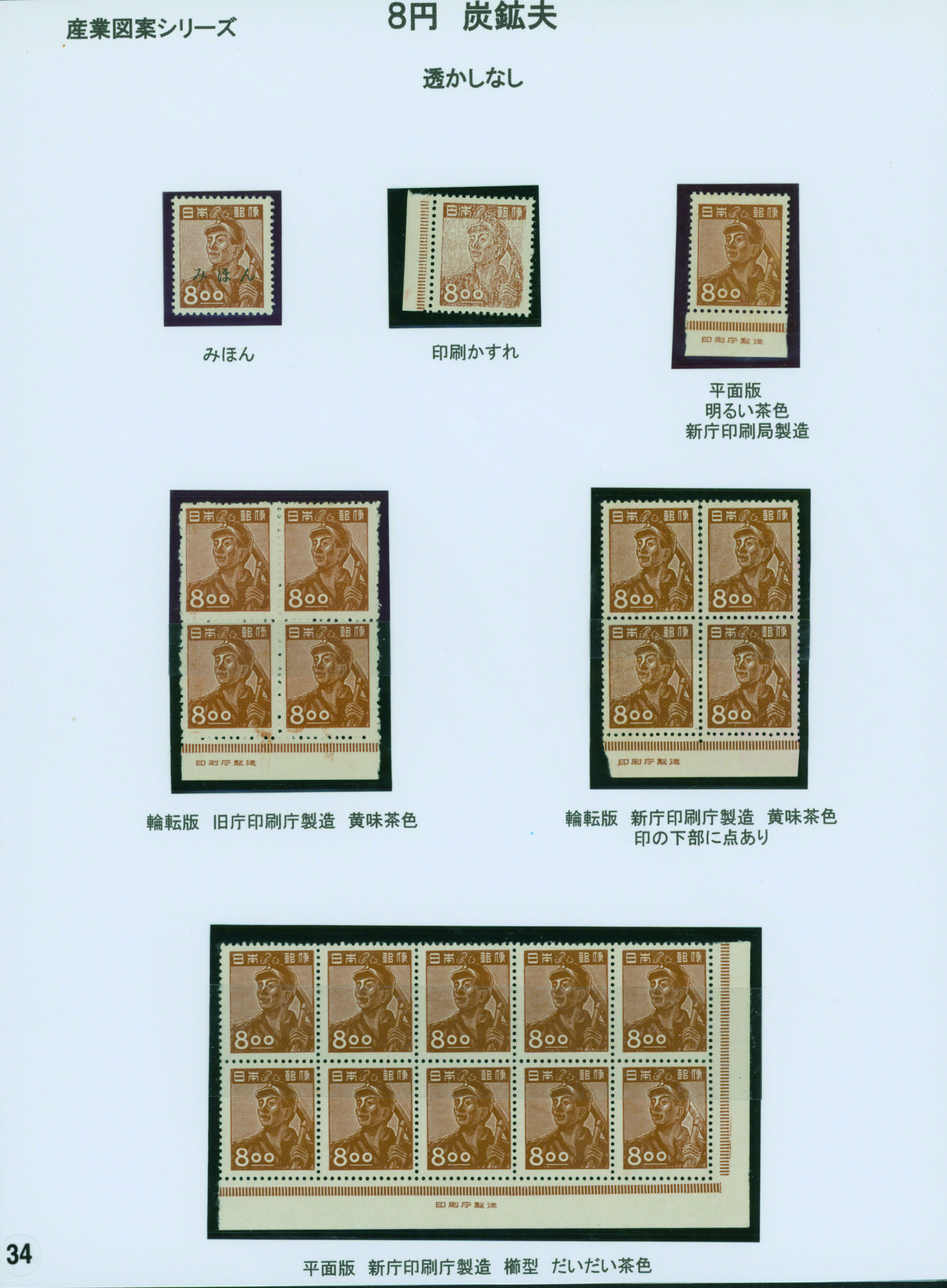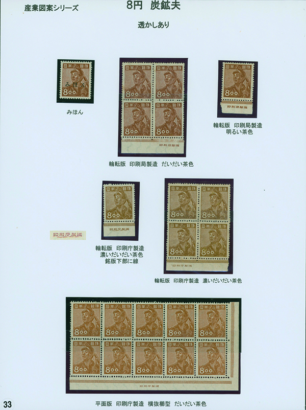 [未] [Collection] 産業 炭鉱夫8円 未使用 「みほん」加刷 銘版付き田型ブロック2点(印刷局と印刷庁)や銘版付き10枚ブロック(横抜櫛型目打 印刷庁)と単片(印刷局)、印刷バラエティーを含む ヒンジ跡あり シミ等あるものあり 専門家により分類されリーフへ綺麗に整理されている