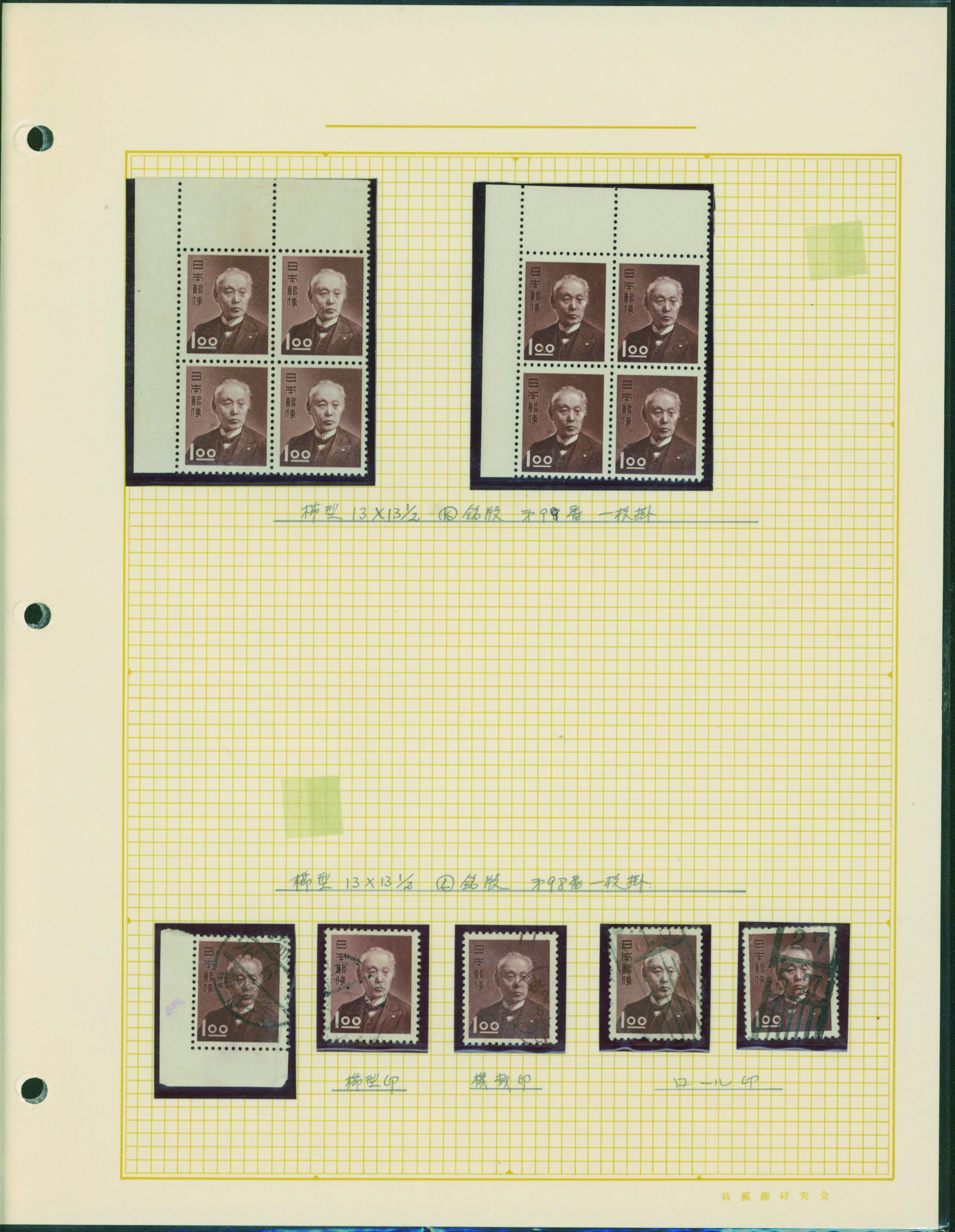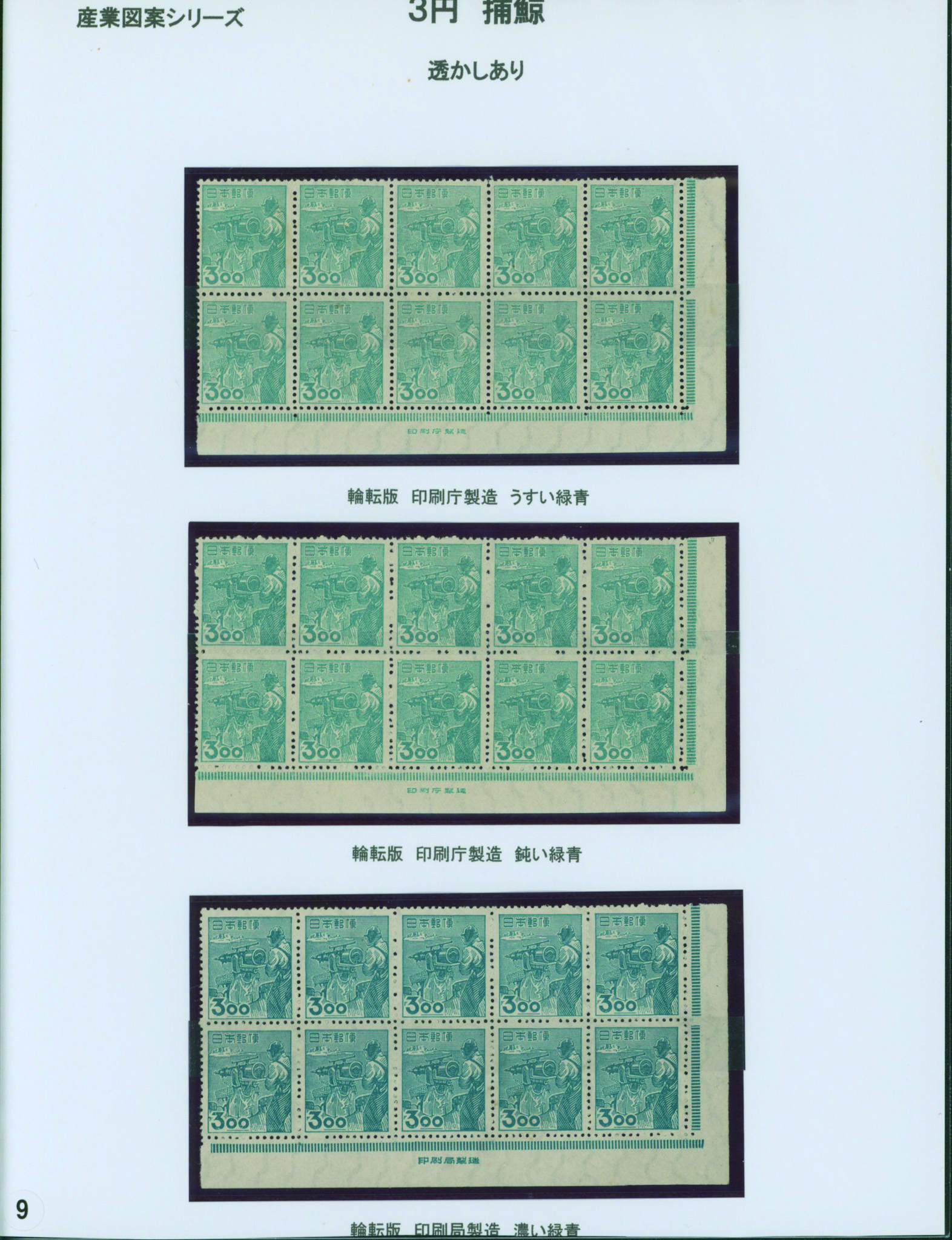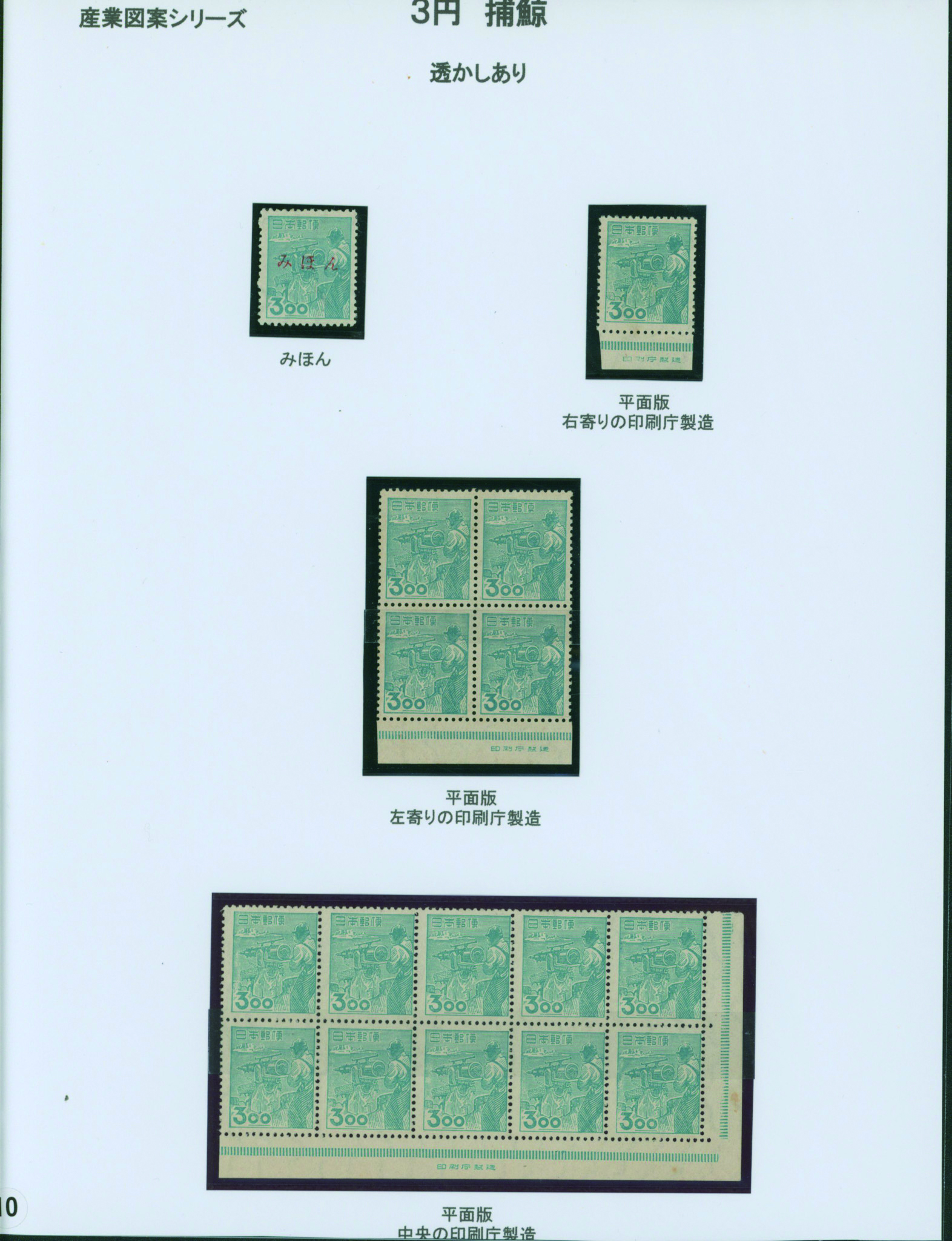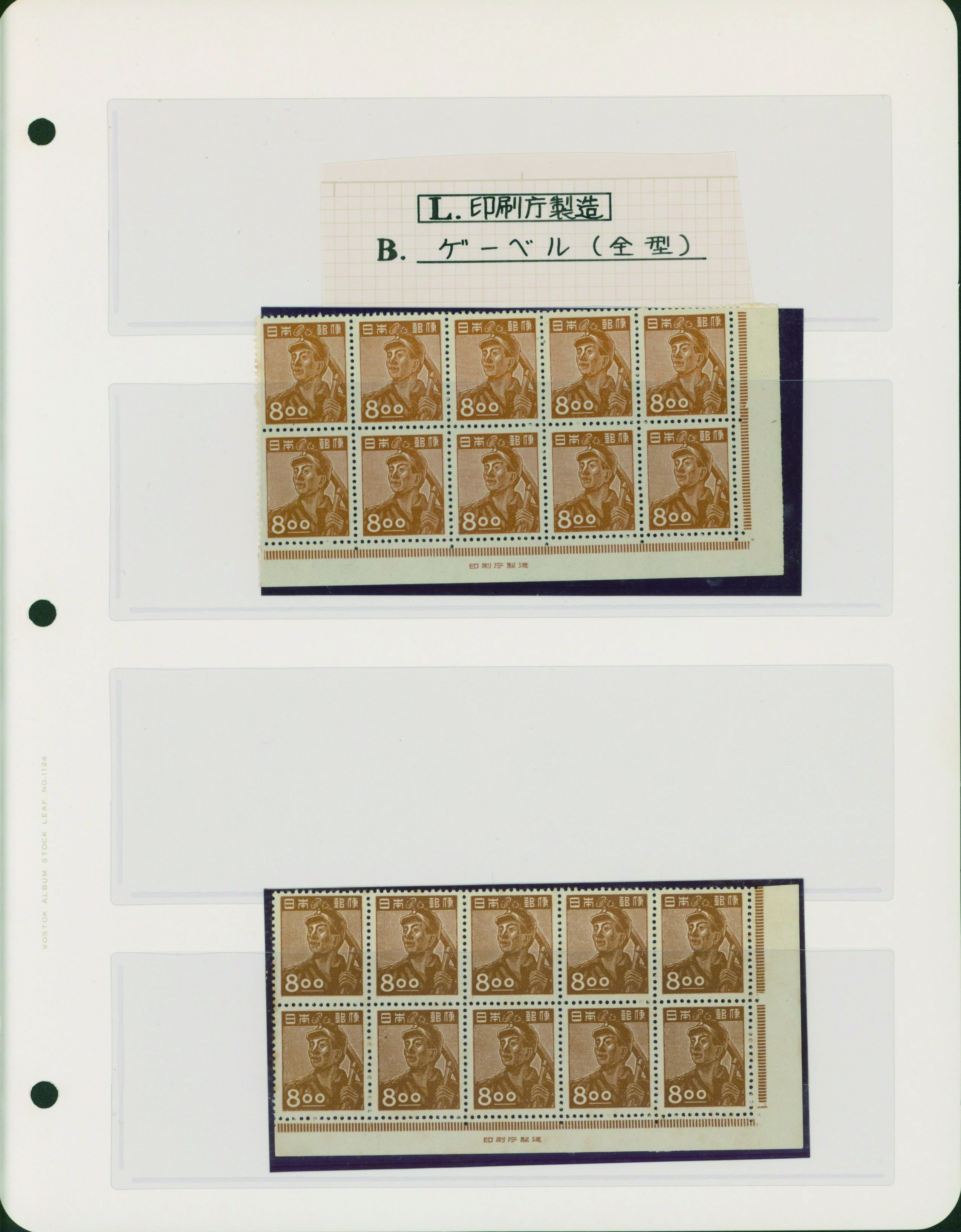 [未] [Collection] 産業 炭鉱夫8円 未使用 「みほん」加刷 銘版付き田型ブロック2点(印刷局と印刷庁)や銘版付き10枚ブロック(横抜櫛型目打 印刷庁)と単片(印刷局)、印刷バラエティーを含む ヒンジ跡あり シミ等あるものあり 専門家により分類されリーフへ綺麗に整理されている