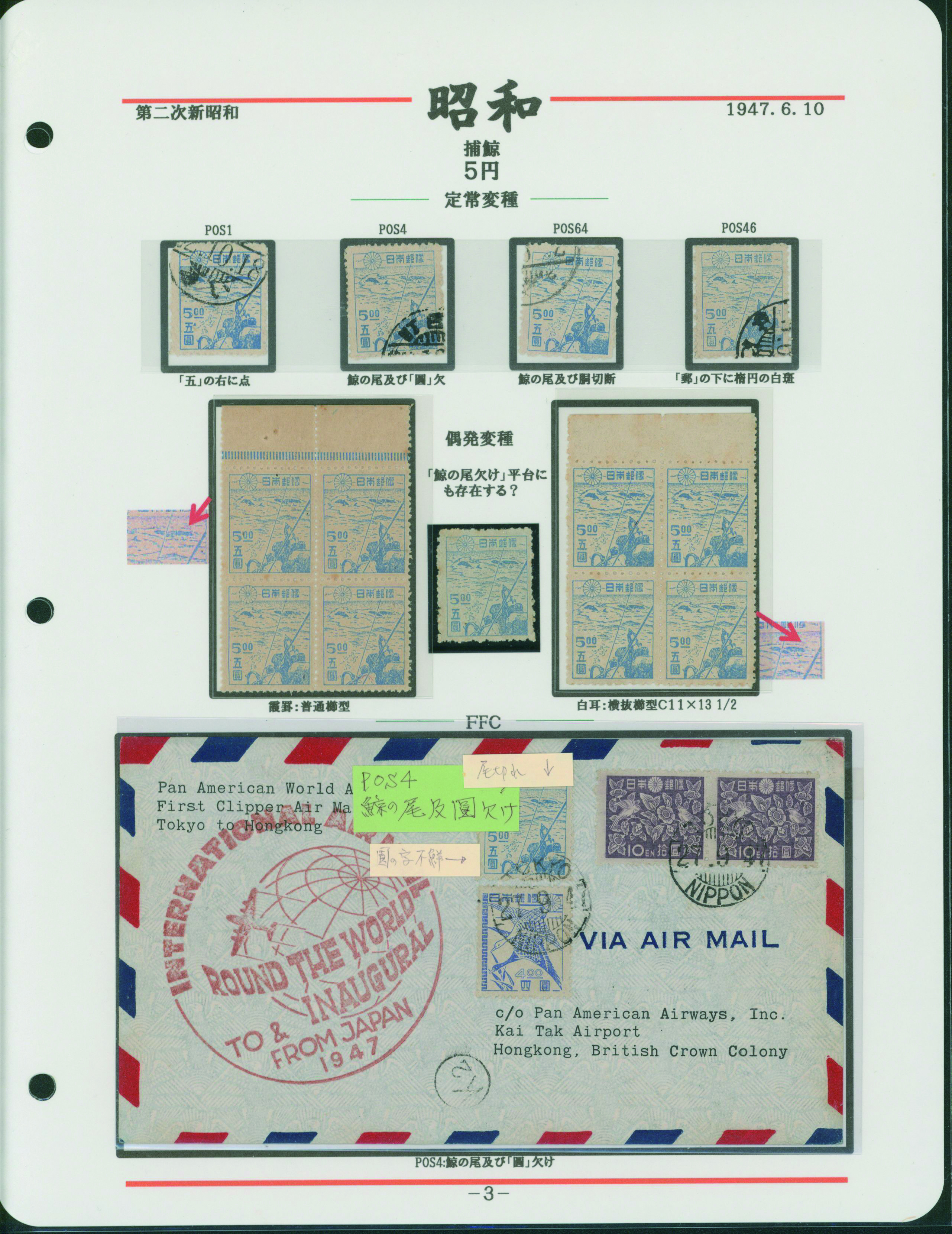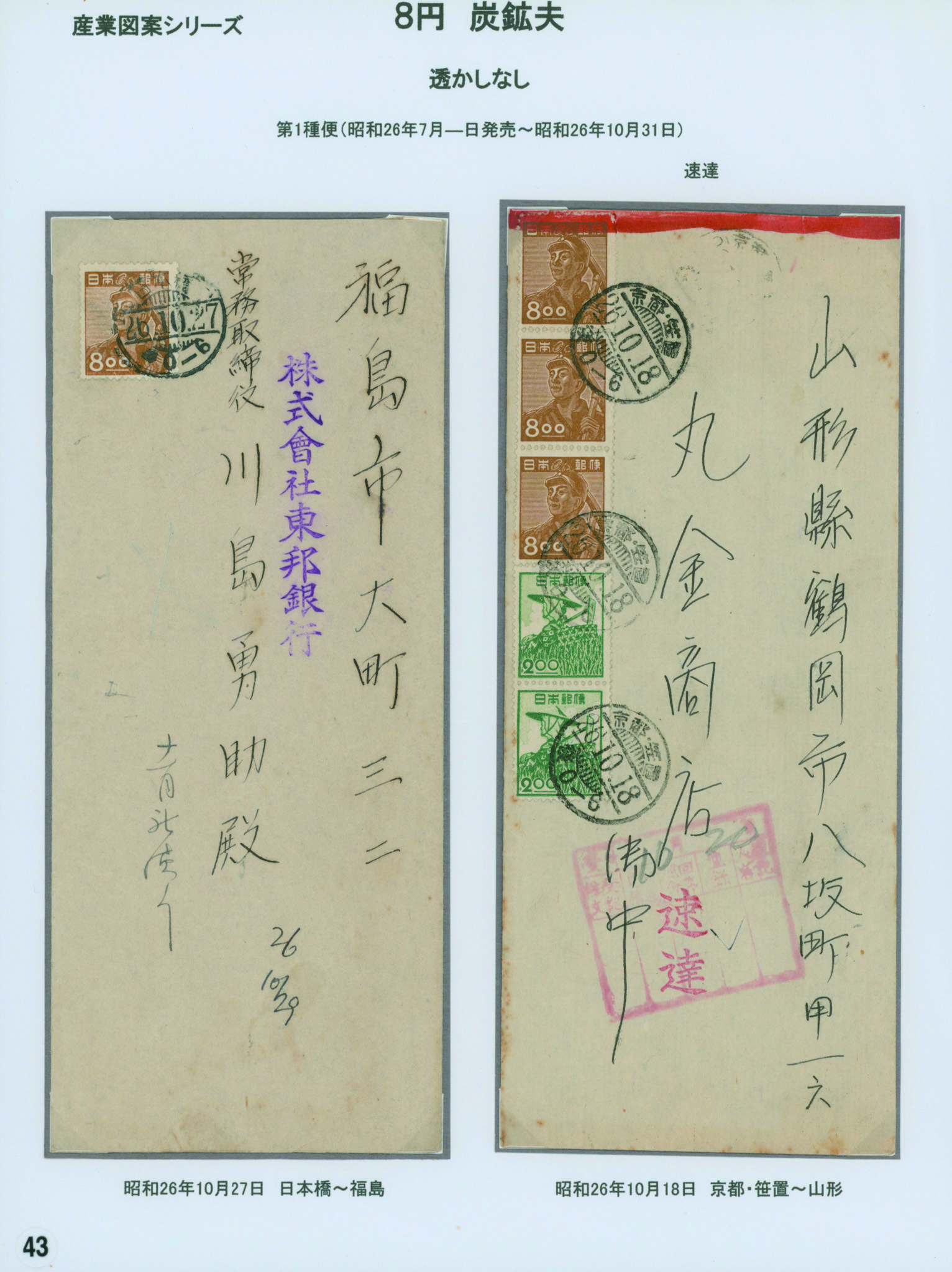 [使用例] カバー2通 透かし無し 炭鉱夫8円 櫛型印 昭和26 10 27 日本橋 と、3枚ストリップ 農夫2円ペア貼り 櫛型印 昭和26 10 18 京都・笠置 書状速達 専門家によるリーフに綺麗に整理されている