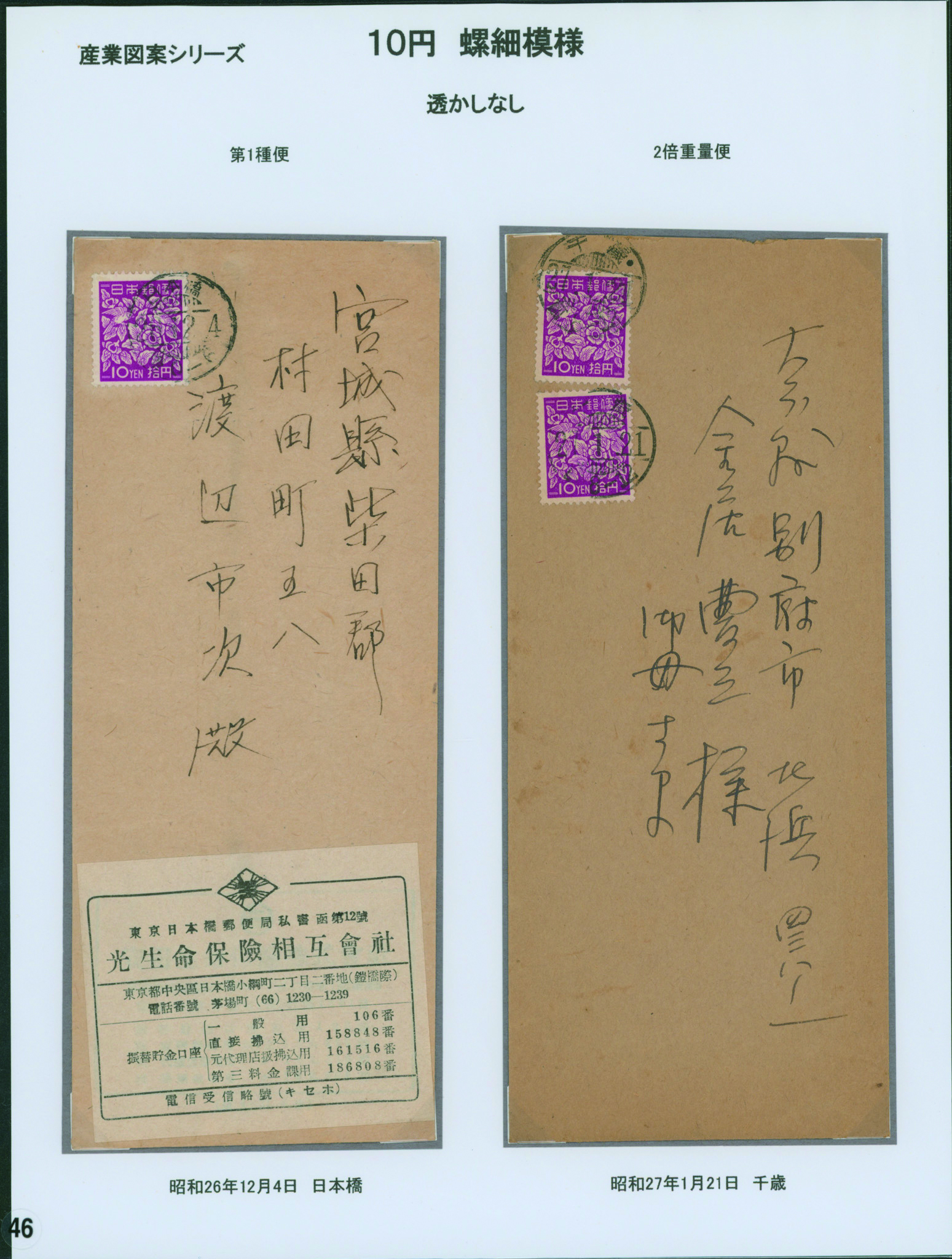 [使用例] カバー2通 透かし無し 螺鈿縦10円 単貼り 櫛型印 昭和26 12 4 日本橋 と、2枚貼り 櫛型印 昭和27 1 21 千歳 書状 専門家によるリーフに綺麗に整理されている