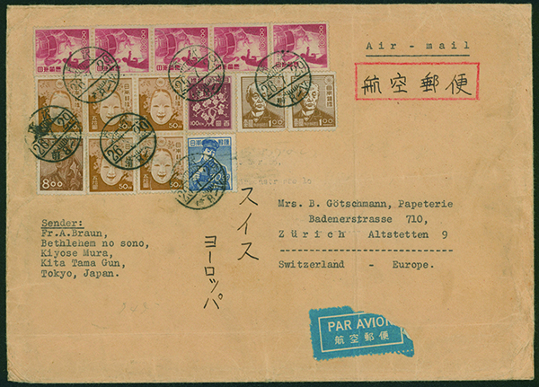 カテゴリー:産業図案・透かし無し カバー(横方向) 1948-1949 issue 100 Yen , 8 Yen , 30 Yen , 1946-1948 issue 50 Yen , 100.00 Yen , 1 Yen Multi-color franking cancelled by comb cds 1951-07-29 Tokorozawa to Switzerlandweight letter最低値: 3,000 円