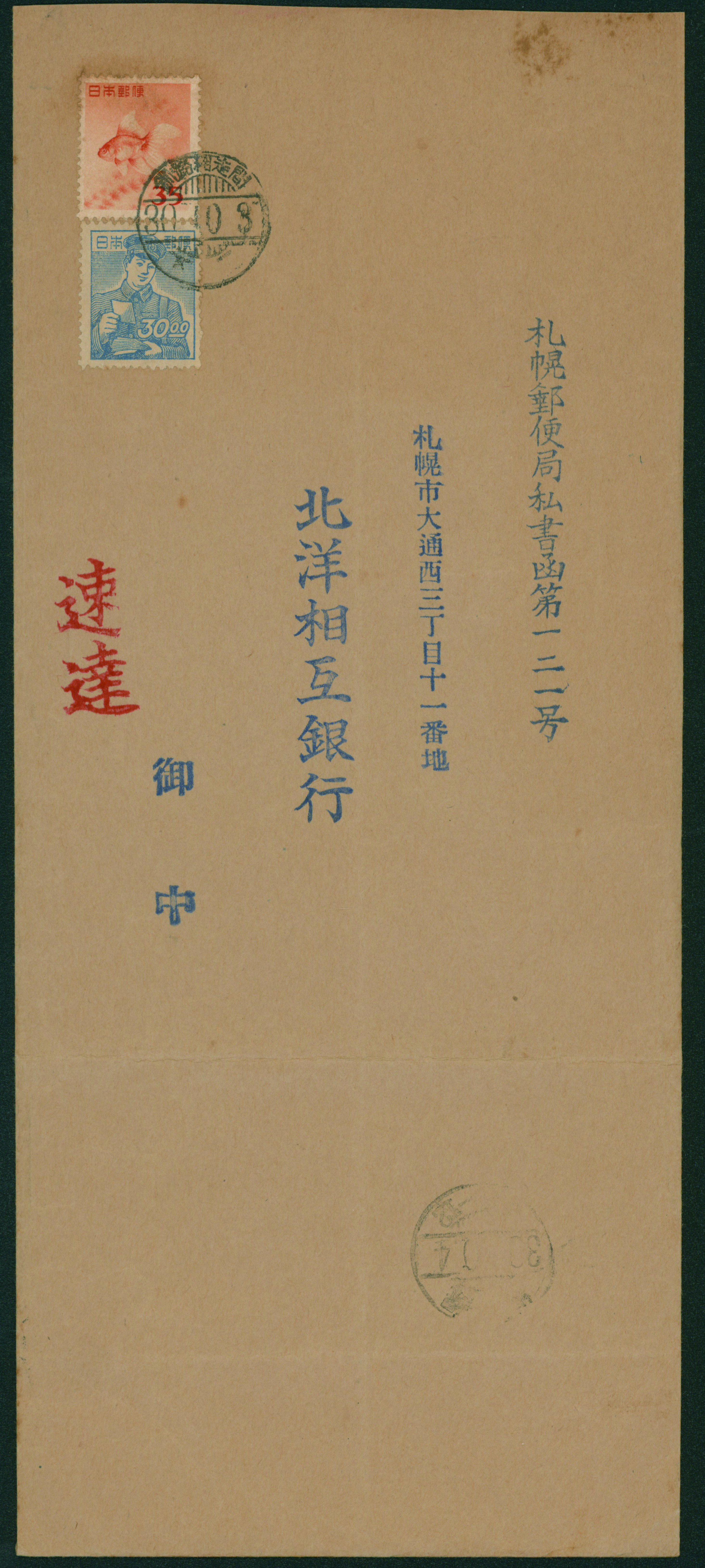 [使用例] 金魚35円, 郵便配達30円 (透かし無し) シミ 鉄郵印 昭和30 10 3 釧路網走間 書状速達重量便 カバー中折れ