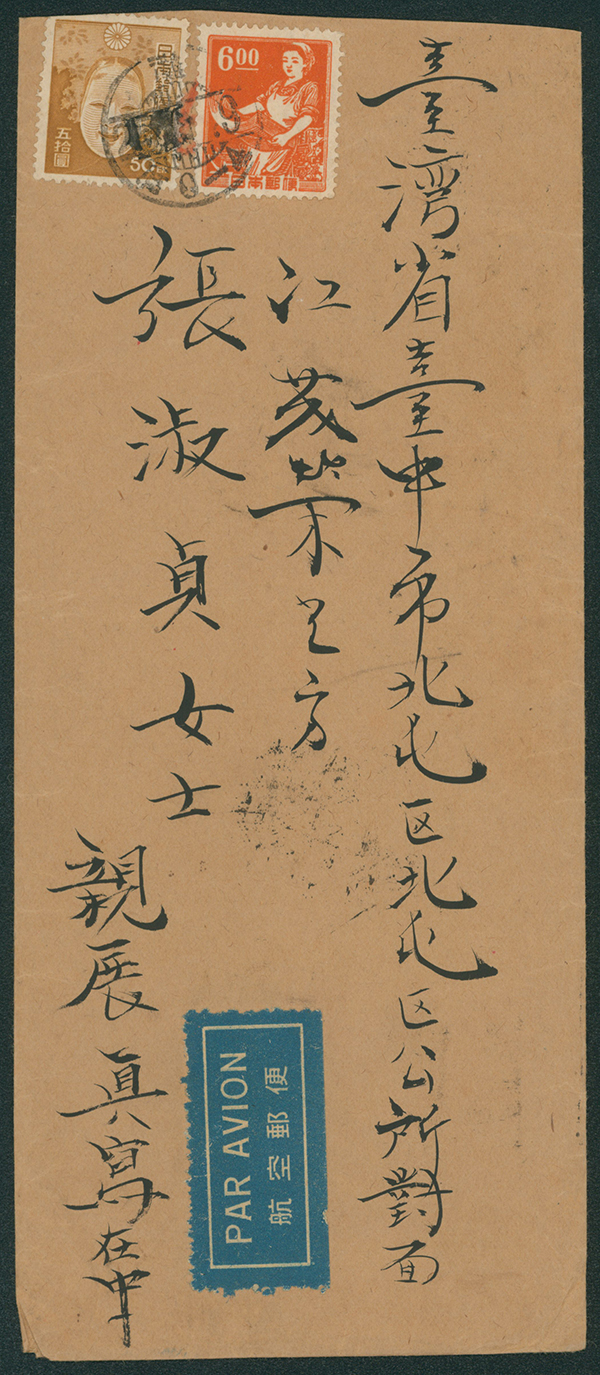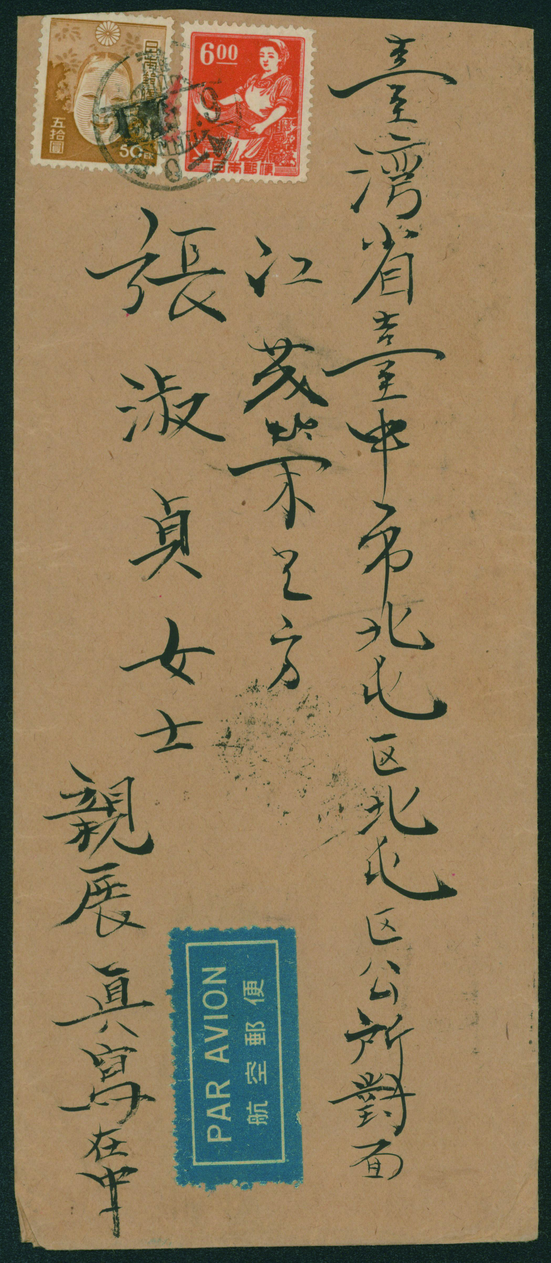 [使用例] 女工6円, 能面50円目打あり シザーカット 櫛型印(日付潰れ) 昭和25 6 9 灘→台湾 到着印:台中 外信航空書状重量便 56 Yen = 24+16*2