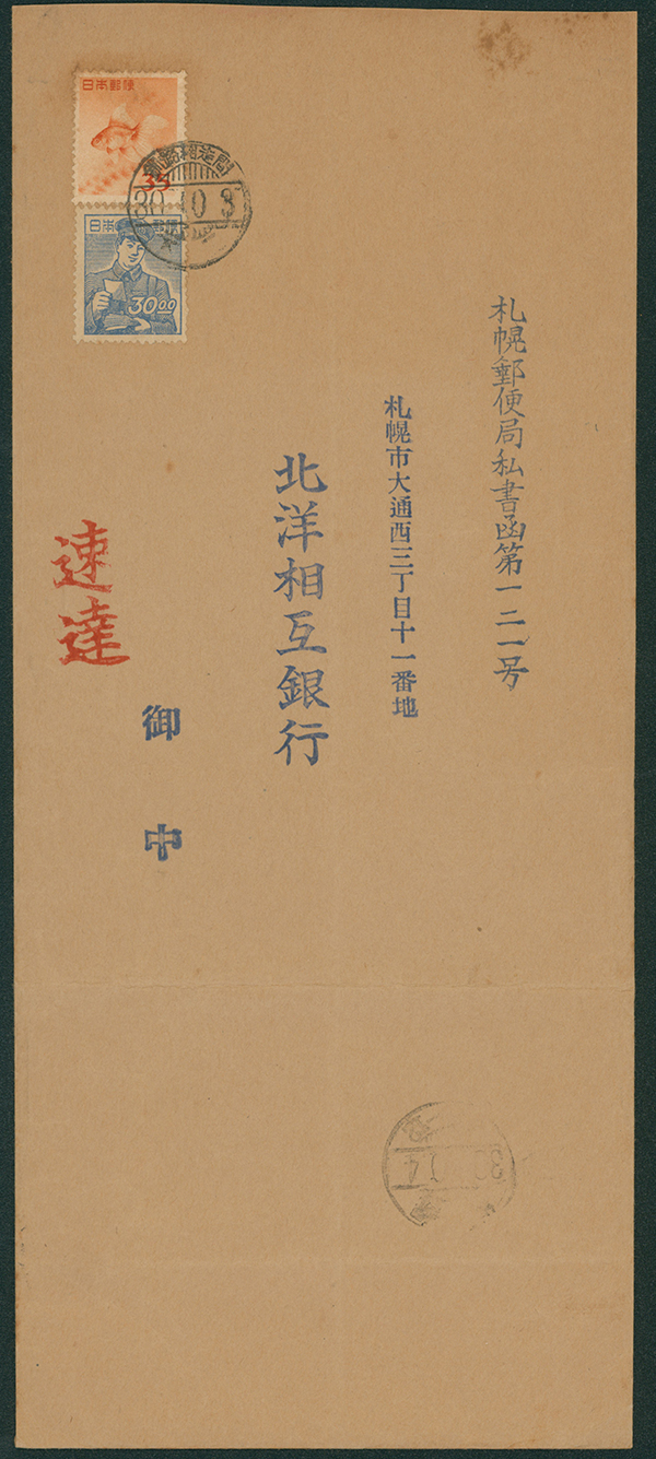 カテゴリー:産業図案・透かし無し カバー(縦方向) 1952-1959 issue 35 Yen , 1948-1949 issue 30 Yen stained, cancelled by train post cancellation 1955-10-03 between Kushiro and Abashiriweight letter最低値: 5,000 円
