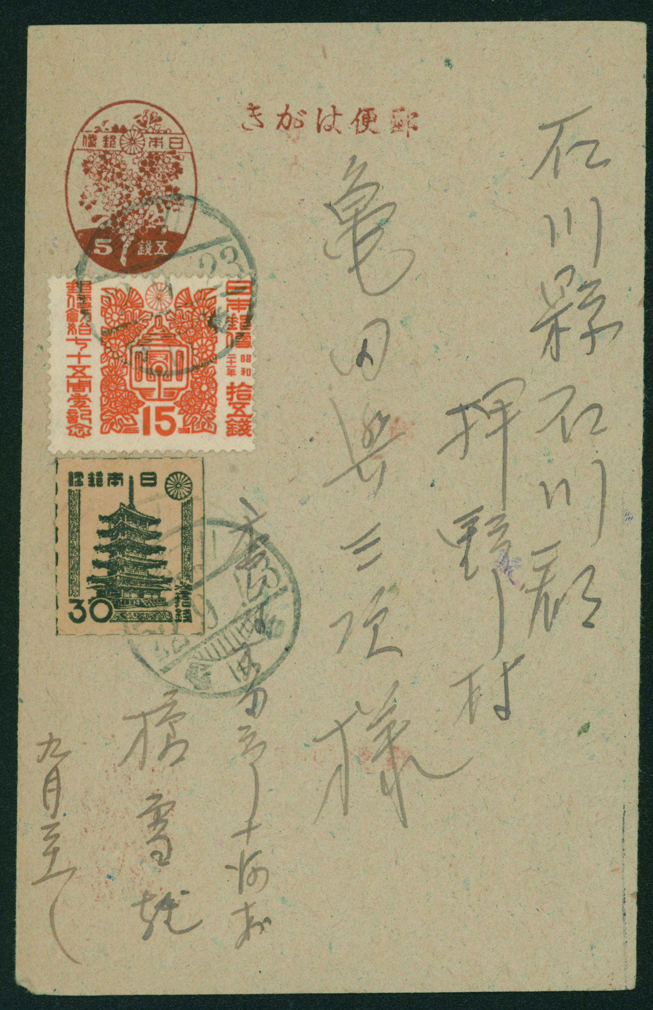[使用例] 桜葉書5銭, 郵便創始75年15銭, 五重塔30銭ルレット 加貼 櫛型印(右書き) 昭和22 9 23 川島(香川県) 葉書