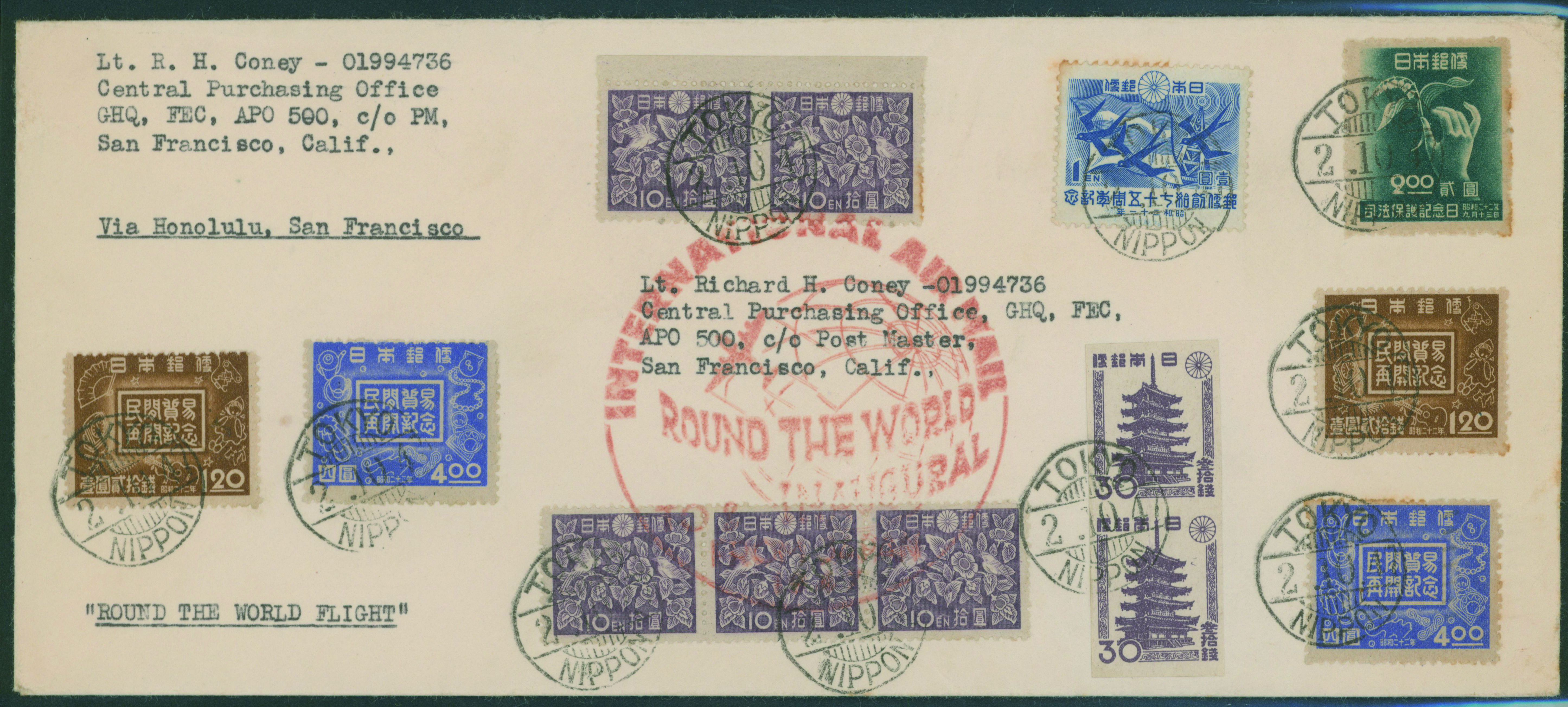 [使用例] 郵便創始75年1円, 民間貿易再開1.2円2枚, 4円2枚, 司法保護記念日, 五重塔30銭無目打ペア, 螺鈿横10円5枚 シミ 欧文櫛型印 1947-10-02 TOKYO→米国 到着印:SAN FRANCISCO,10/4 外信航空書状 カシェ「Round the World(世界一周)」