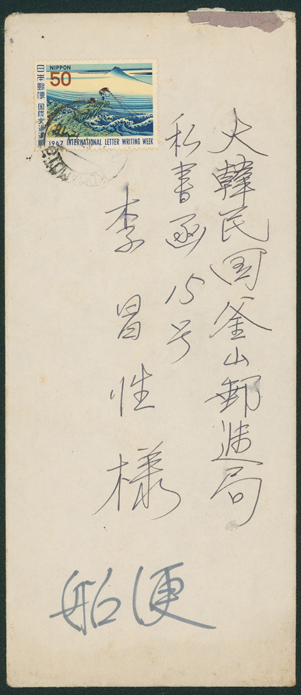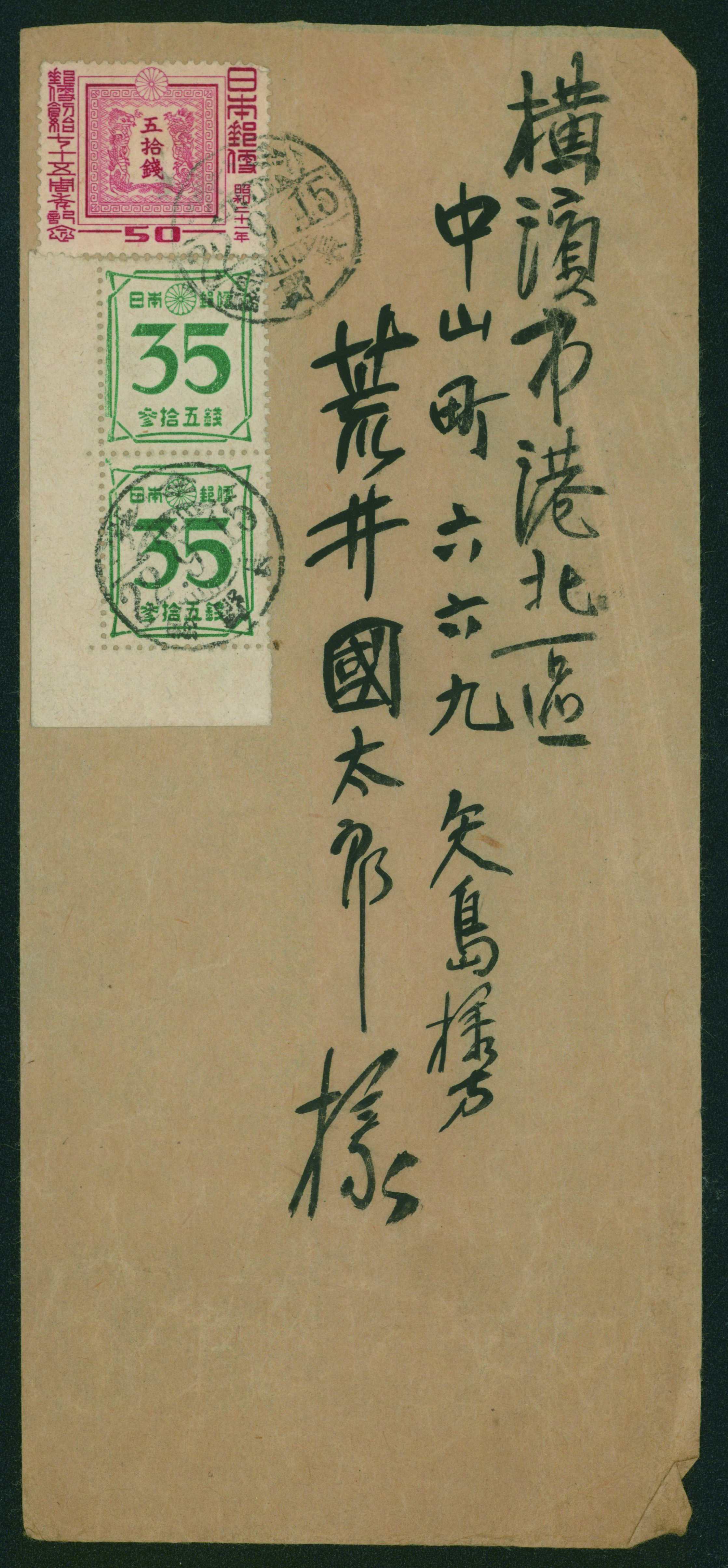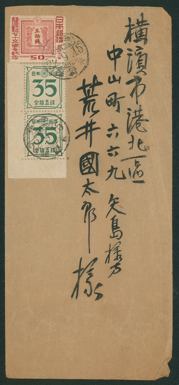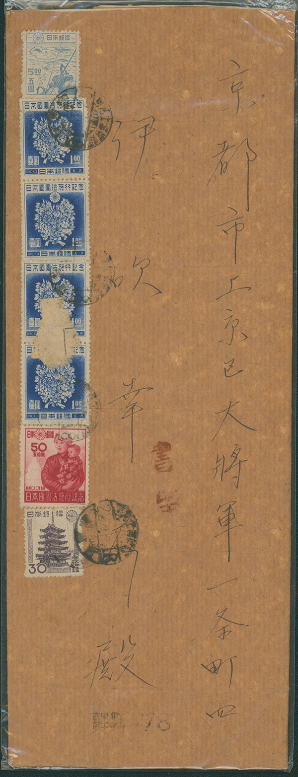 カテゴリー:戦後記念(銭位)カバー 1947 Commemorative stamp 1 Yen, 50 Sen, 1946-1948 issue 30 Sen perf. 国名左書き, 5 Yen cancelled by comb cds 1947-06-18 Kojimachi-fijimicho tag trace,weight letter
