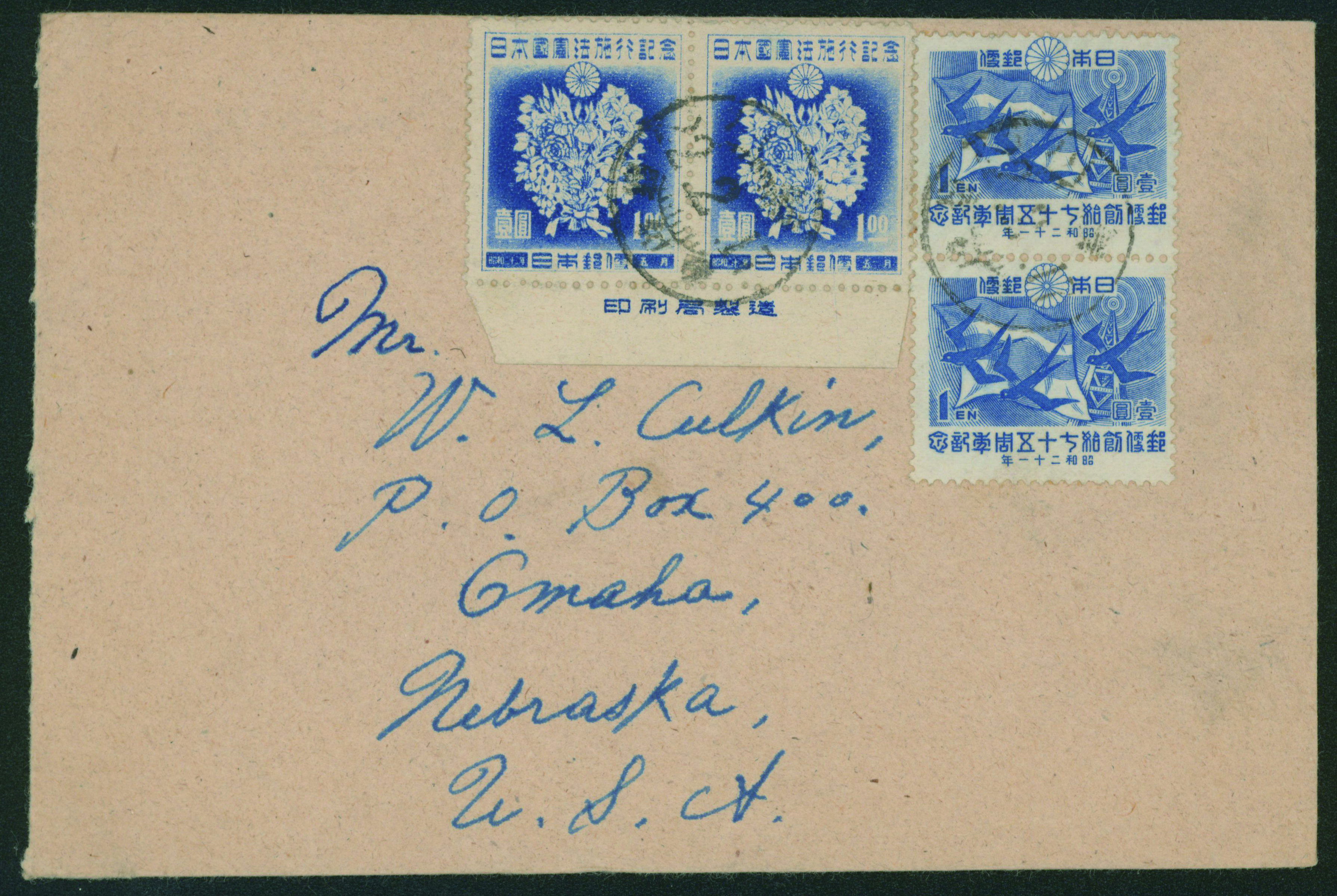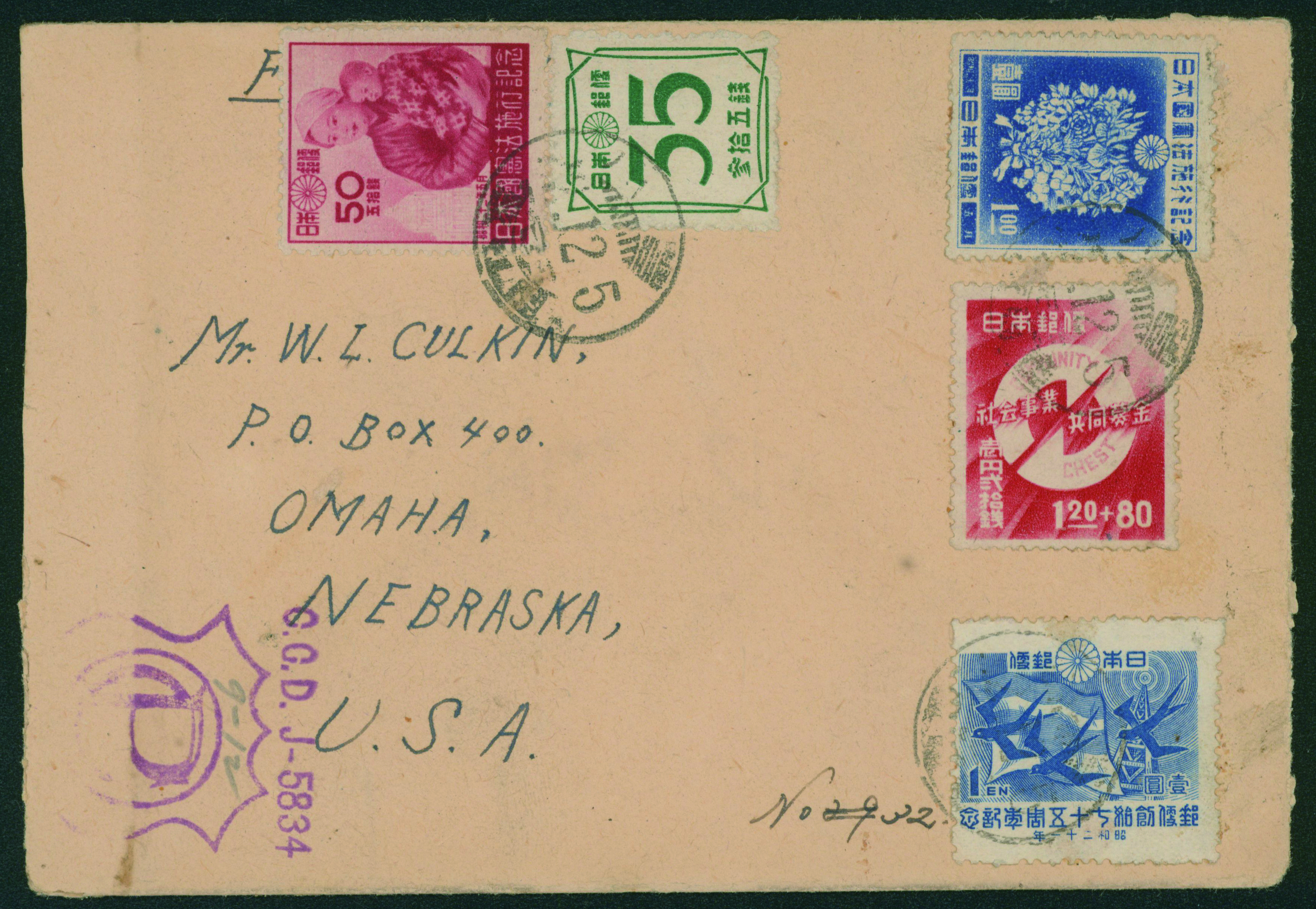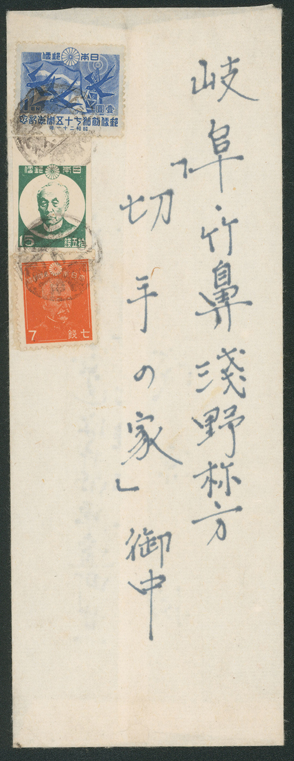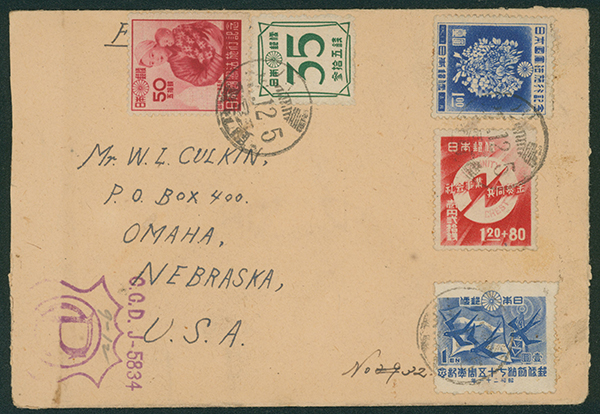 カテゴリー:戦後記念(郵便創始75年)カバー 1946 Commemorative stamp 1 Yen, 1947 Commemorative stamp 50 Sen, 1 Yen, , 1946-1948 issue 35 Sen cancelled by comb cds 1947-12-05 豊川 censored最低値: 3,000 円