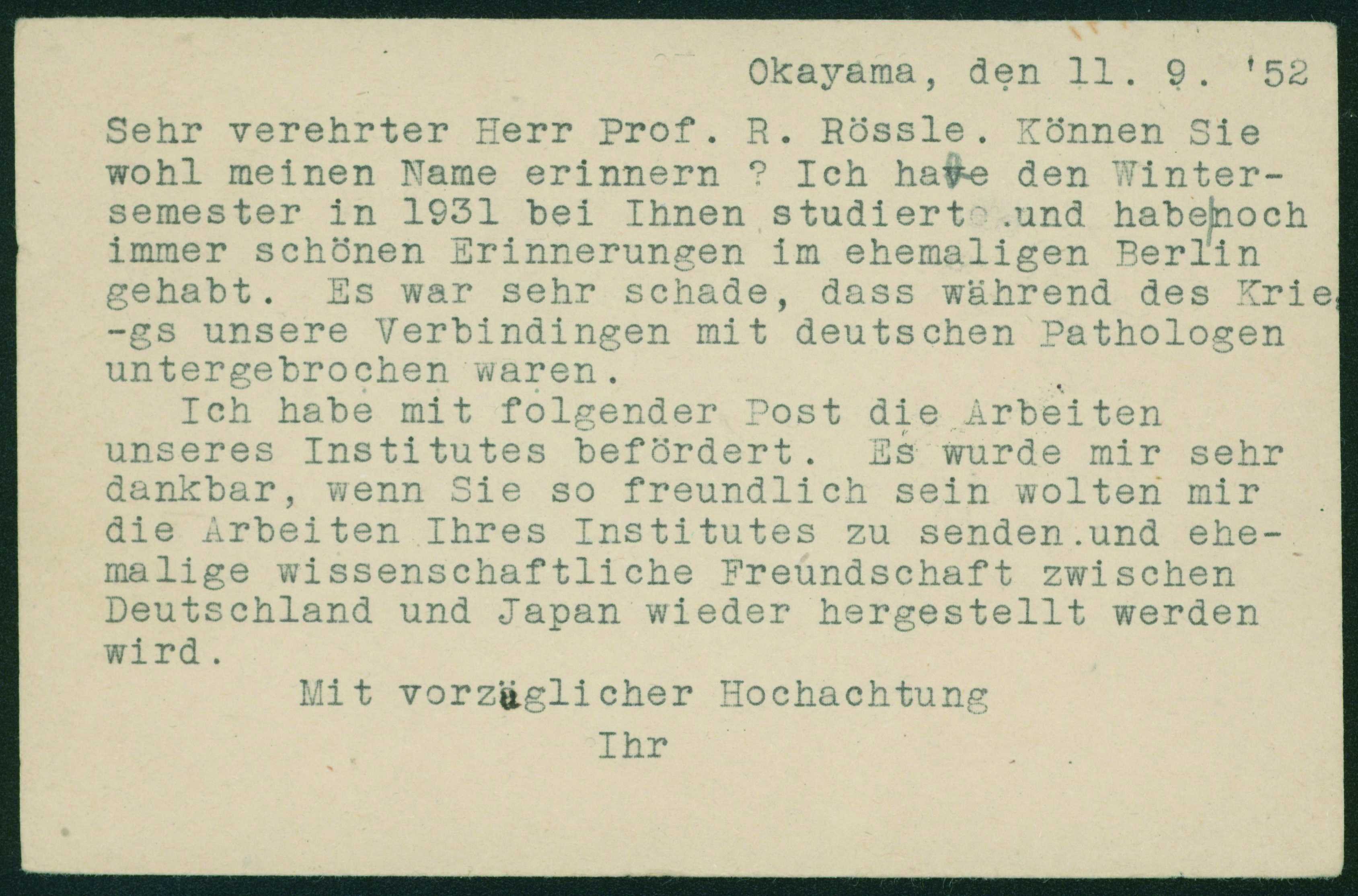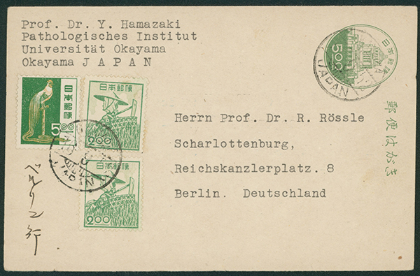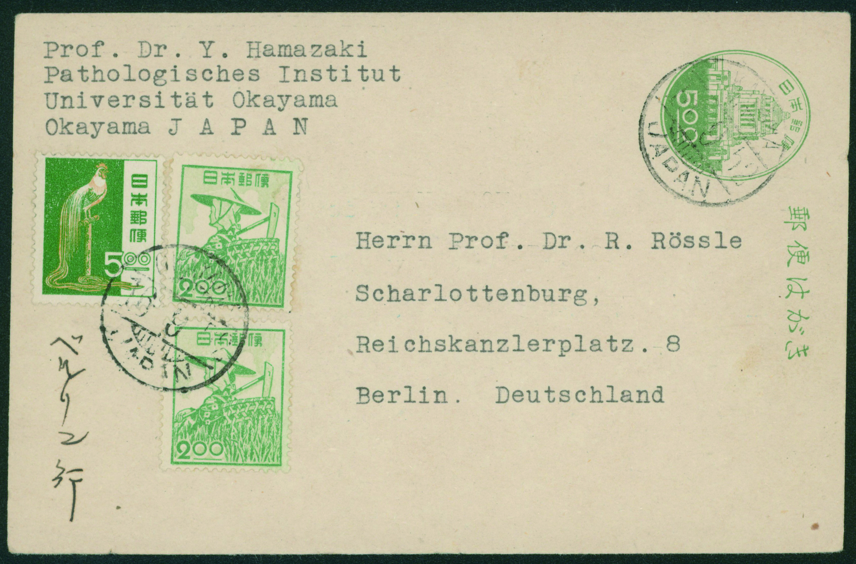 [使用例] 旧議事堂5円 , 農婦2円2枚, 尾長鶏5.00円 加貼 欧文櫛型印 1952-09-16 OKAYAMA→ドイツ 「戦後の欧文櫛型印(神宝浩)」によれば、OKAYAMAの欧文櫛型印の収集難易度は5段階の内、上から3番目の「3(やや難しい)」 外信船便葉書