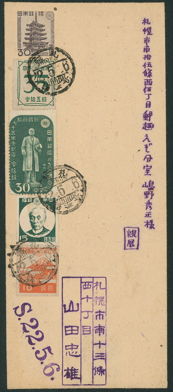 [使用例] 切手付き封筒30銭, 郵便創始75年30銭, 富士桜10銭, 前島15銭 加貼 櫛型印(右書き) 昭和22 5 6 札幌 書状