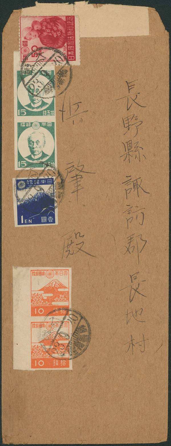カテゴリー:戦後記念(銭位)カバー 1947 Commemorative stamp 50 Sen, 1945-1946 issue 10 Sen orange, 1946-1947 issue 15 Sen, 1 Yen blue cancelled by comb cds 1948-09-20 Oiso最低値: 5,000 円