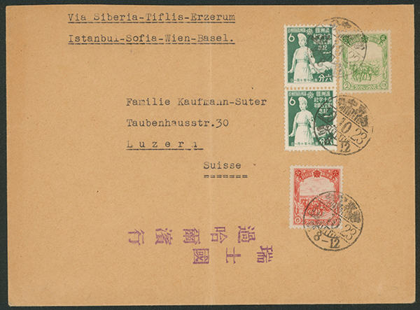 [使用例] 赤十字5周年6分ペア, 第4次普通2分, 6分 櫛型印 康徳10 10 23 新京中央→イスタンブール→スイス 戦時極東-欧州間逓送経路記載「シベリア-チフリス-エルズラム-イスタンブール-ソフィア-ウィーン」 カバー中折れ
